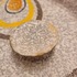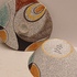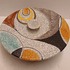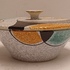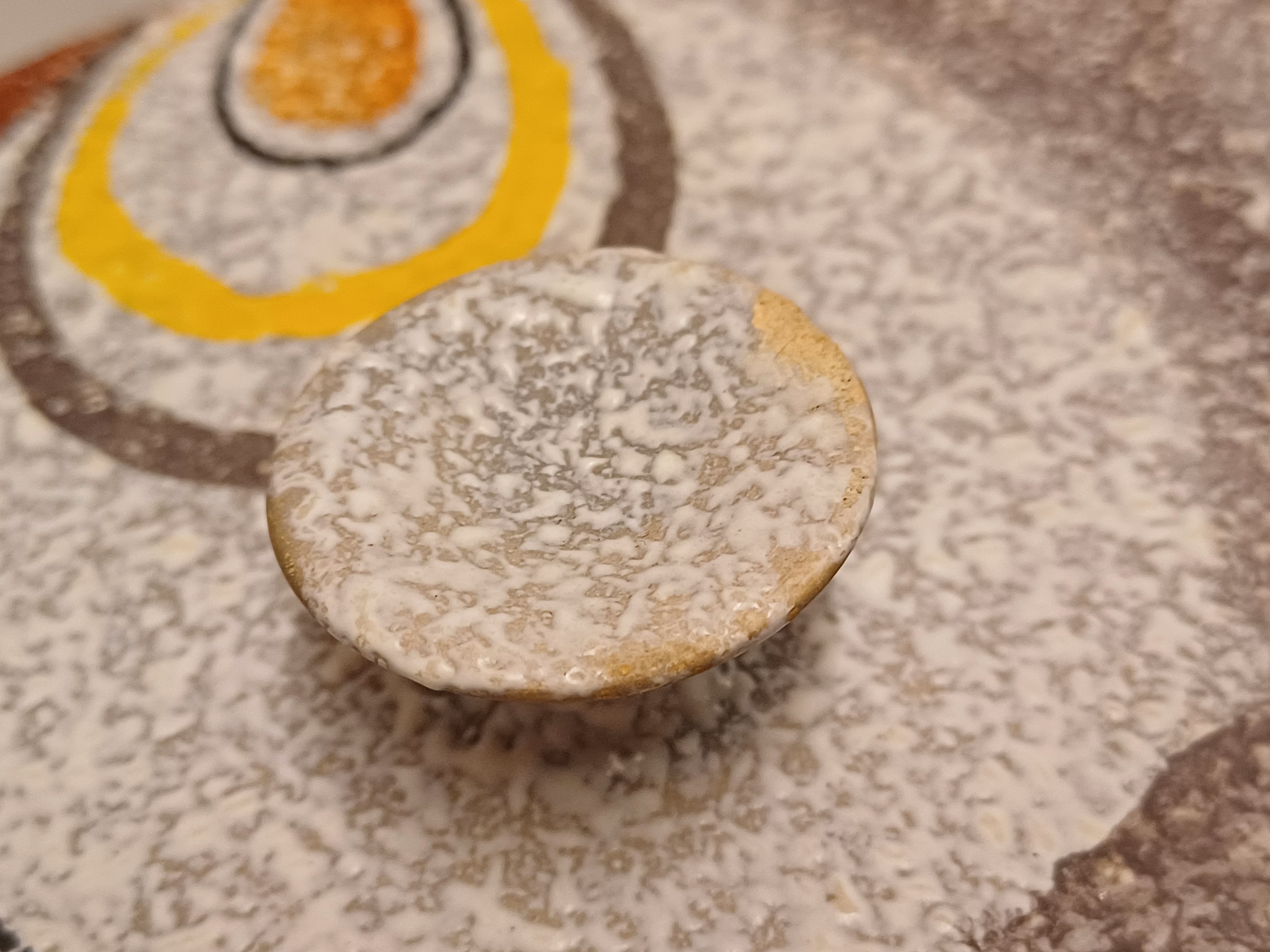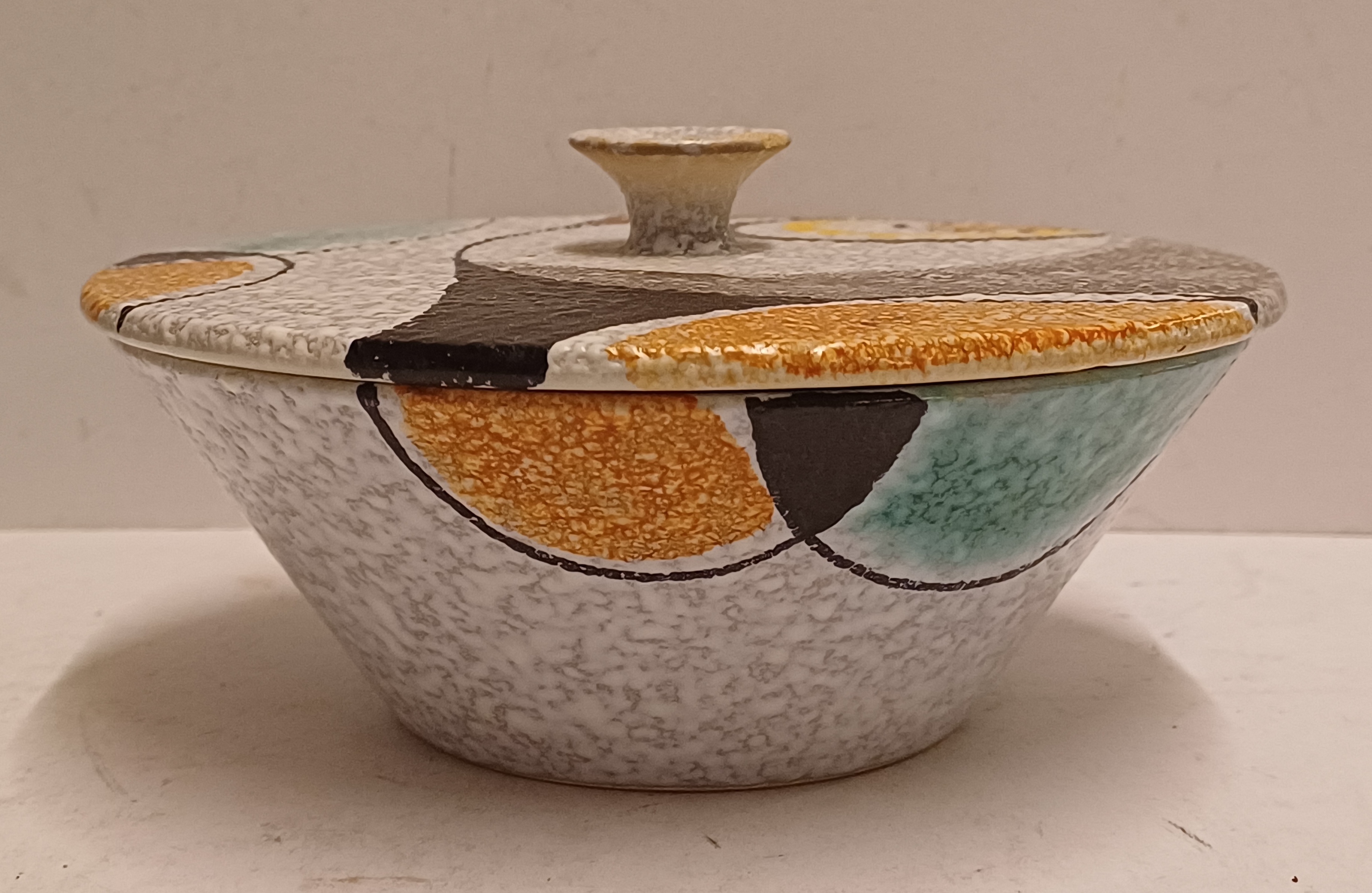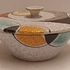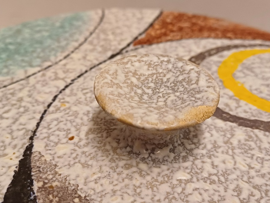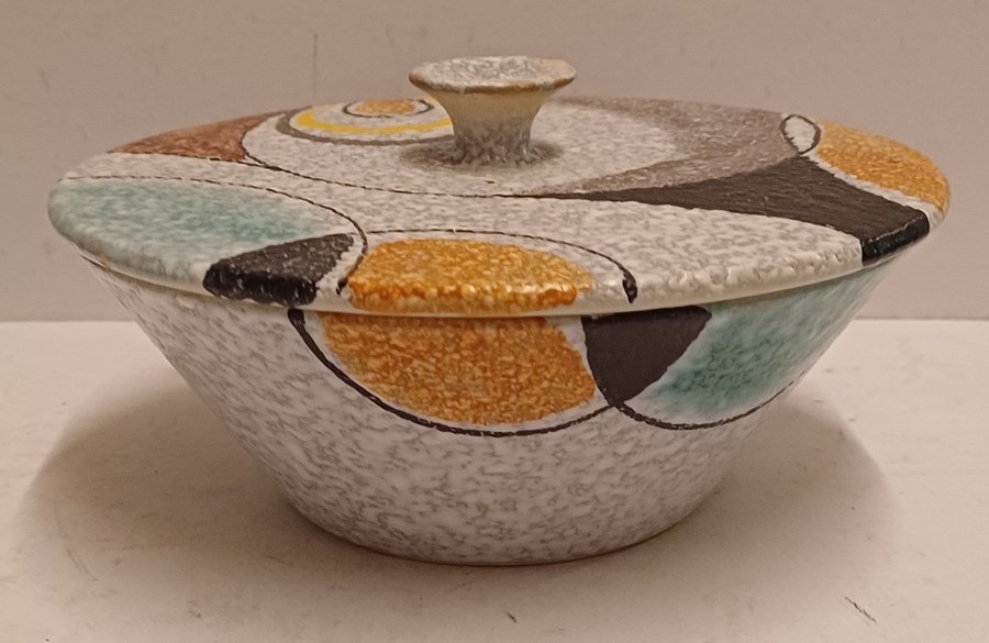 Platelen dekseldoos met decor Rumba op grijs fond. Onderzijde met fabrieksmerk en modelnummer.