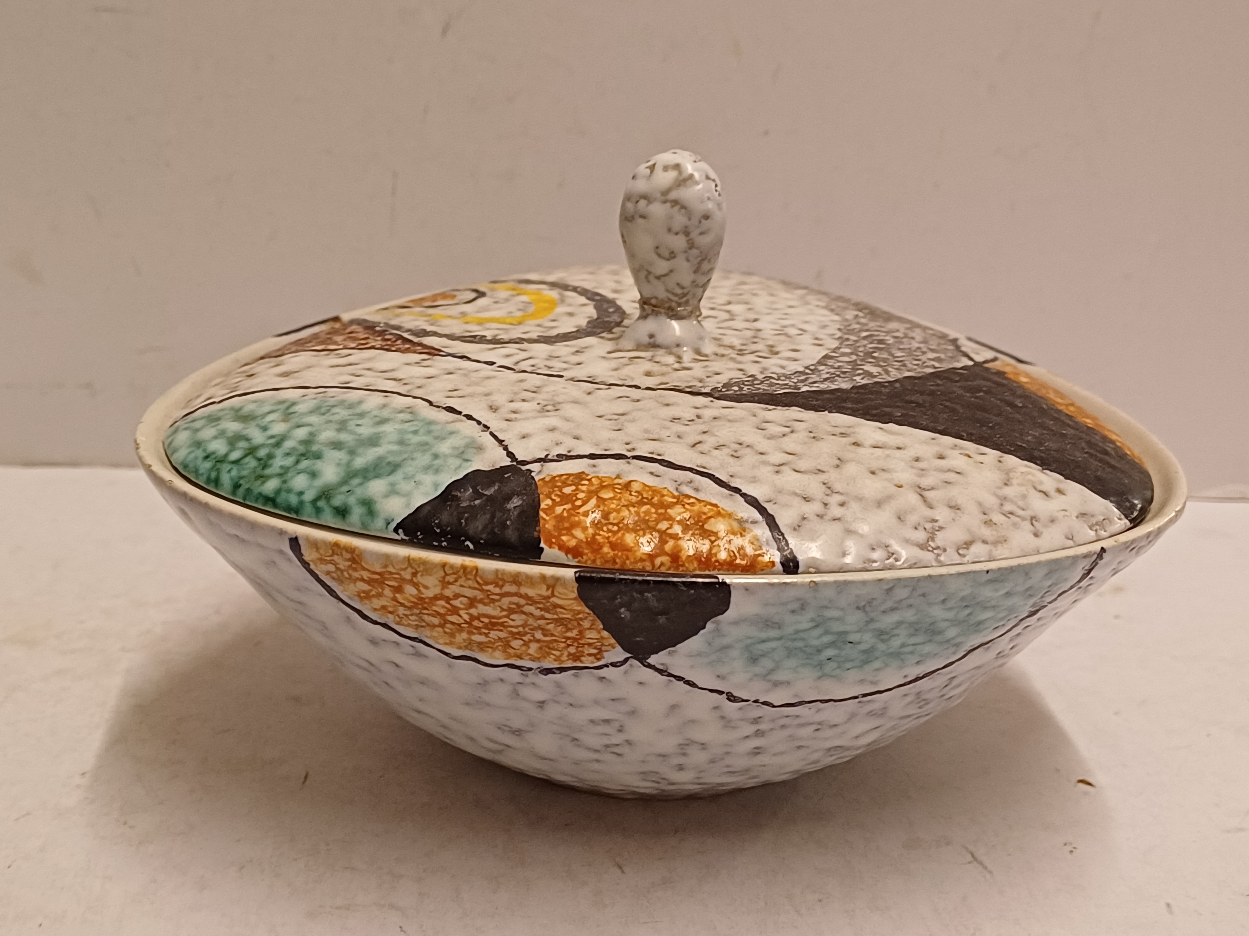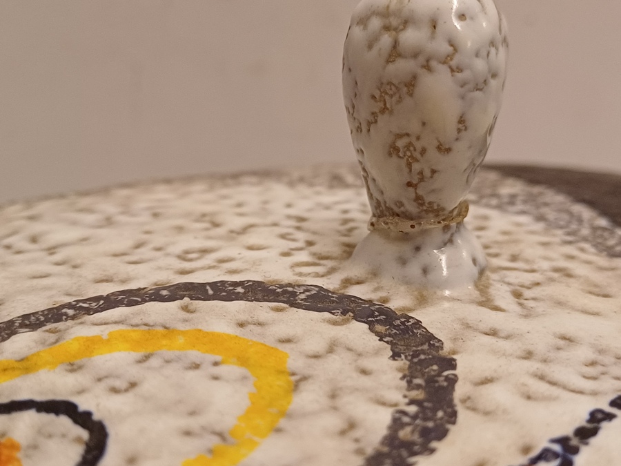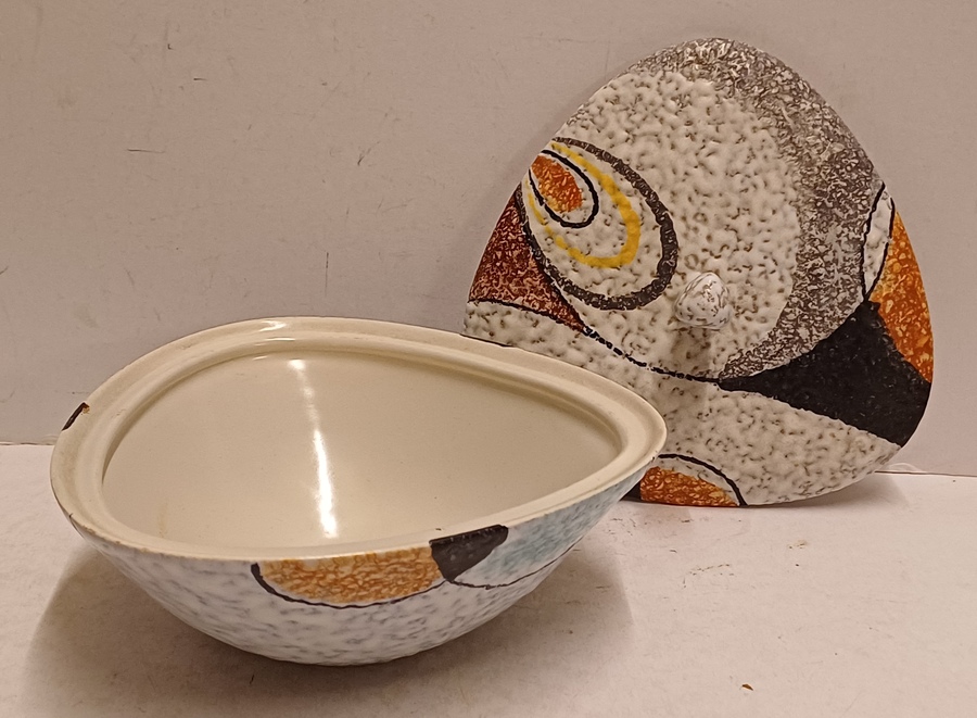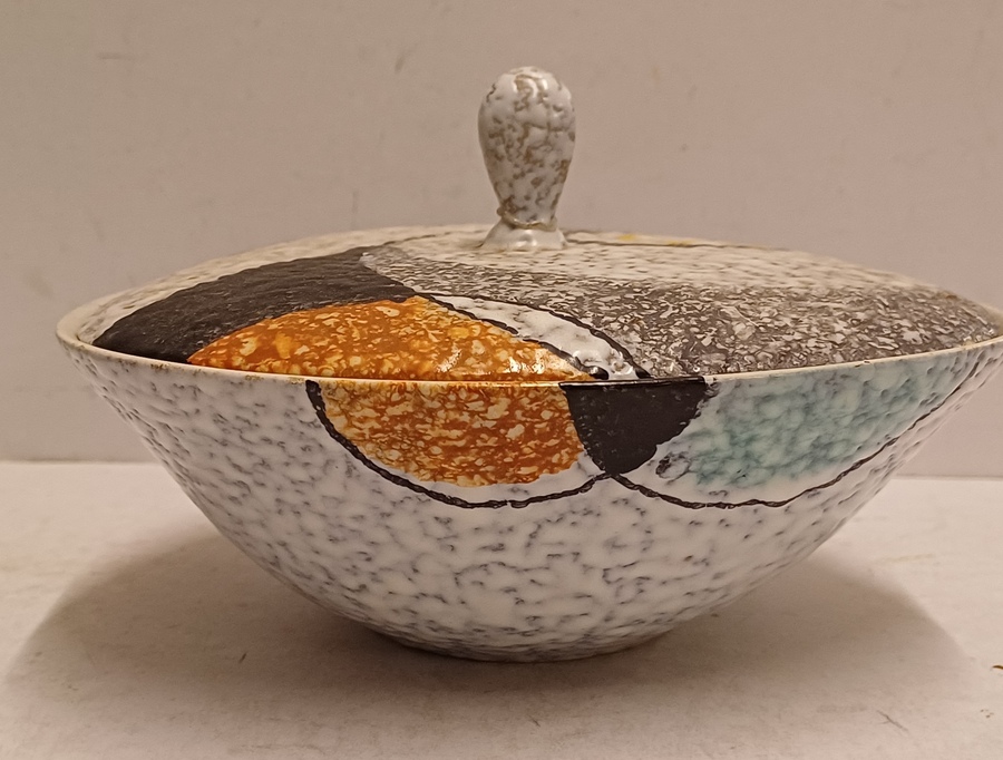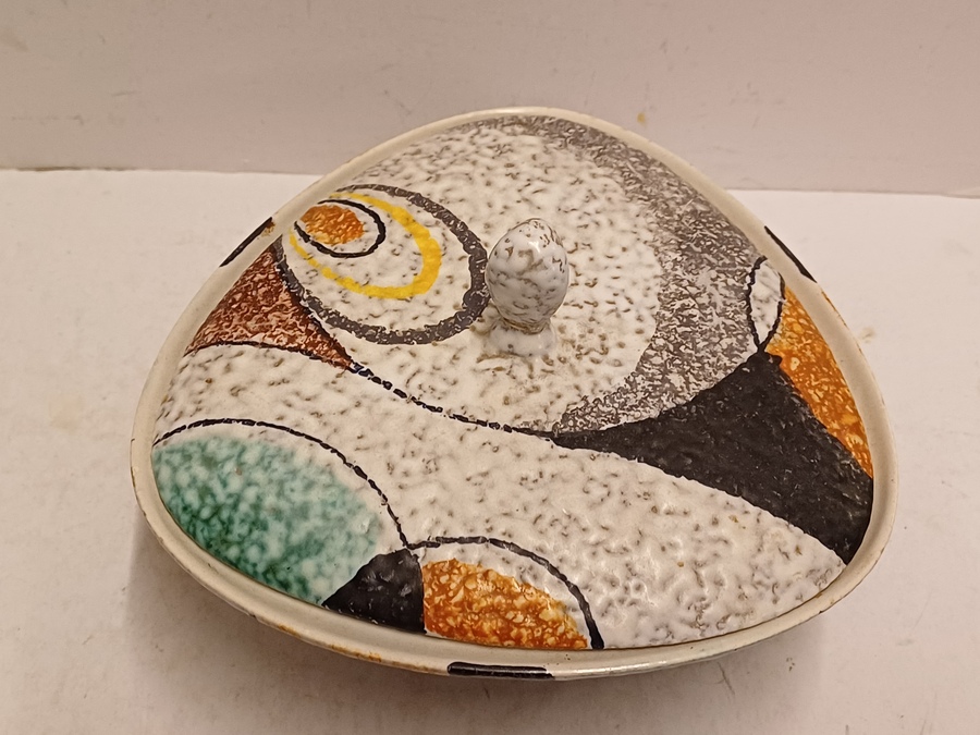 Platelen dekseldoos met decor Rumba op grijs fond. Onderzijde met fabrieksmerk en modelnummer.