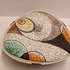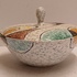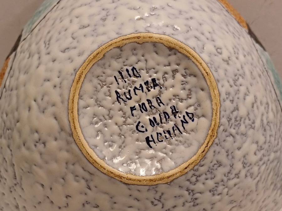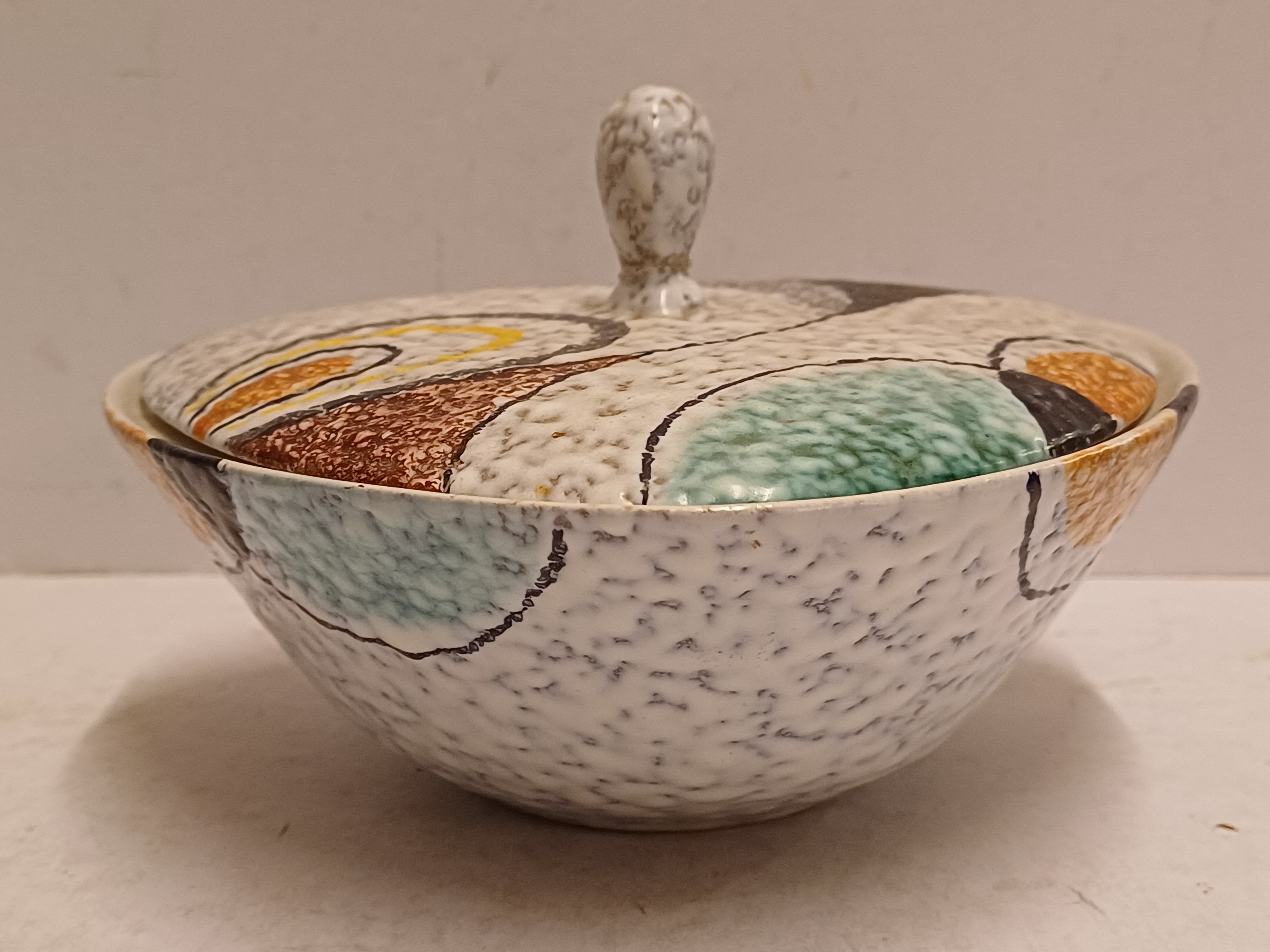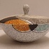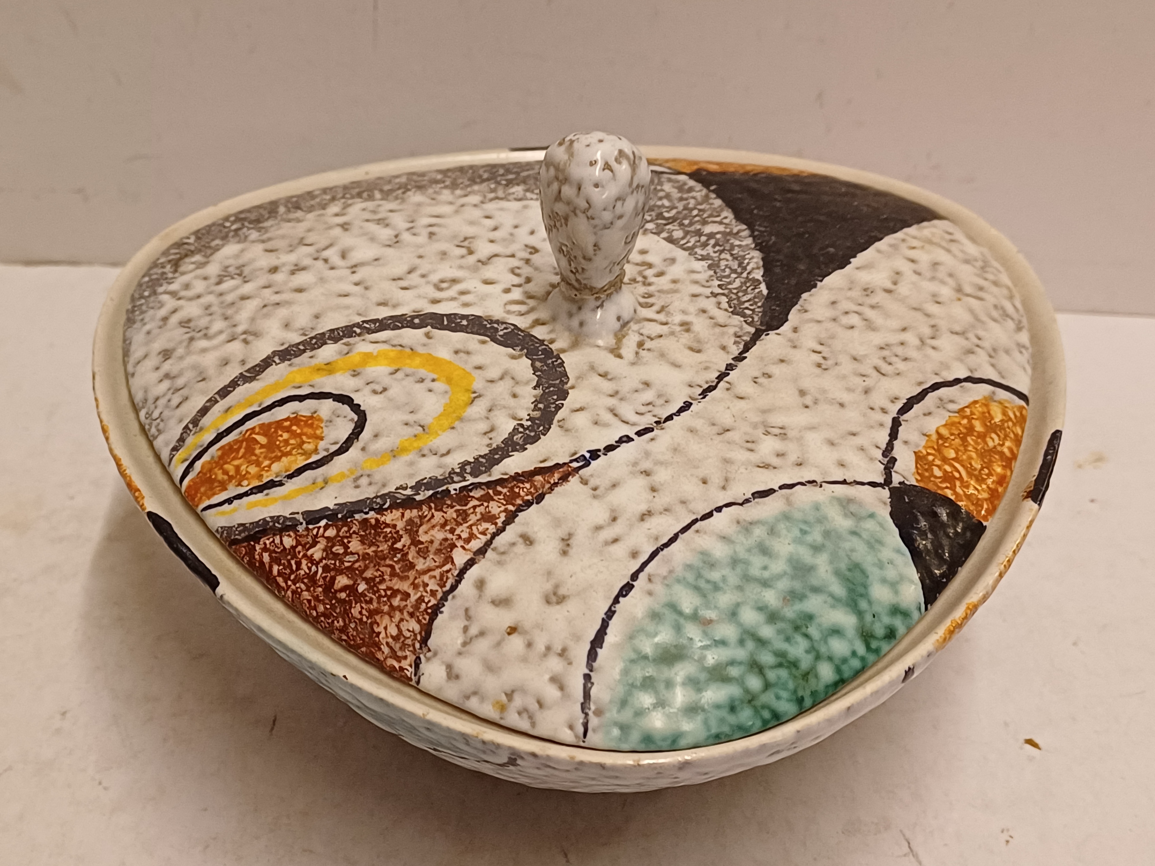 Platelen dekseldoos met decor Rumba op grijs fond. Onderzijde met fabrieksmerk en modelnummer.