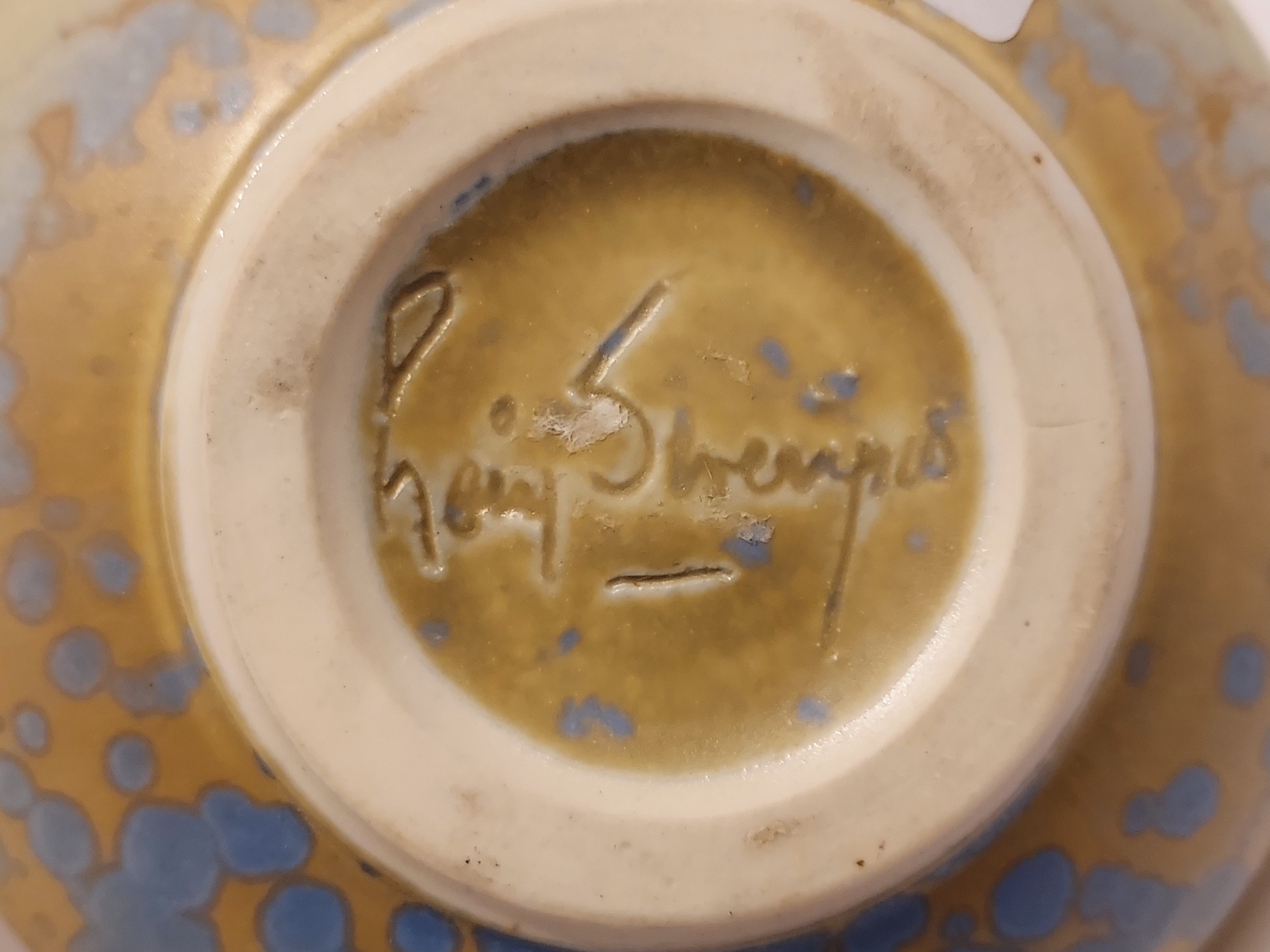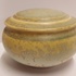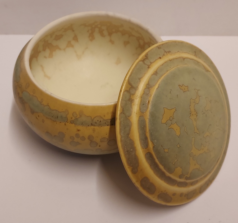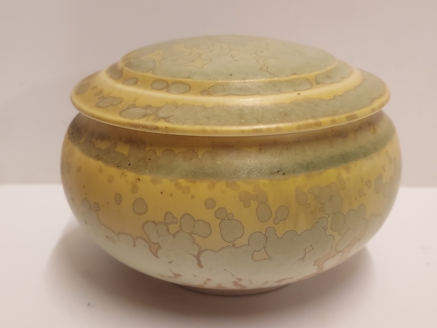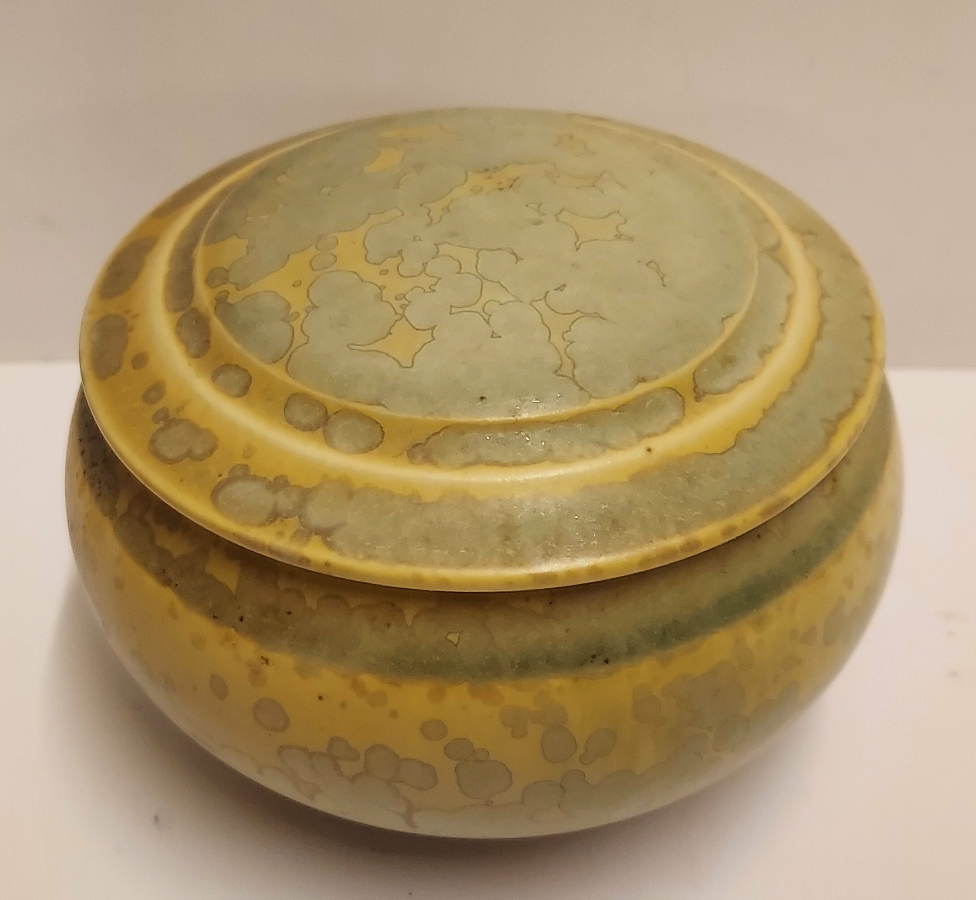 Boîte à couvercle en porcelaine avec glaçure cristalline. Signée sur le dessous.