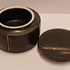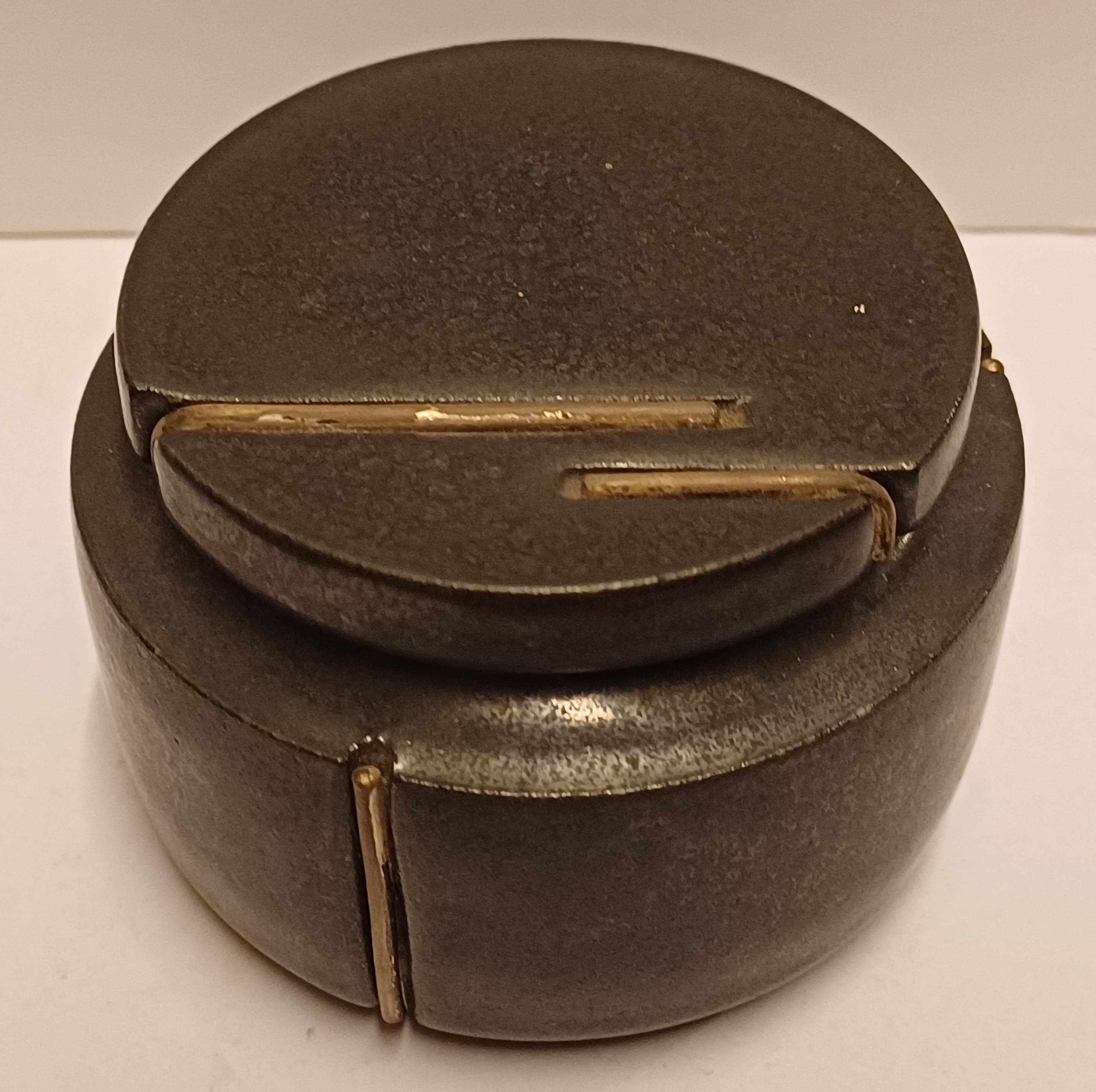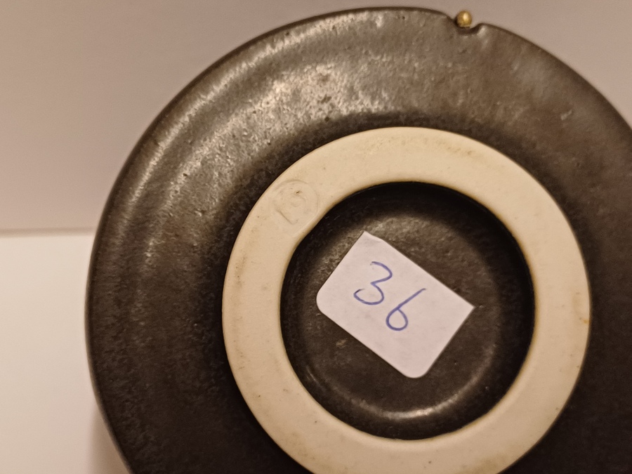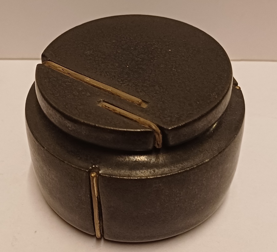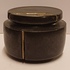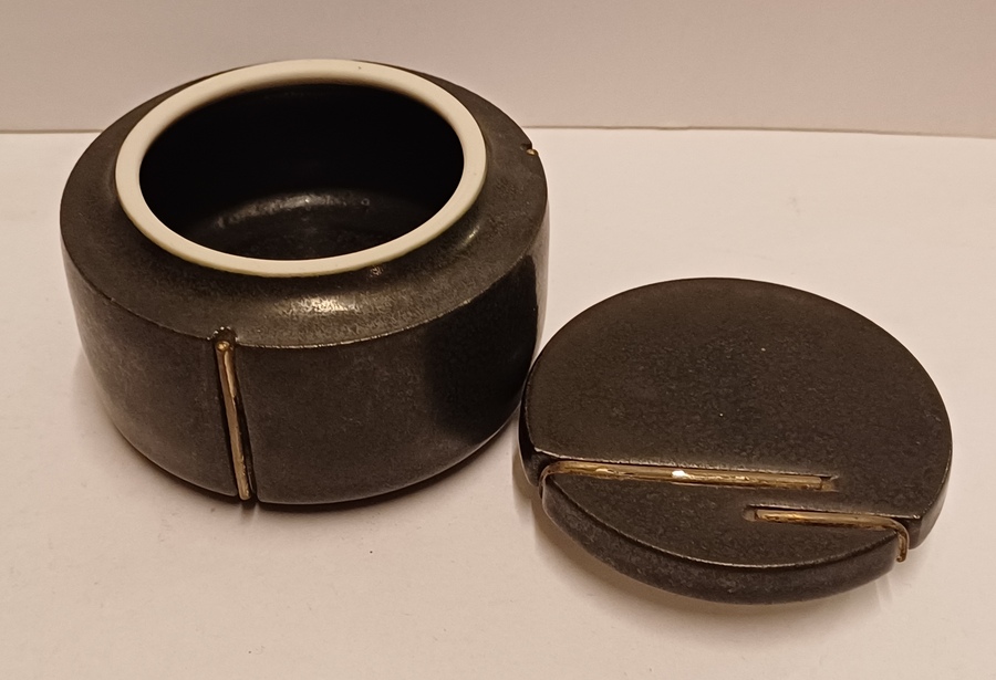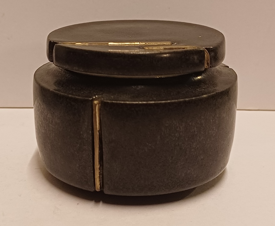 Zwart geglazuurd dekseldoosje met insnijdingen. Onderzijde met kunstenaars monogram.