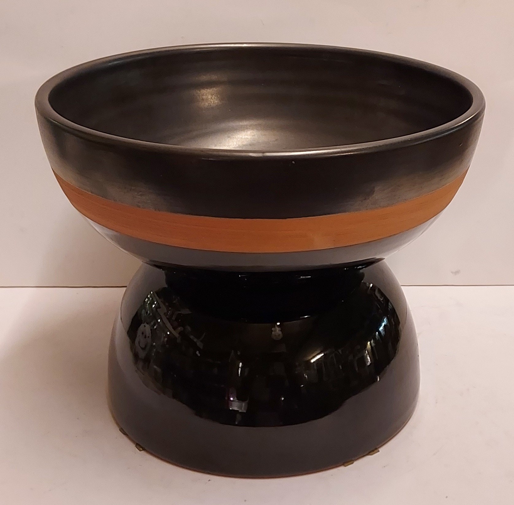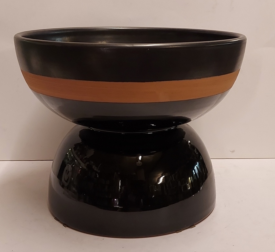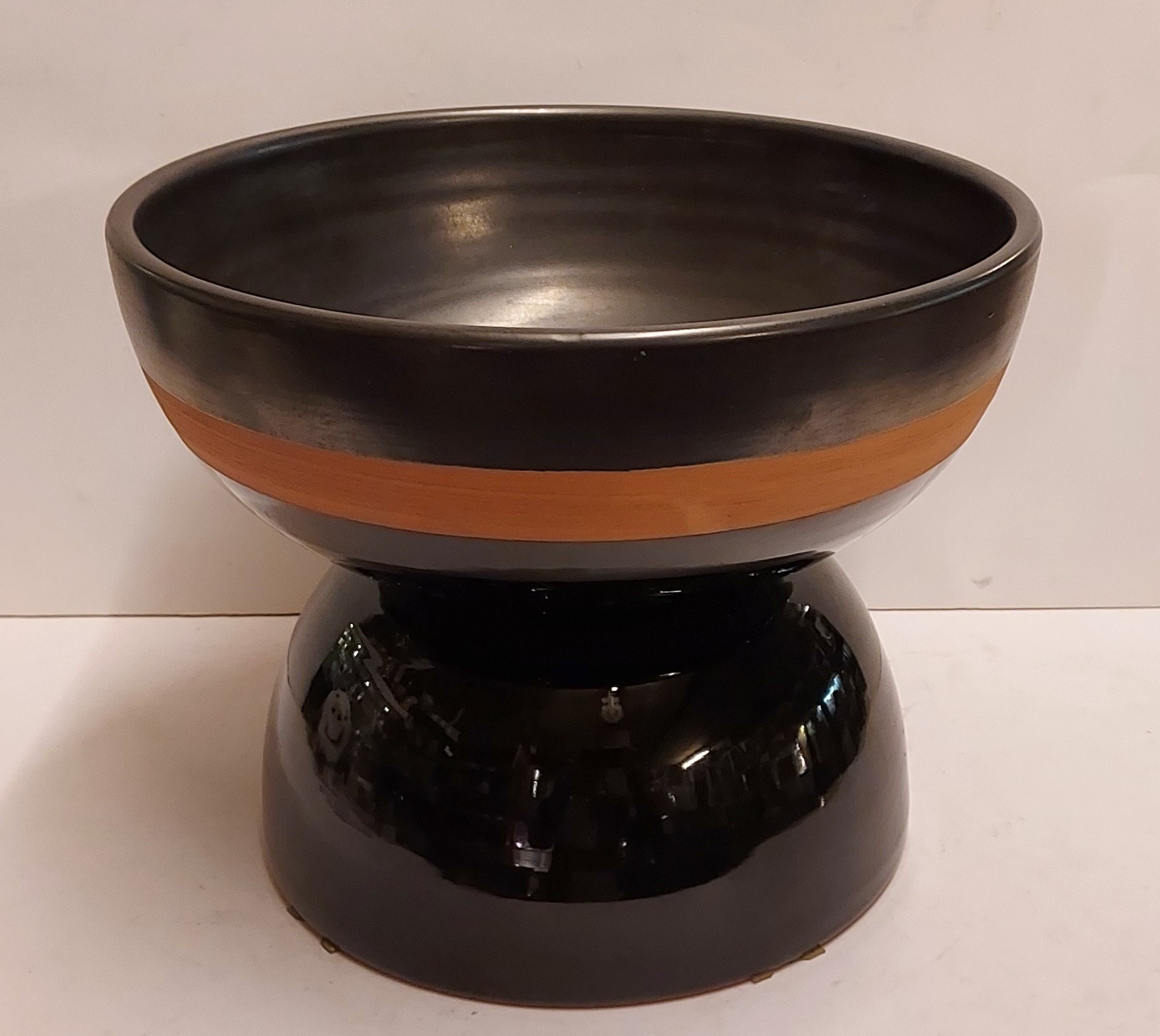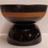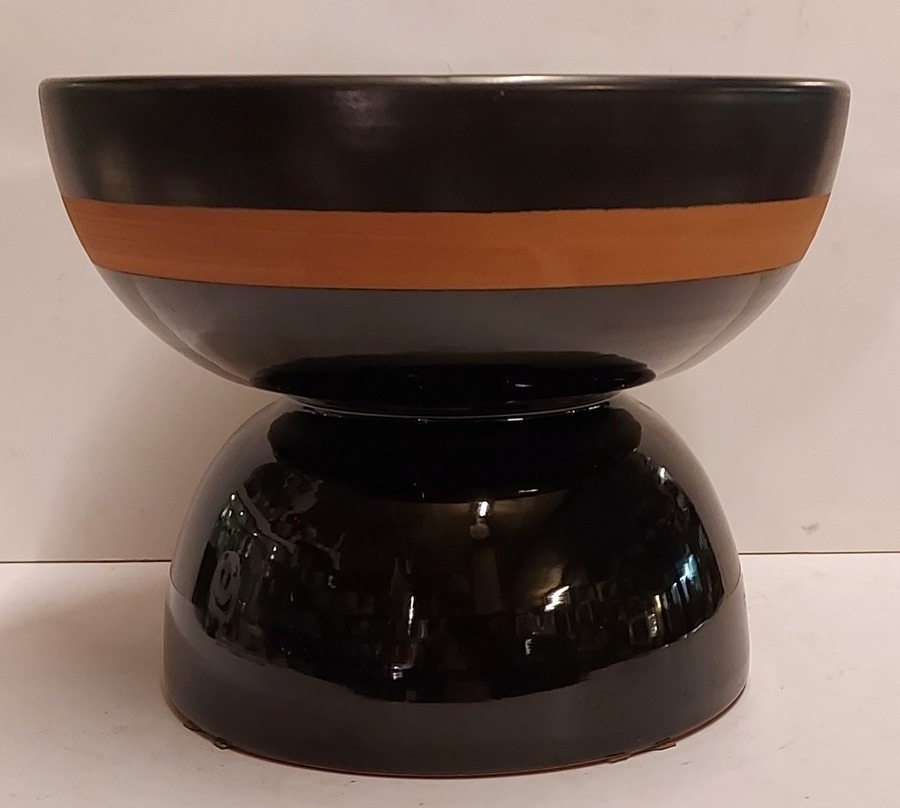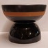 Coupe à fruits en forme de diabolo, avec une face inférieure brillante et une face supérieure en glaçure mate avec un bord marron. Signature complète sur le dessous. Réalisée par Bitossi Italy.