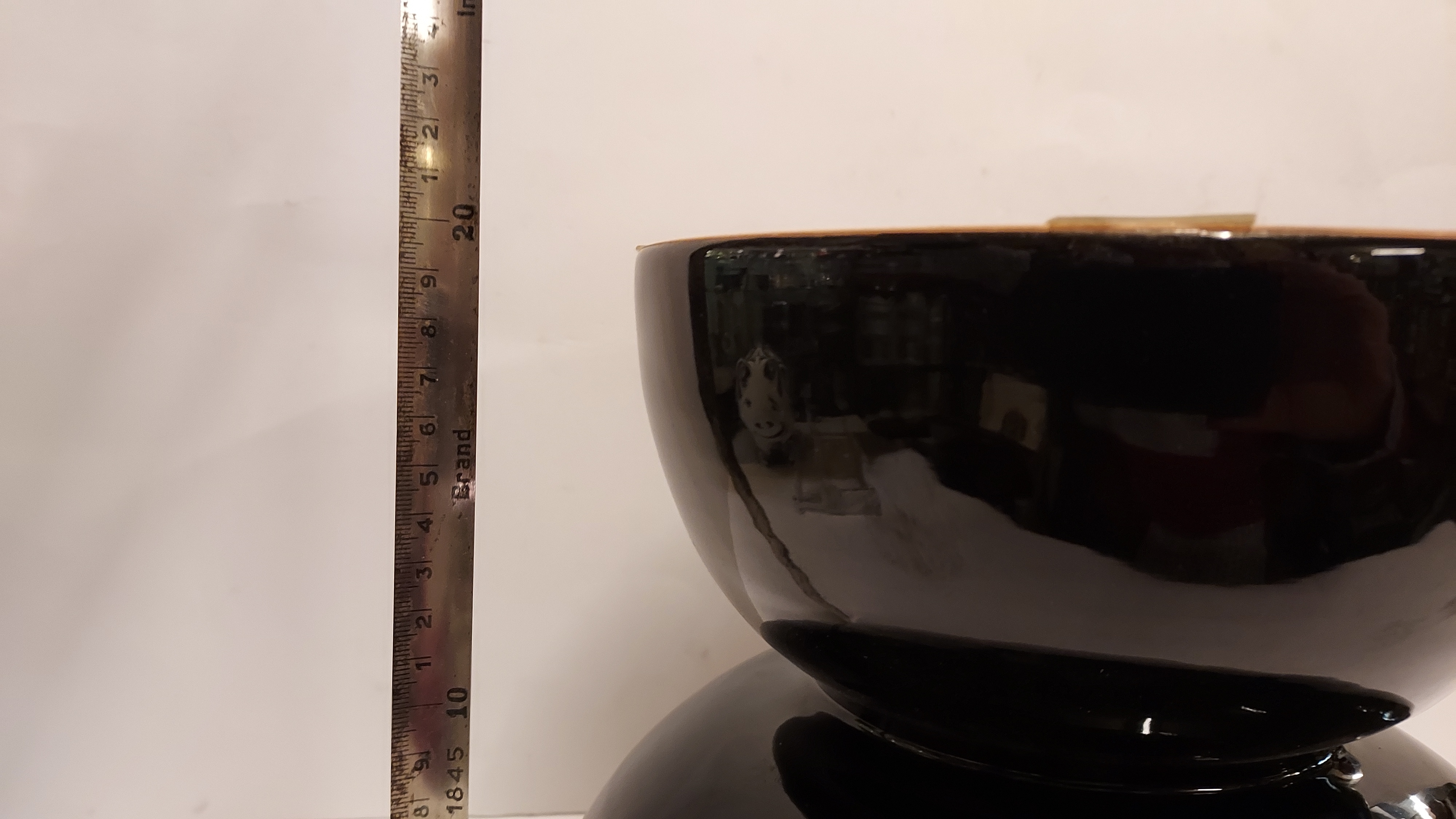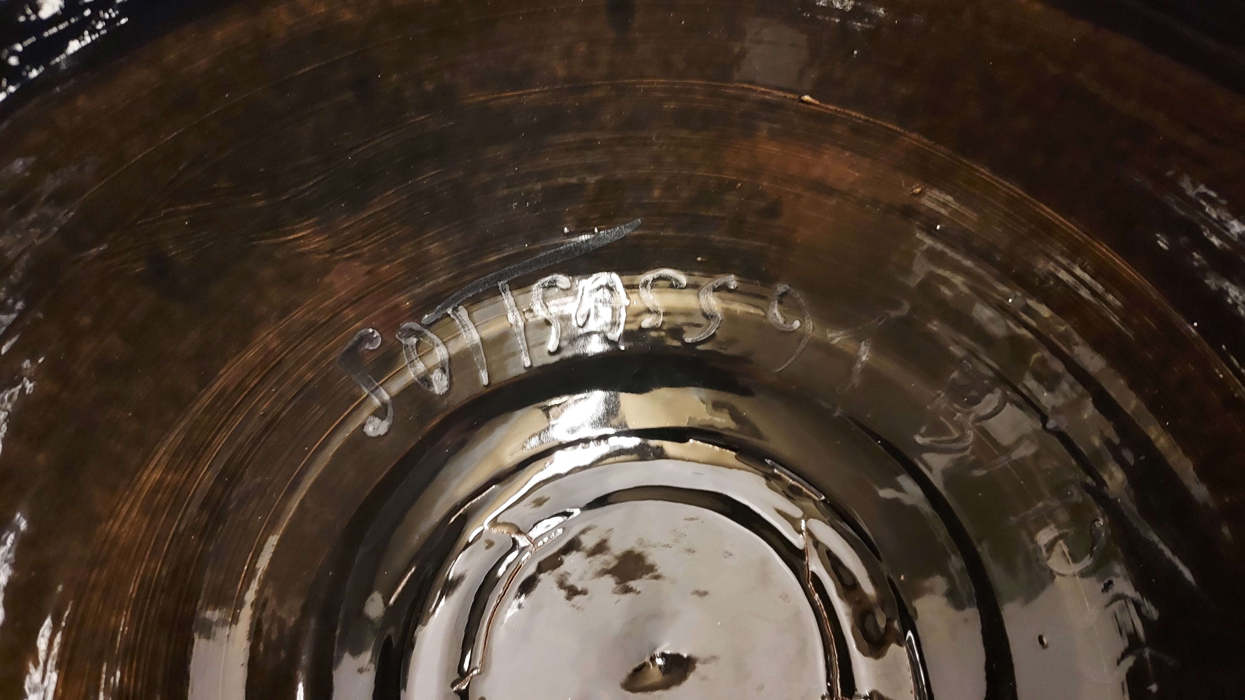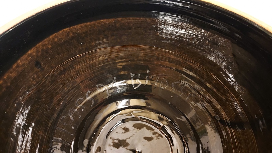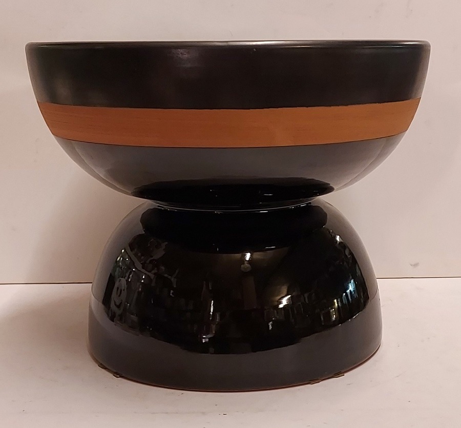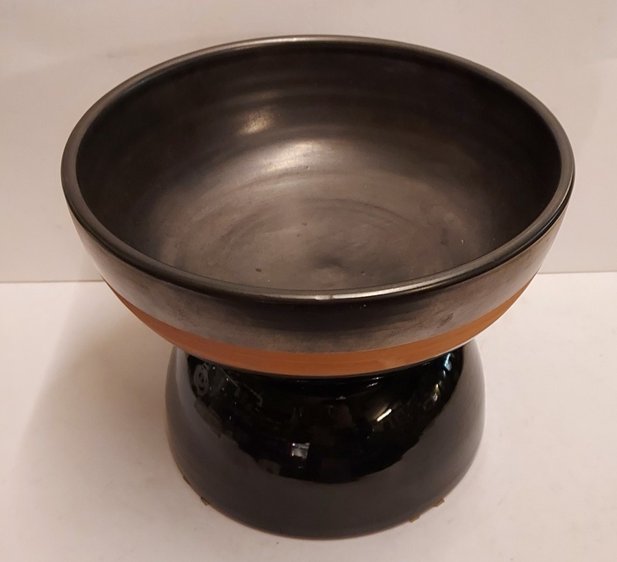 Coupe à fruits en forme de diabolo, avec une face inférieure brillante et une face supérieure en glaçure mate avec un bord marron. Signature complète sur le dessous. Réalisée par Bitossi Italy.