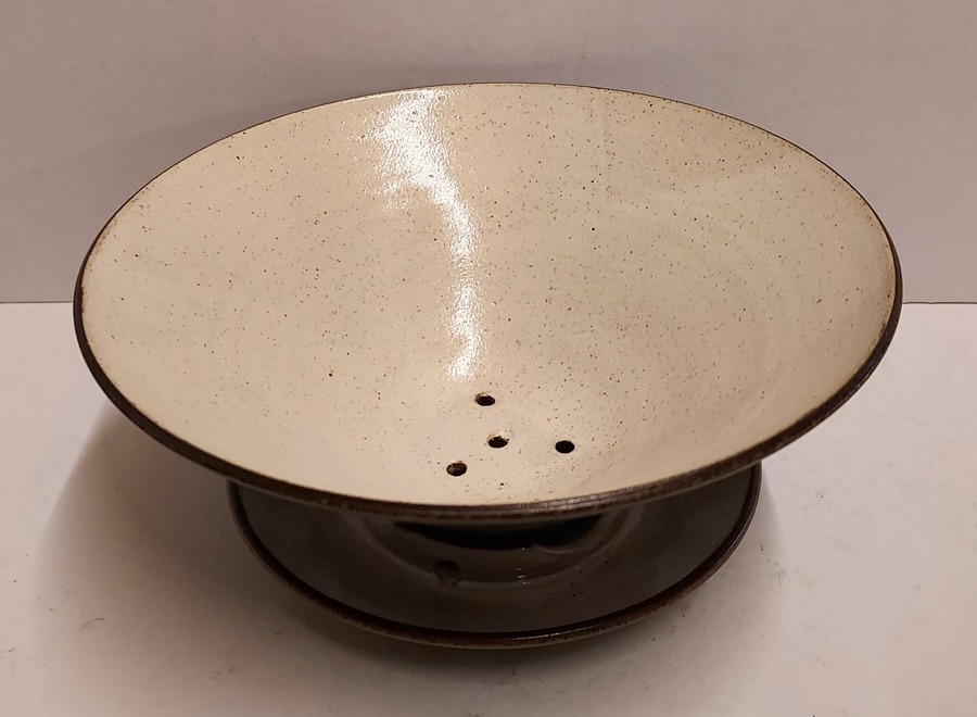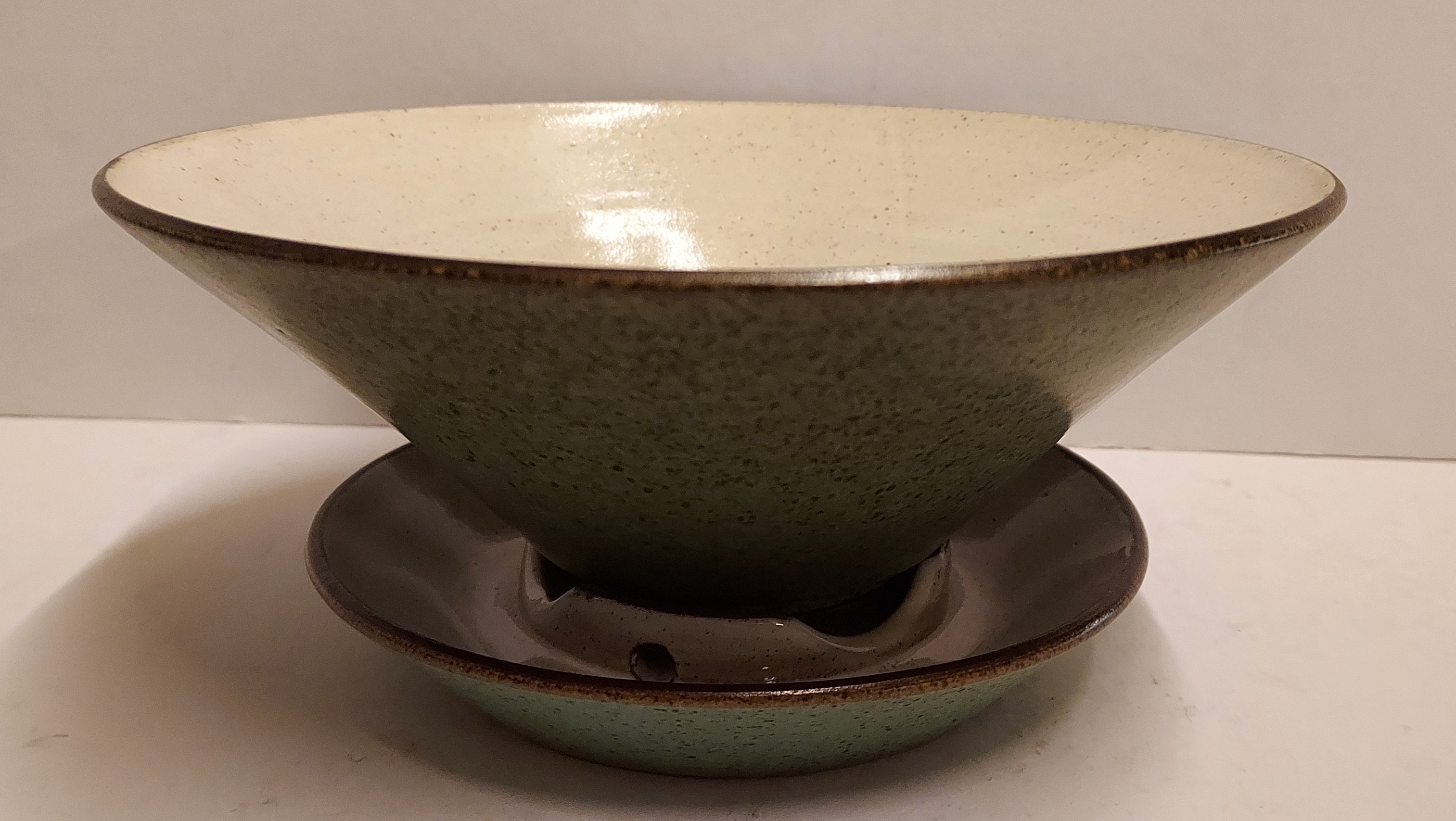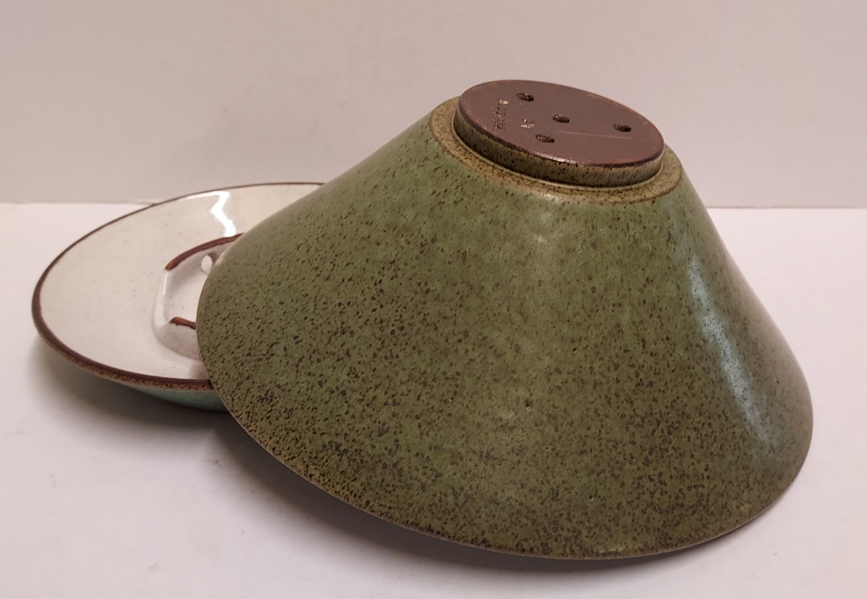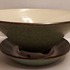 Test de fruits vernissé vert avec soucoupe, intérieur avec glaçure de semoule. Le dessous des deux parties est marqué.