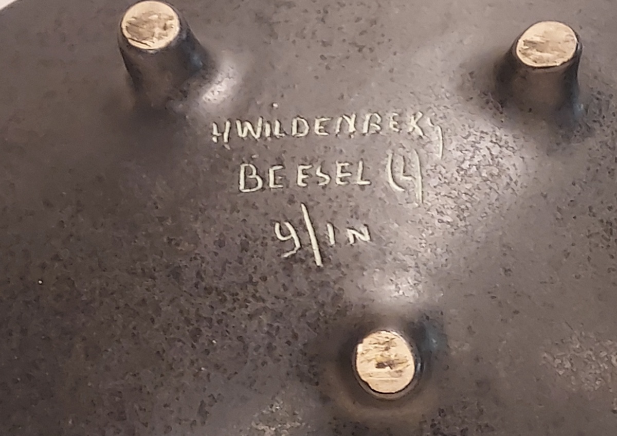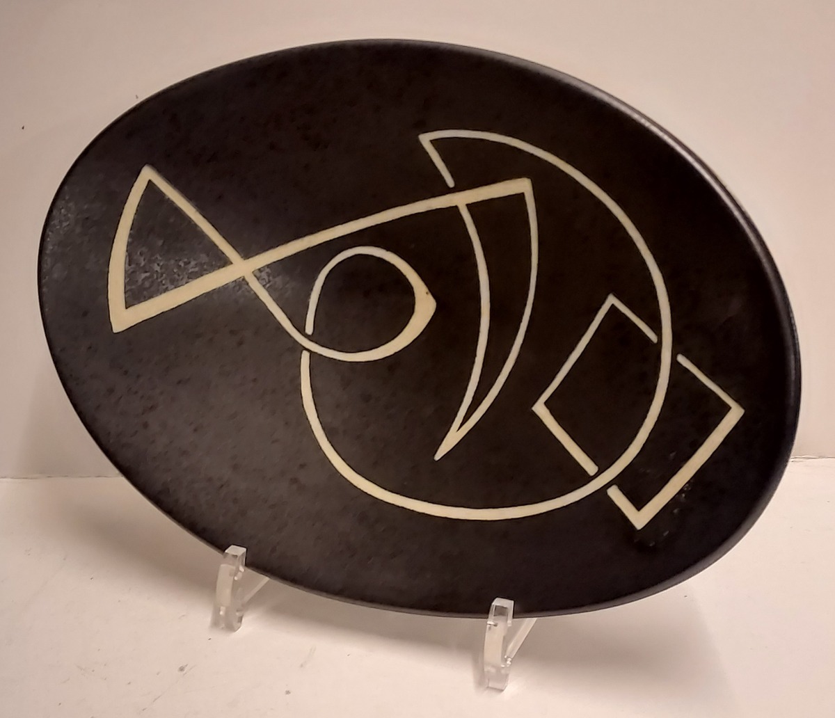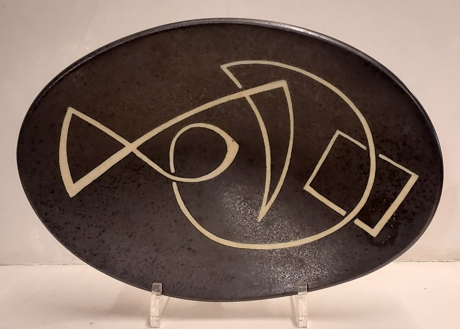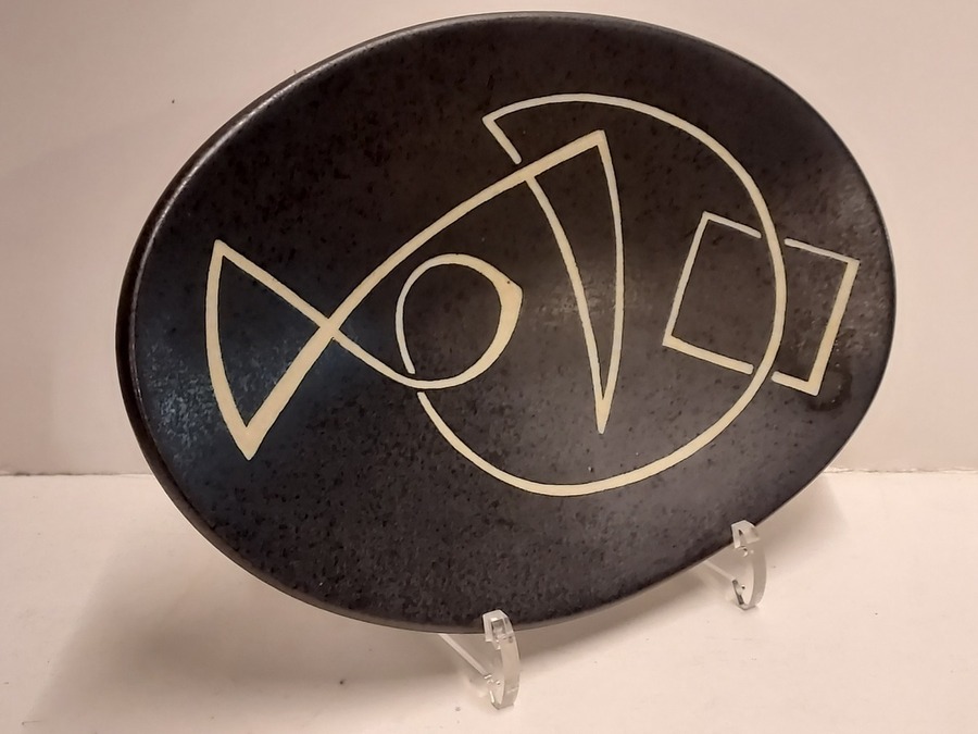 Plat ovale reposant sur trois petits pieds avec une décoration abstraite. Verso signé avec l'ajout Beesel (L)