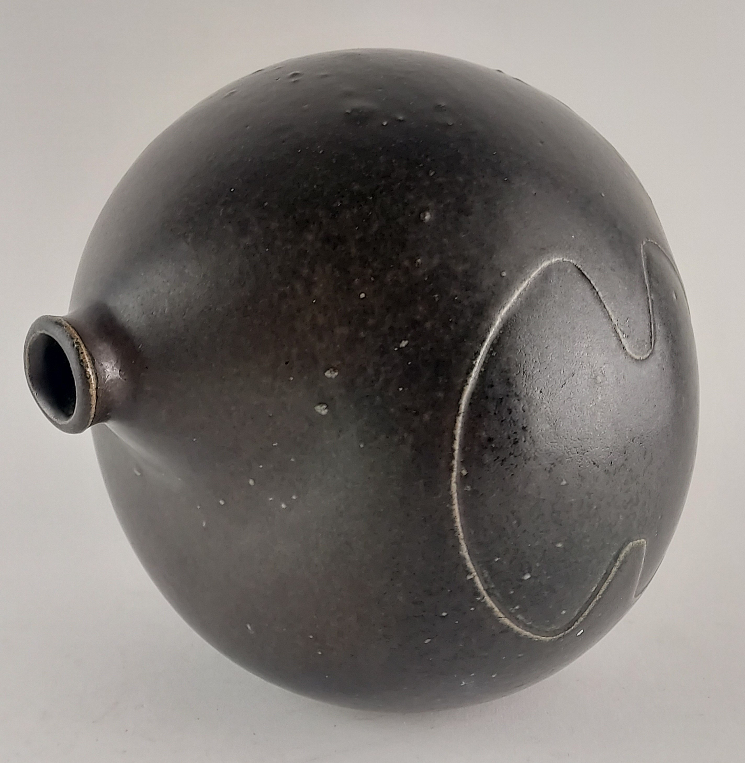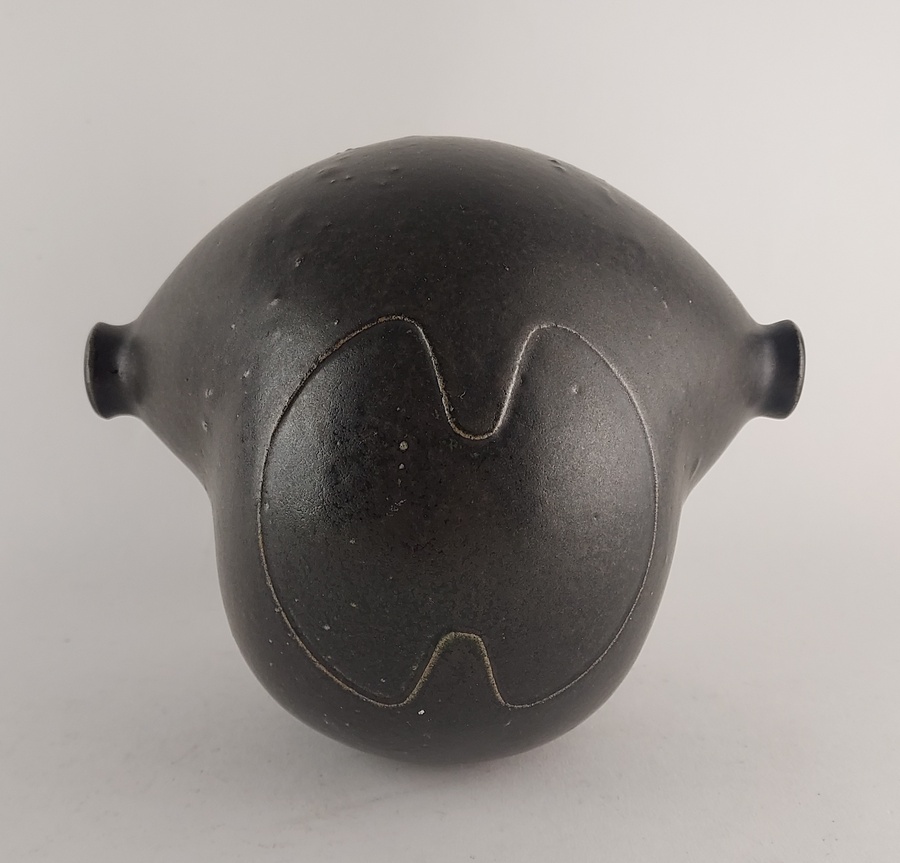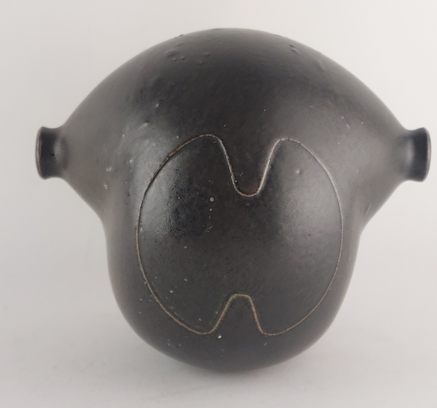 Sculpture brune avec deux ouvertures sur les côtés. Sur le ventre, un figure incisée. Base signée Hilbert.