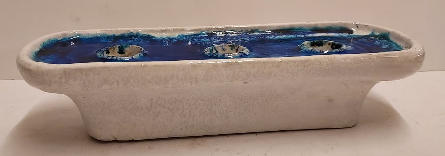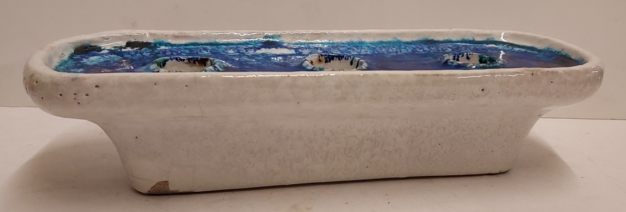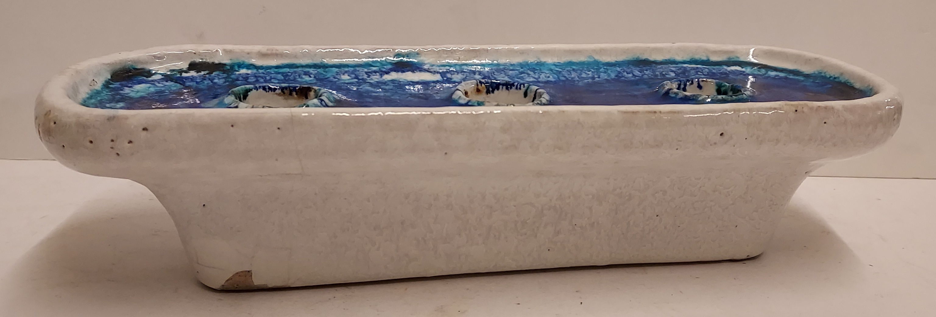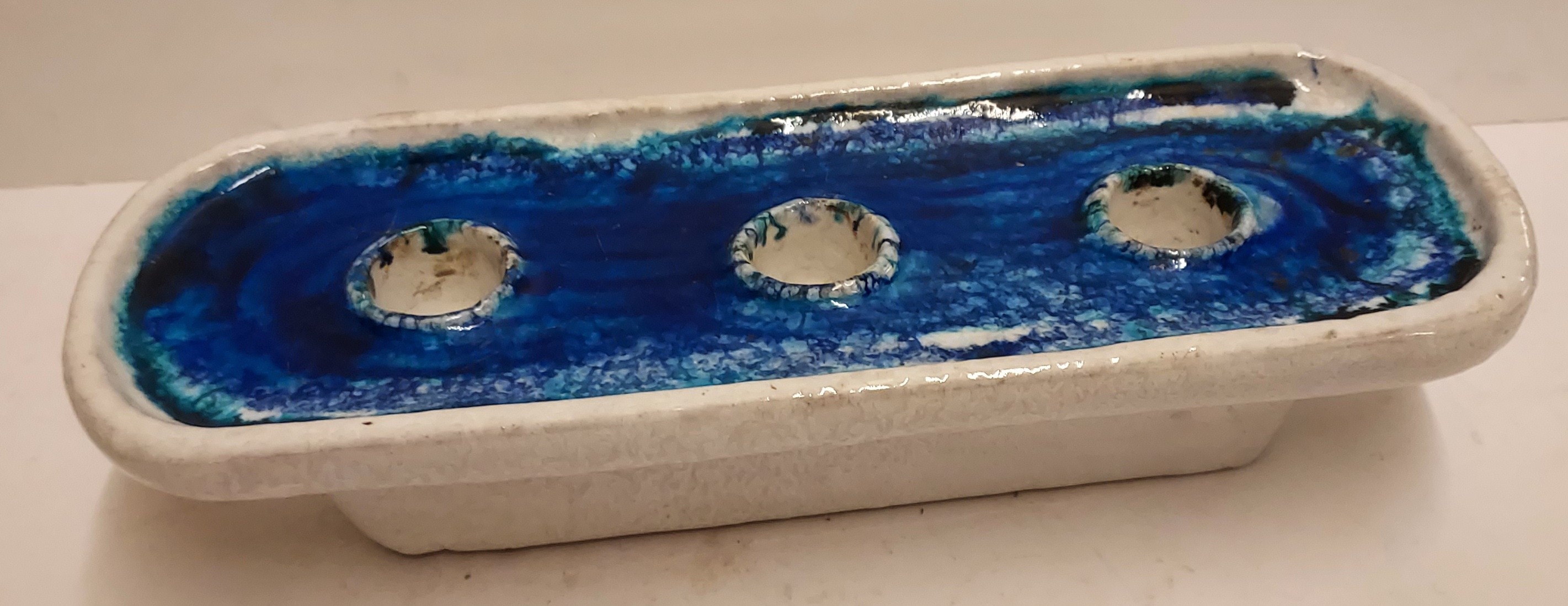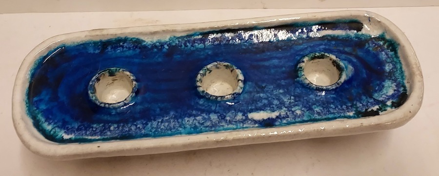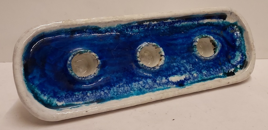 Chandelier allongé en céramique à glaçure blanche et intérieur à glaçure bleue. Base avec logo de Bijenkorf. Fabriqué pour le département des arts décoratifs de Bijenkorf. Possiblement conçu par Guido Gambone.
