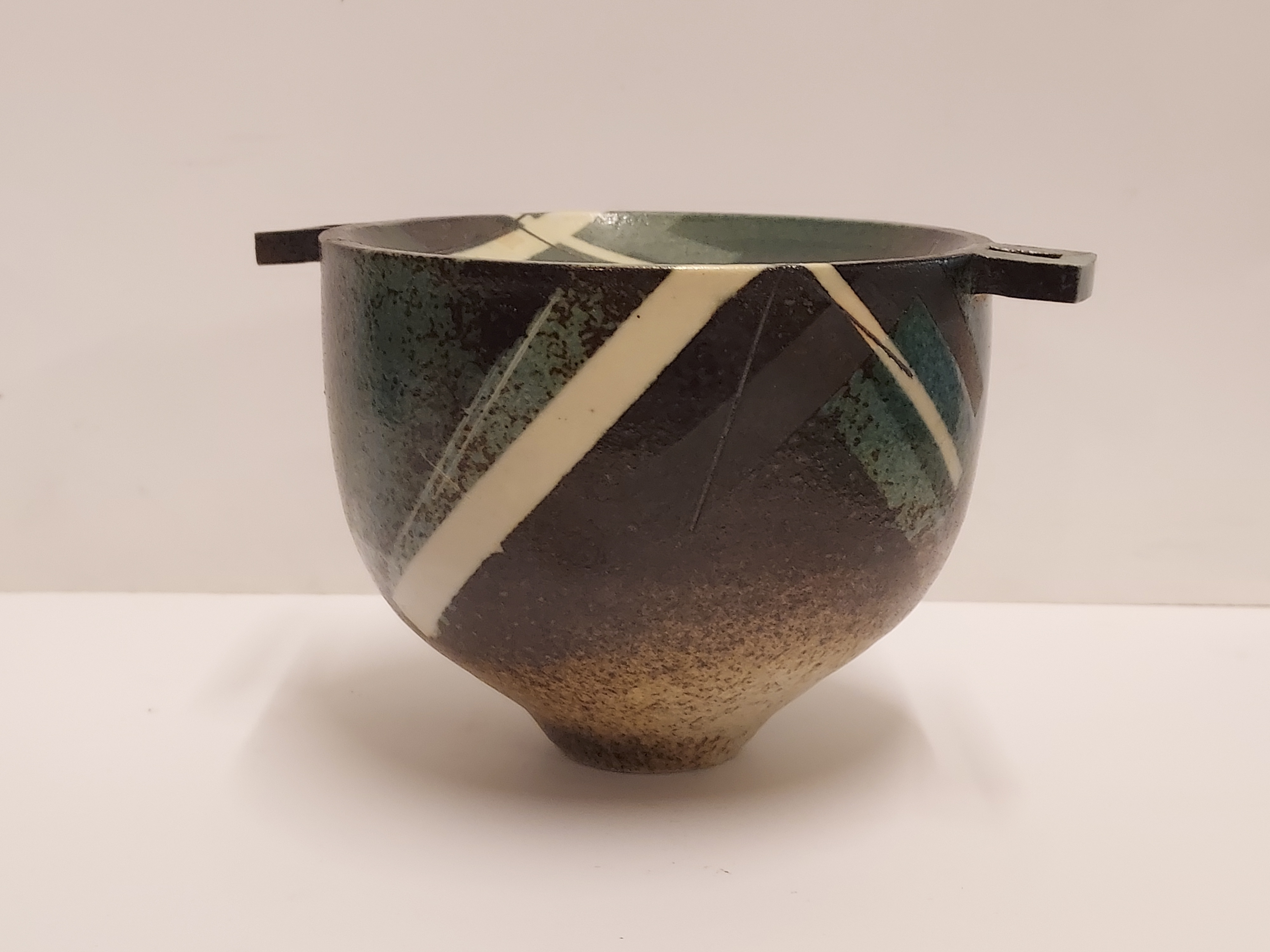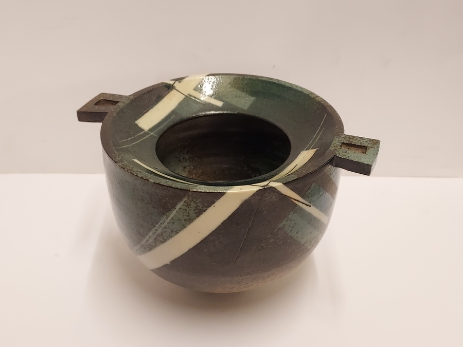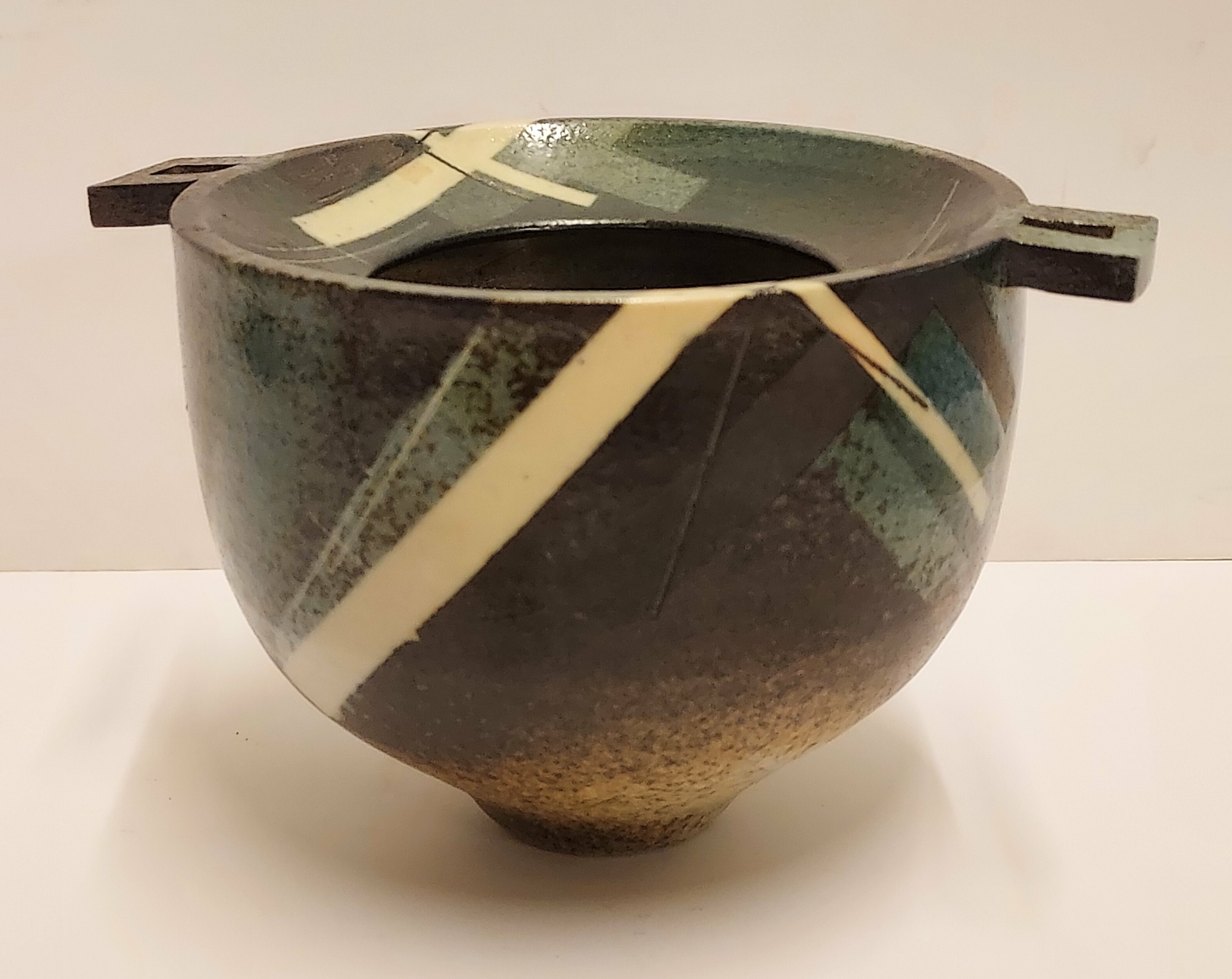 Aardewerken kom met 2 platte grepen, met geometrische decoratie op donker fond. Zijkant met kunstenaars signatuur