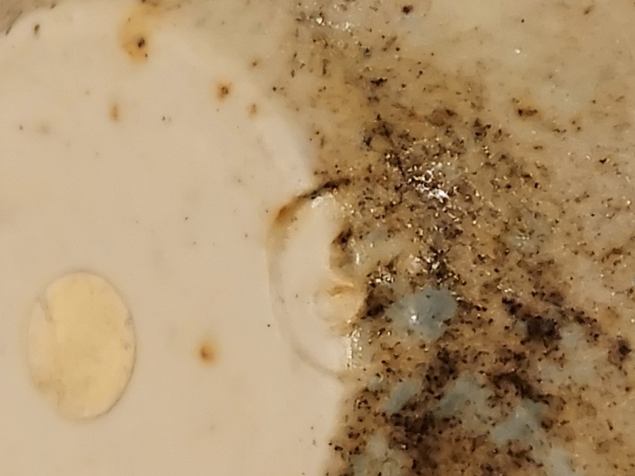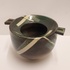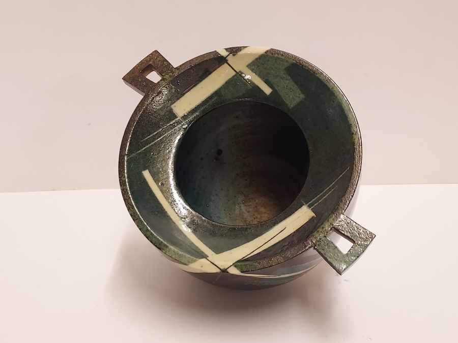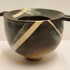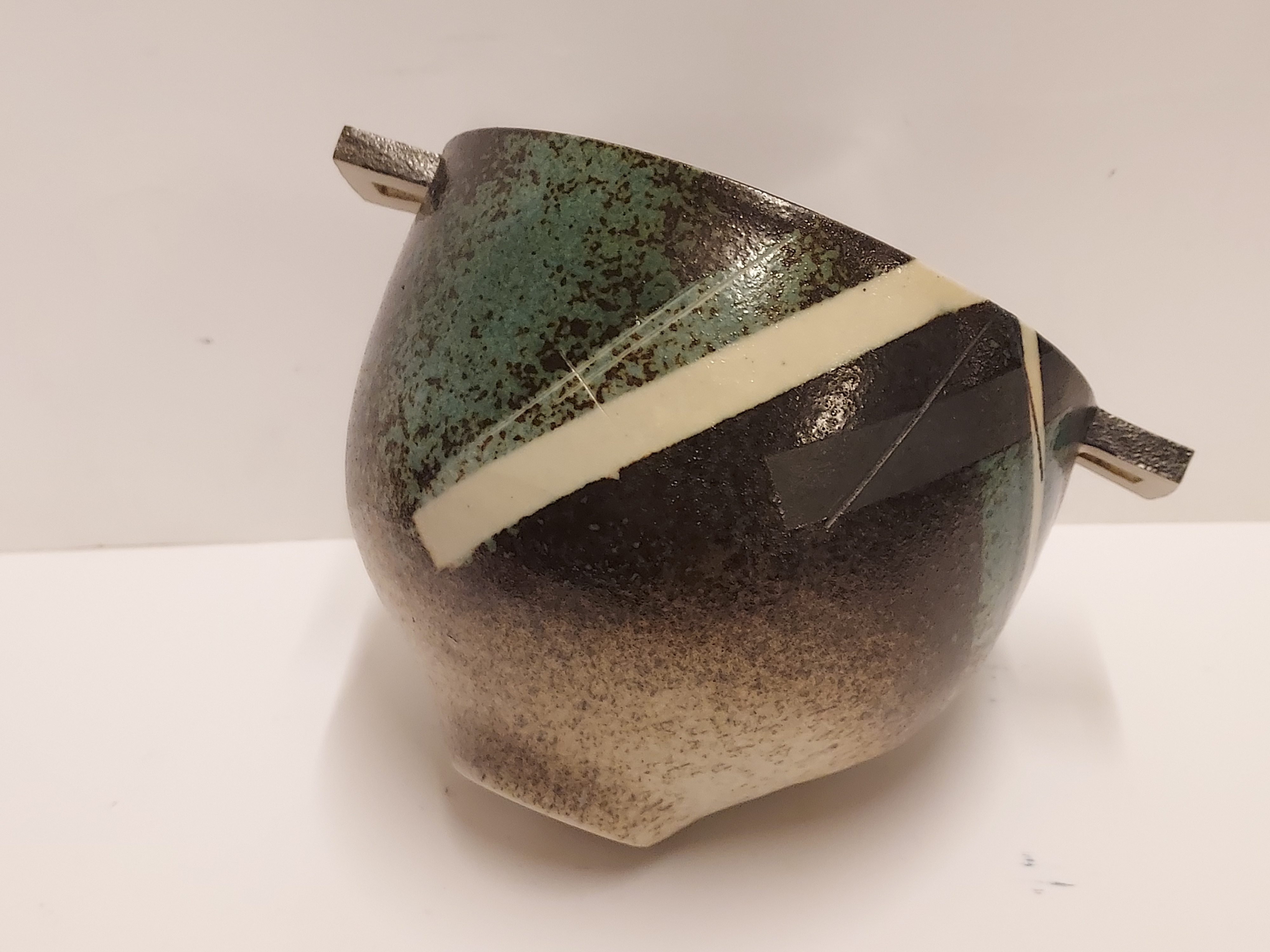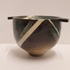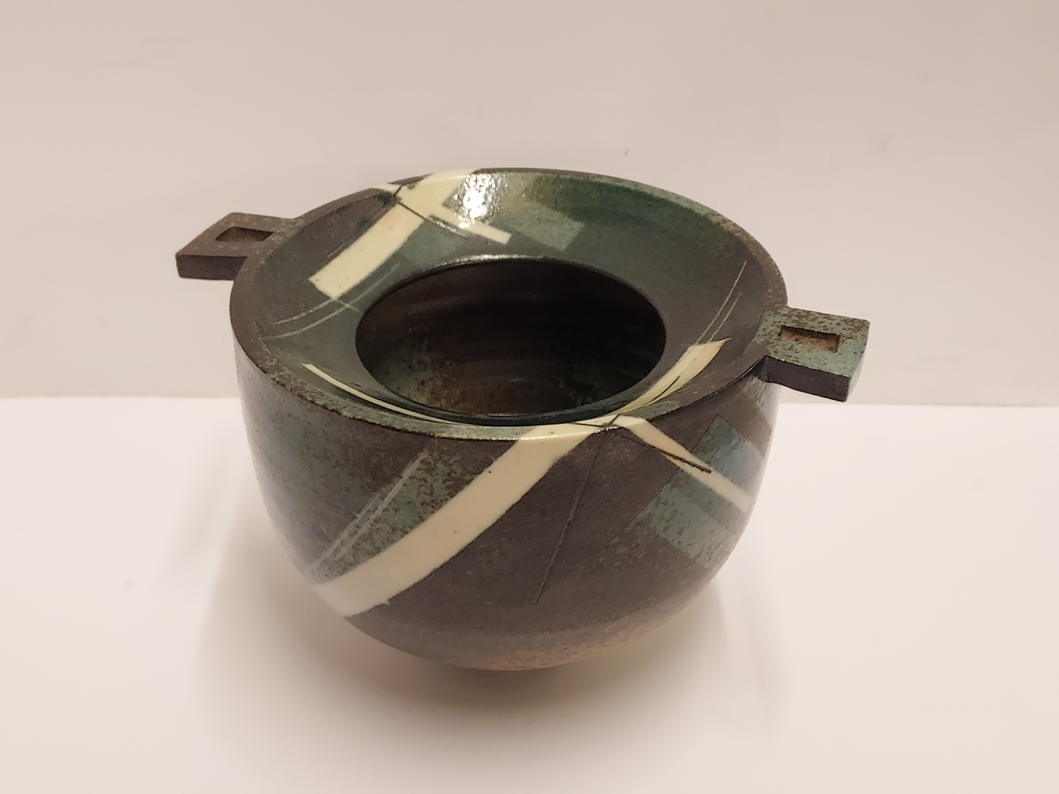 Aardewerken kom met 2 platte grepen, met geometrische decoratie op donker fond. Zijkant met kunstenaars signatuur