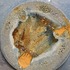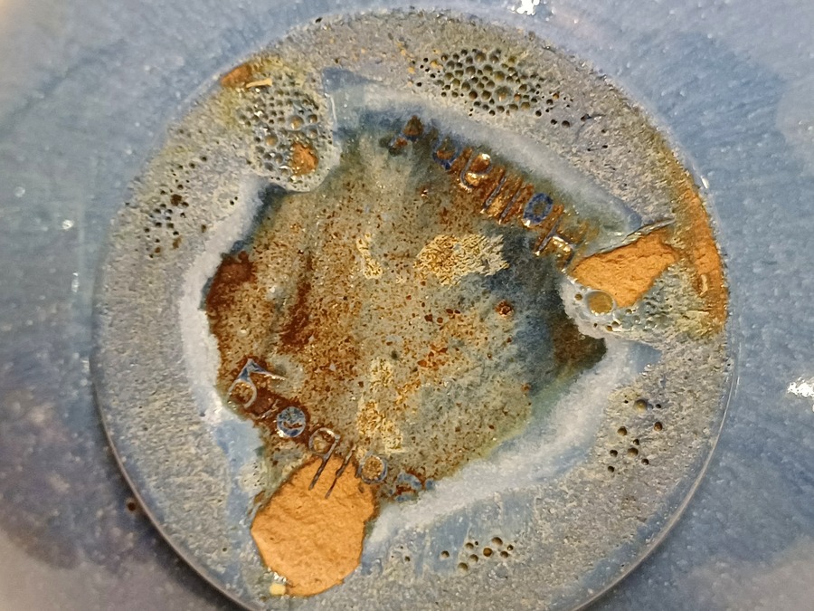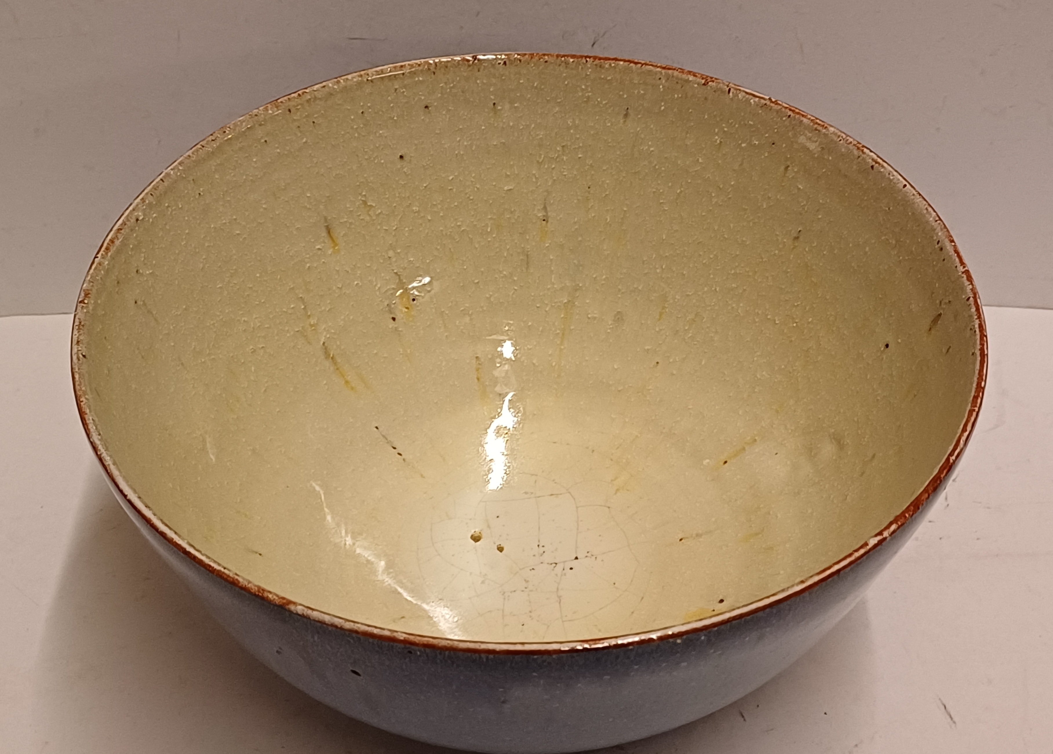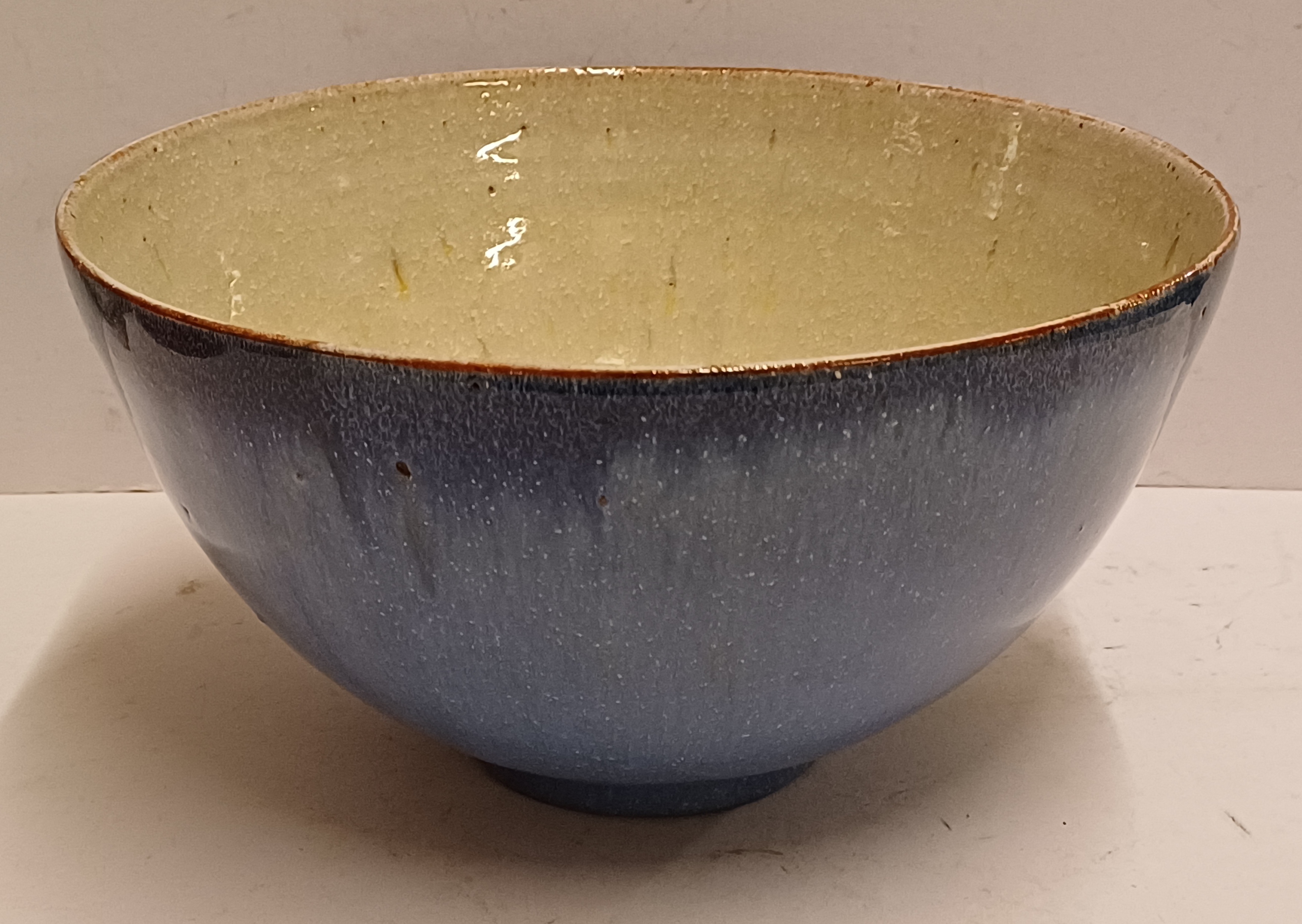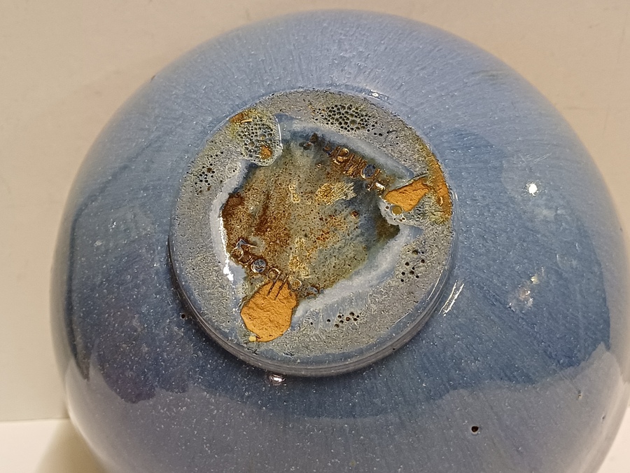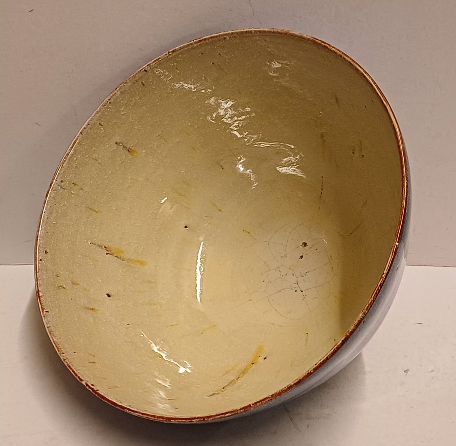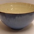 Fijn gedraaide dunne aardewerken kom met blauw geglazuurde buitenzijde met grijze binnenkant. Onderzijde gemerkt.