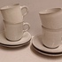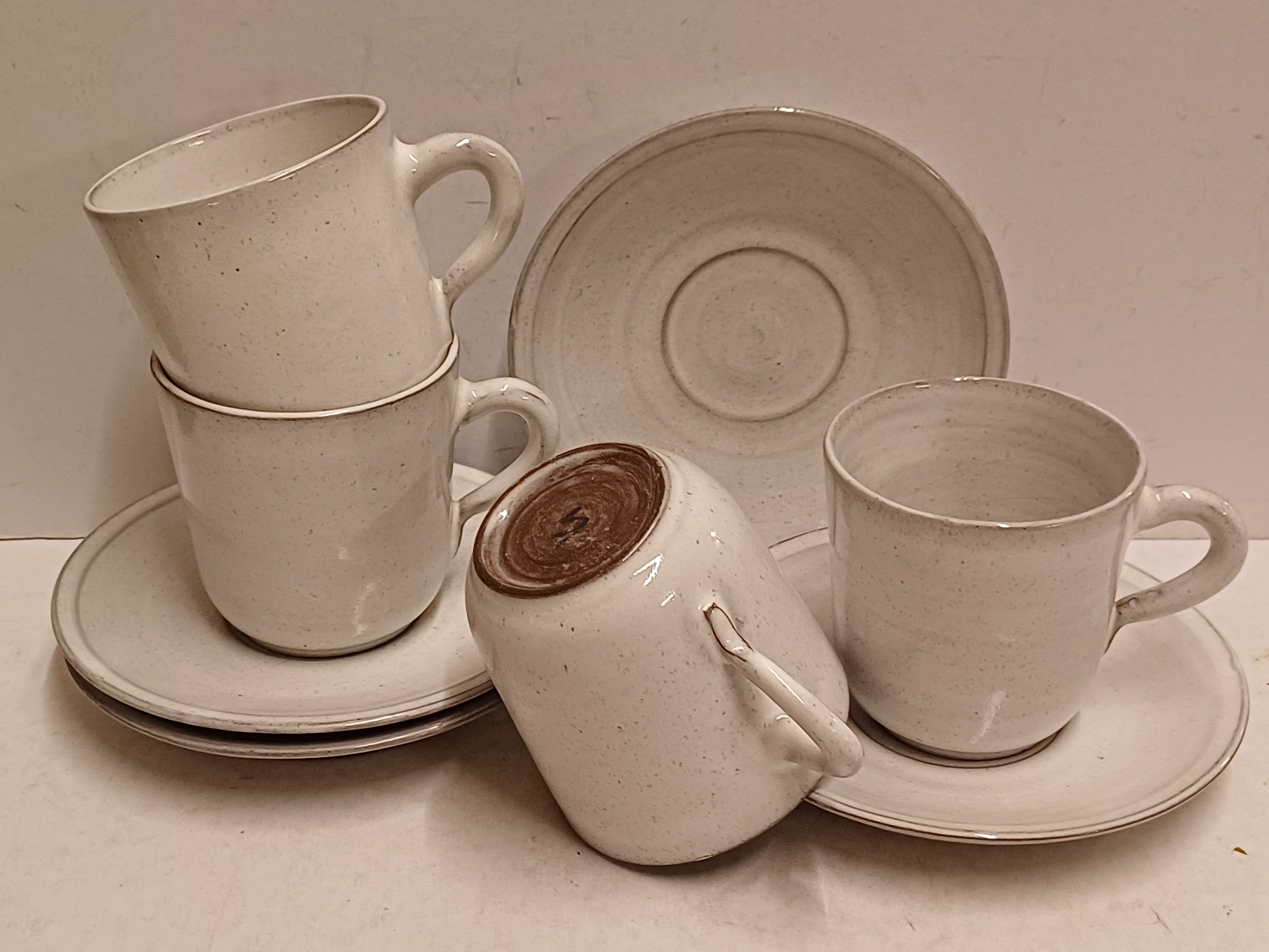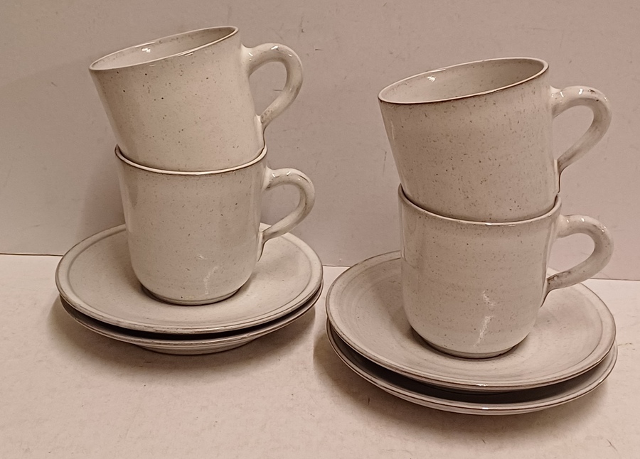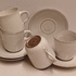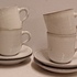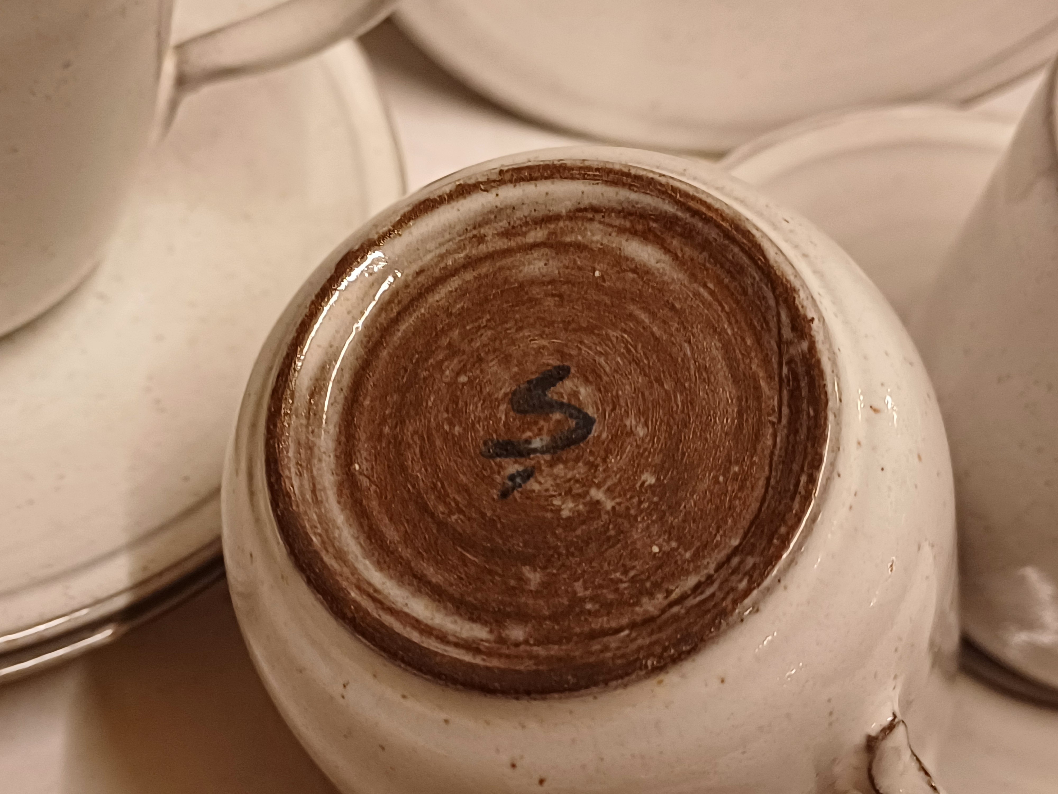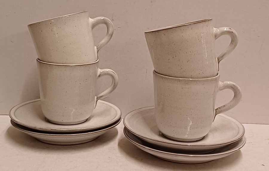 Een set van 4 kop en schotels met een witte loodglazuur. Onderzijde met monogram.