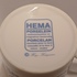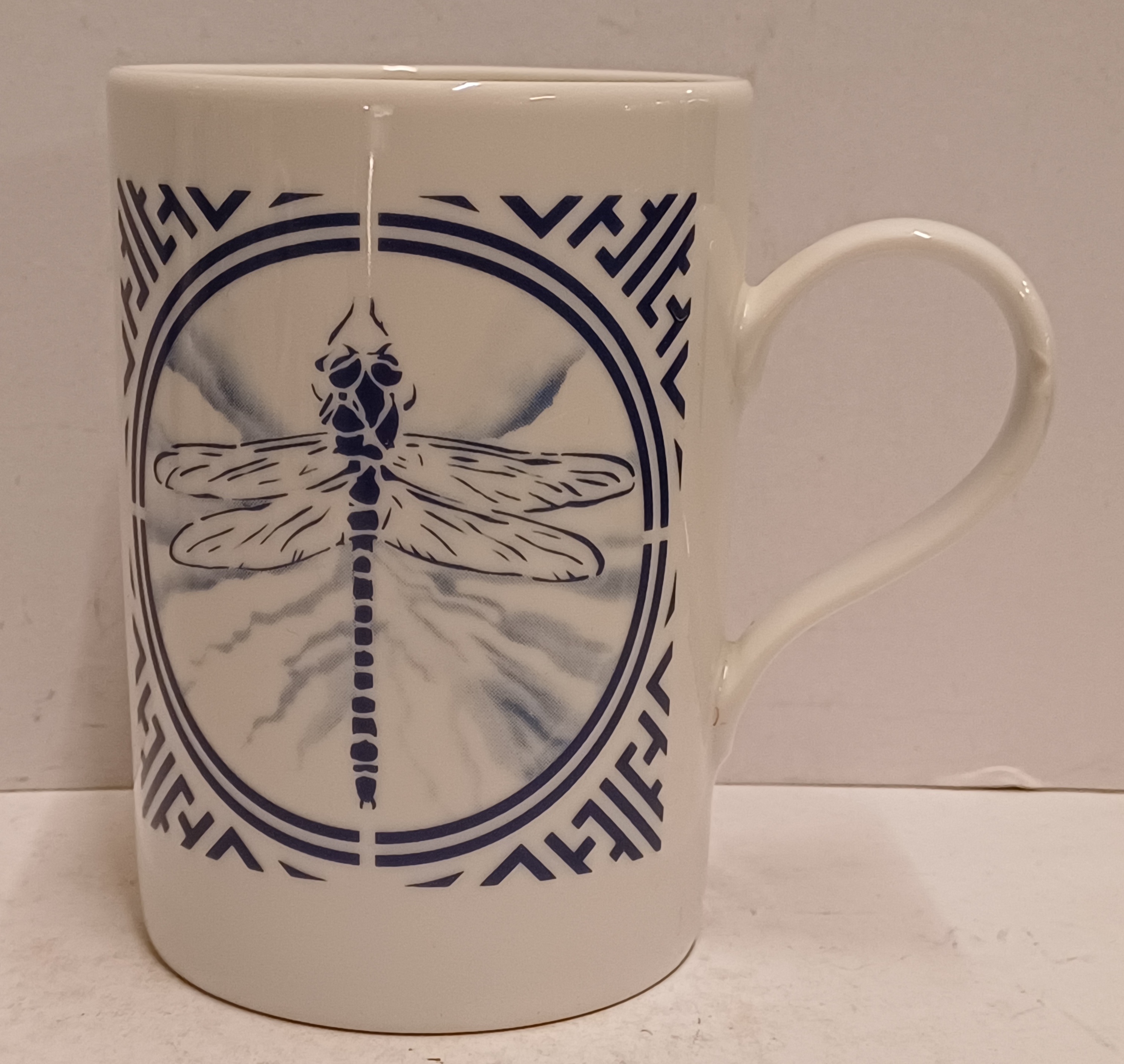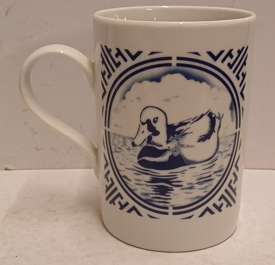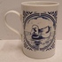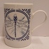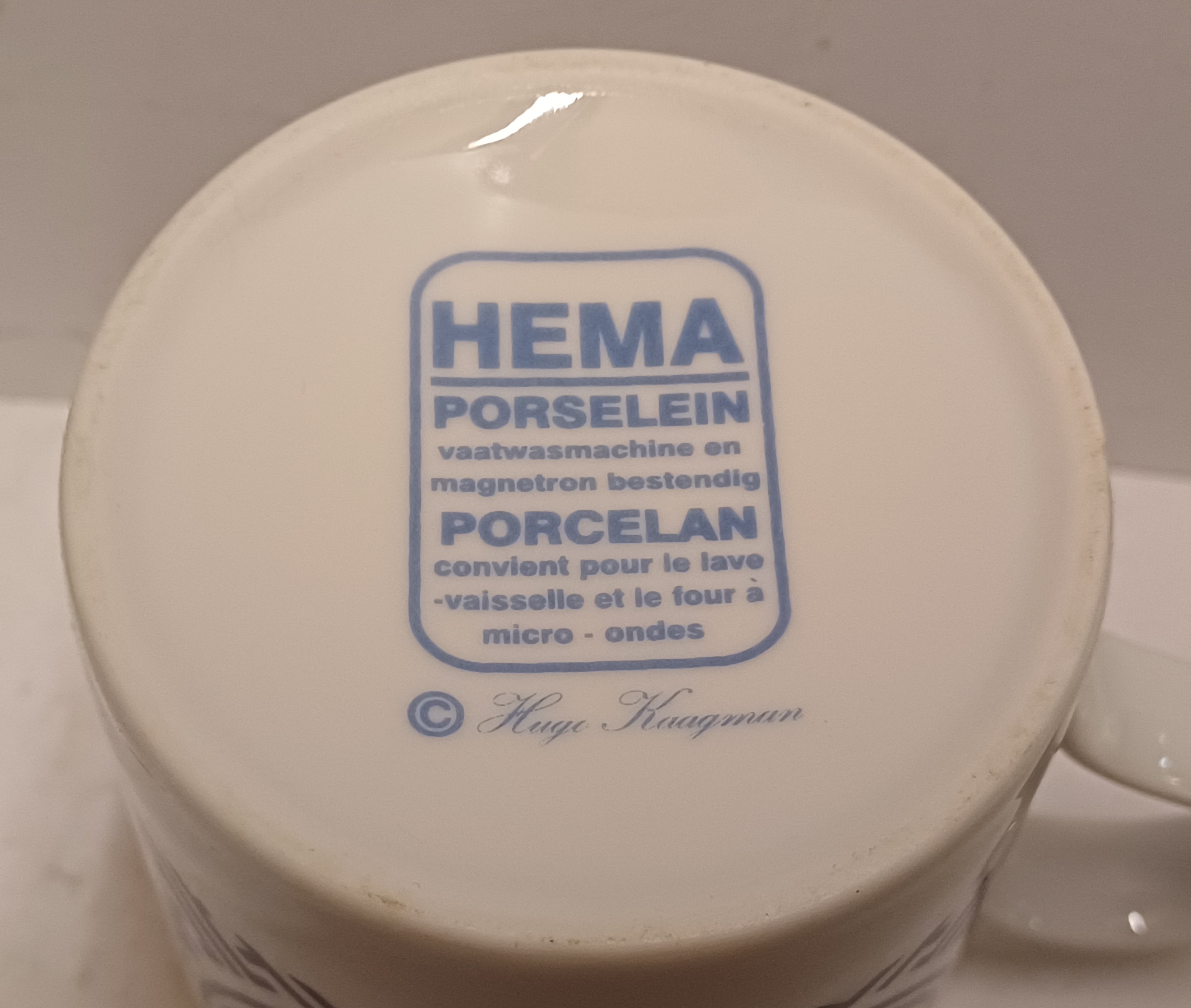 Porseleinen mok met blauw decor van libelle en eendje aan weerszijden met typerende Kaagman Hoekmotieven. Onderzijde gemerkt Uitvoering Hema.