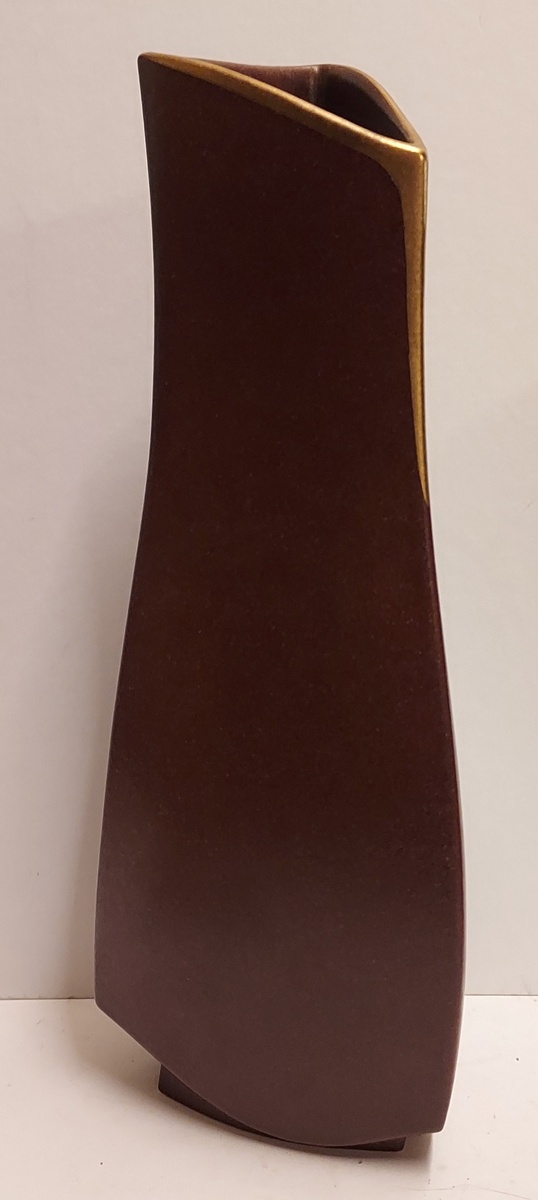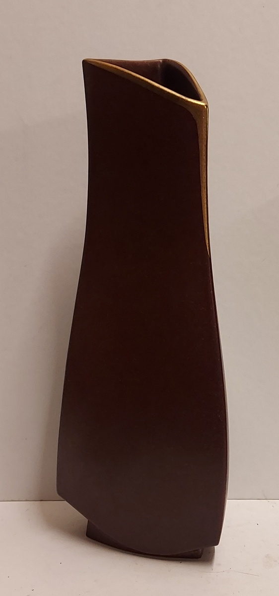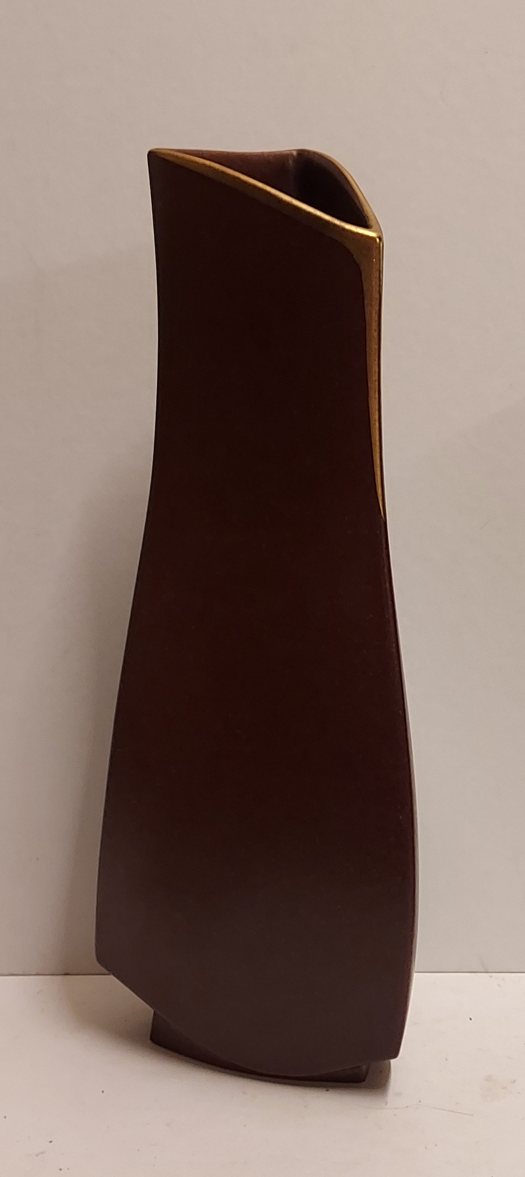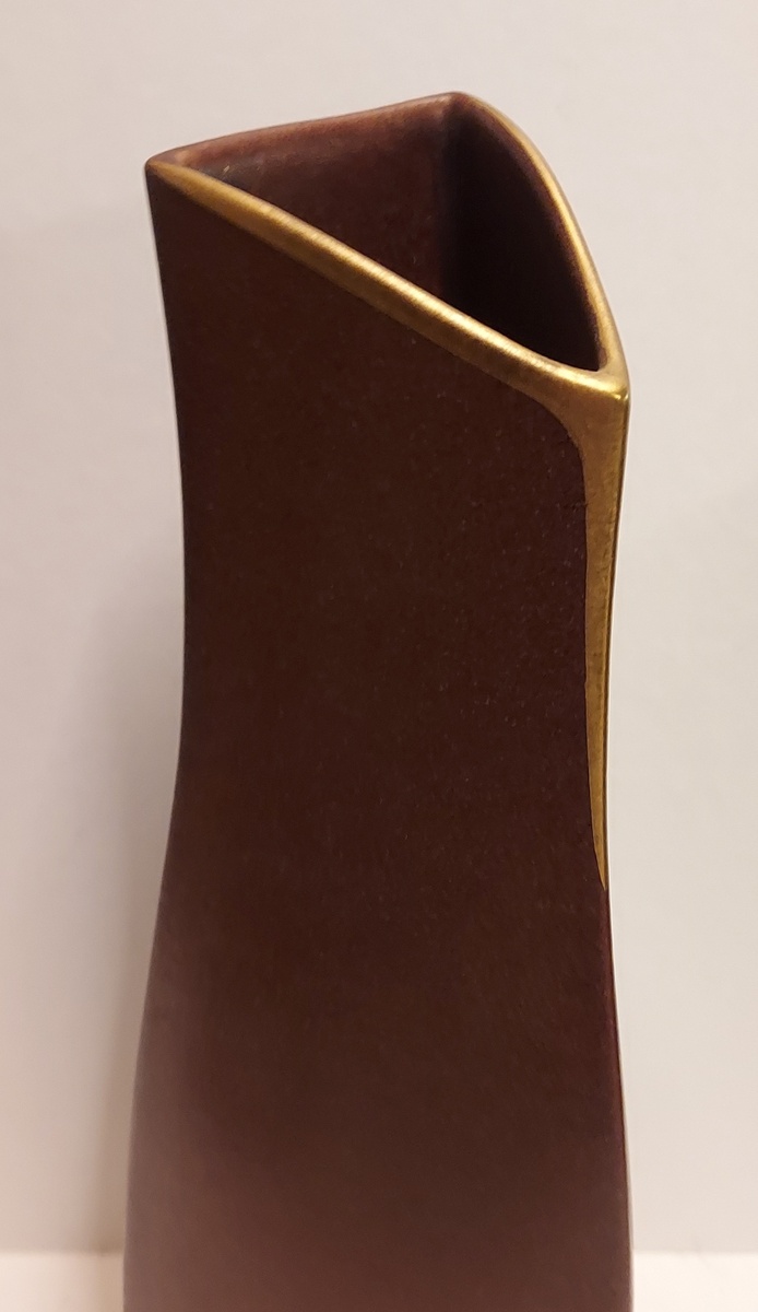 Vase moulé avec glaçure bordeaux et bord supérieur doré. Face inférieure avec monogramme.