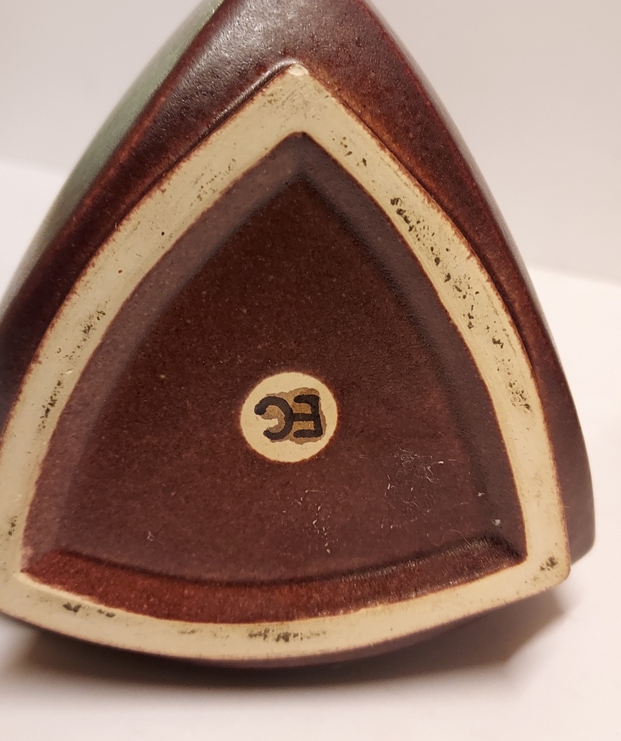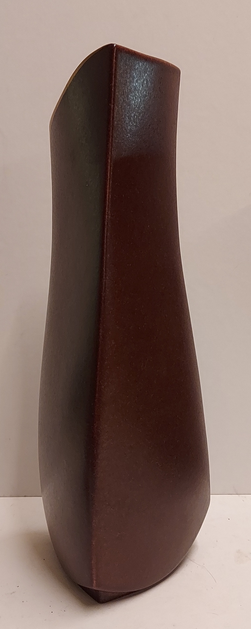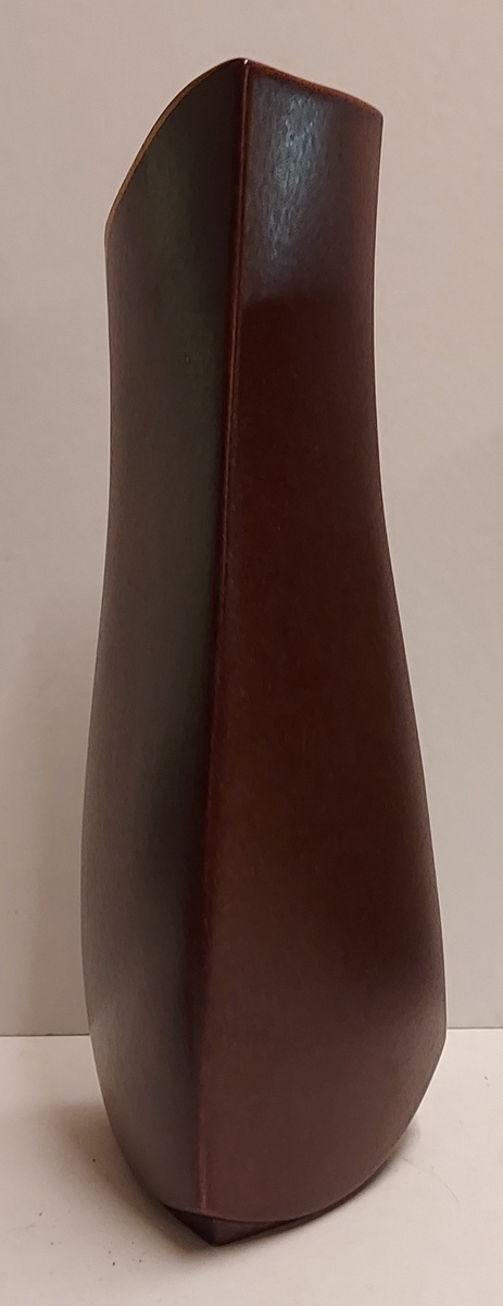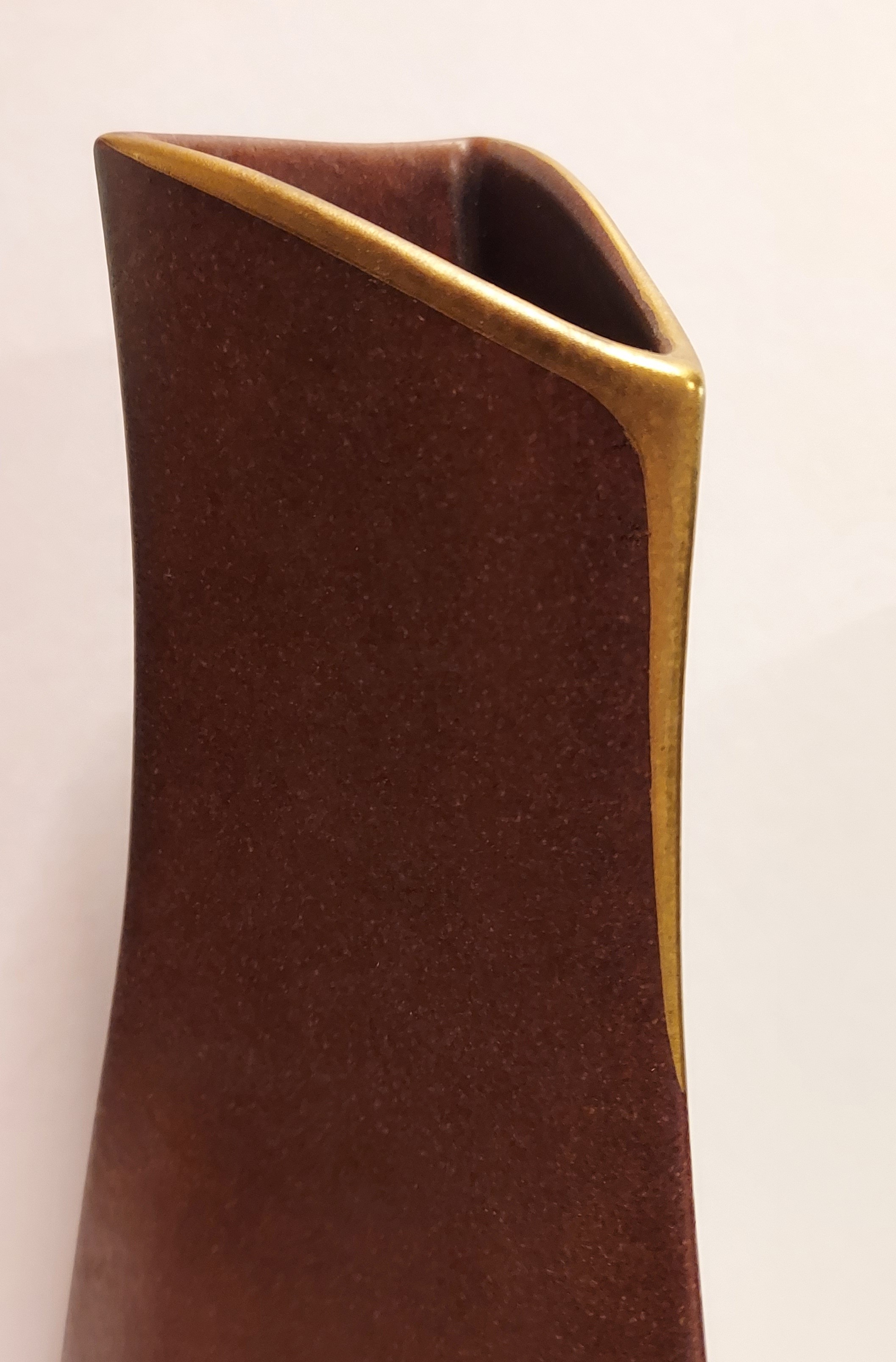 Vase moulé avec glaçure bordeaux et bord supérieur doré. Face inférieure avec monogramme.