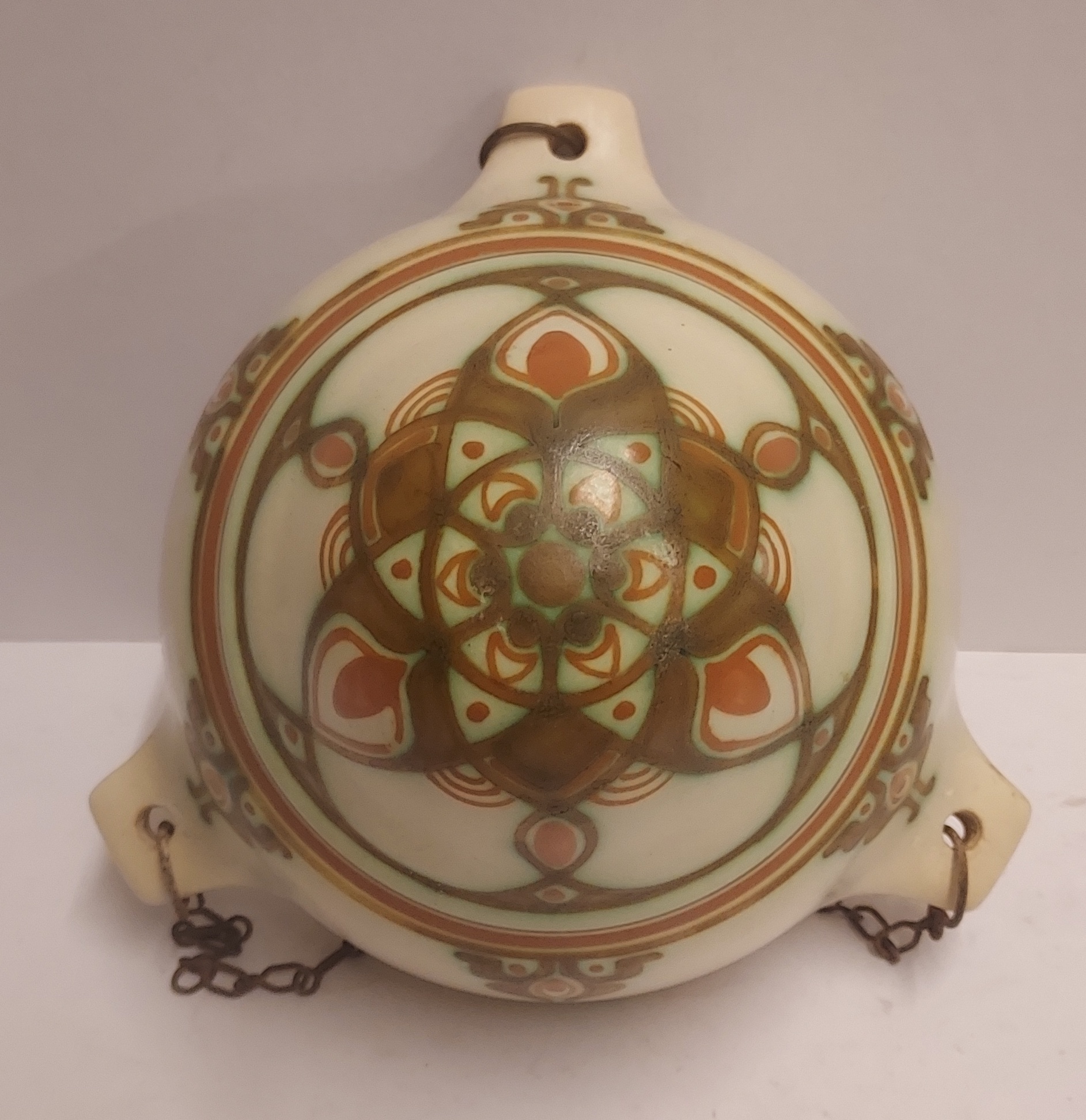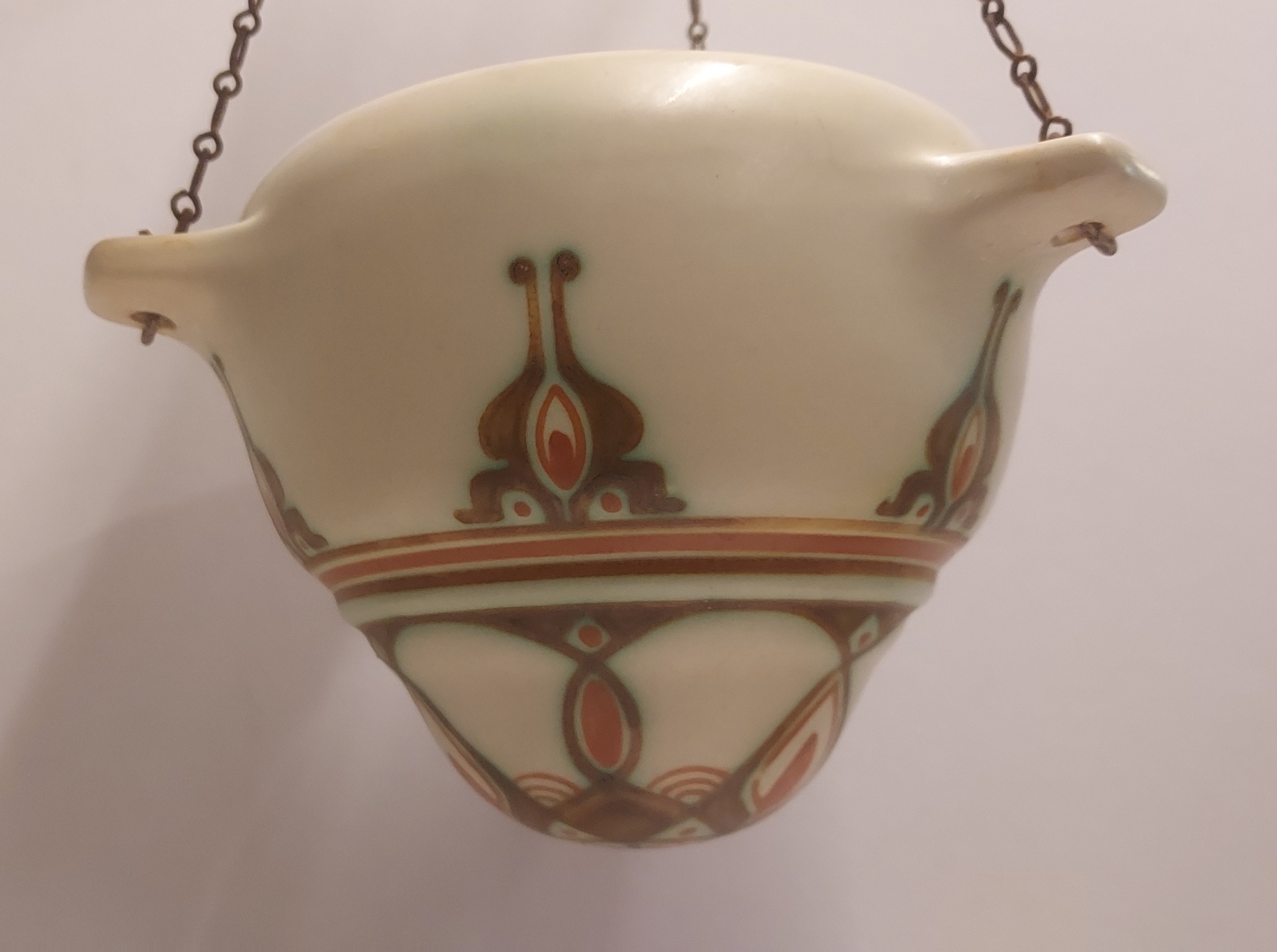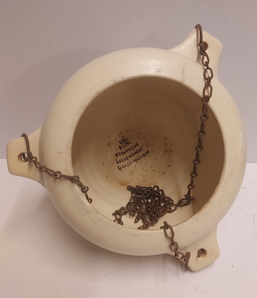 Suspension pour plantes en faïence avec un décor géométrique en vert et brun sur fond crème. Décoration conçue par Bert Nienhuis. Intérieur de la suspension marqué Distel Koninklijke Goedewaagen Gouda. Vers 1935.
