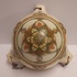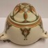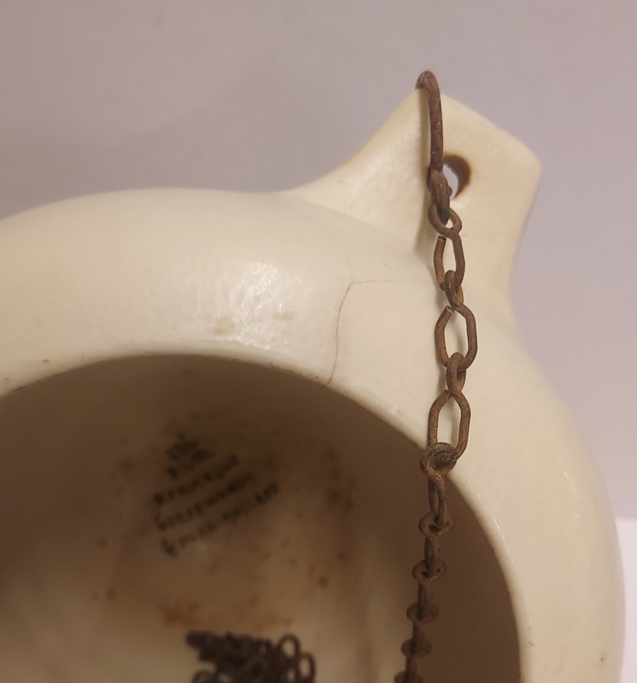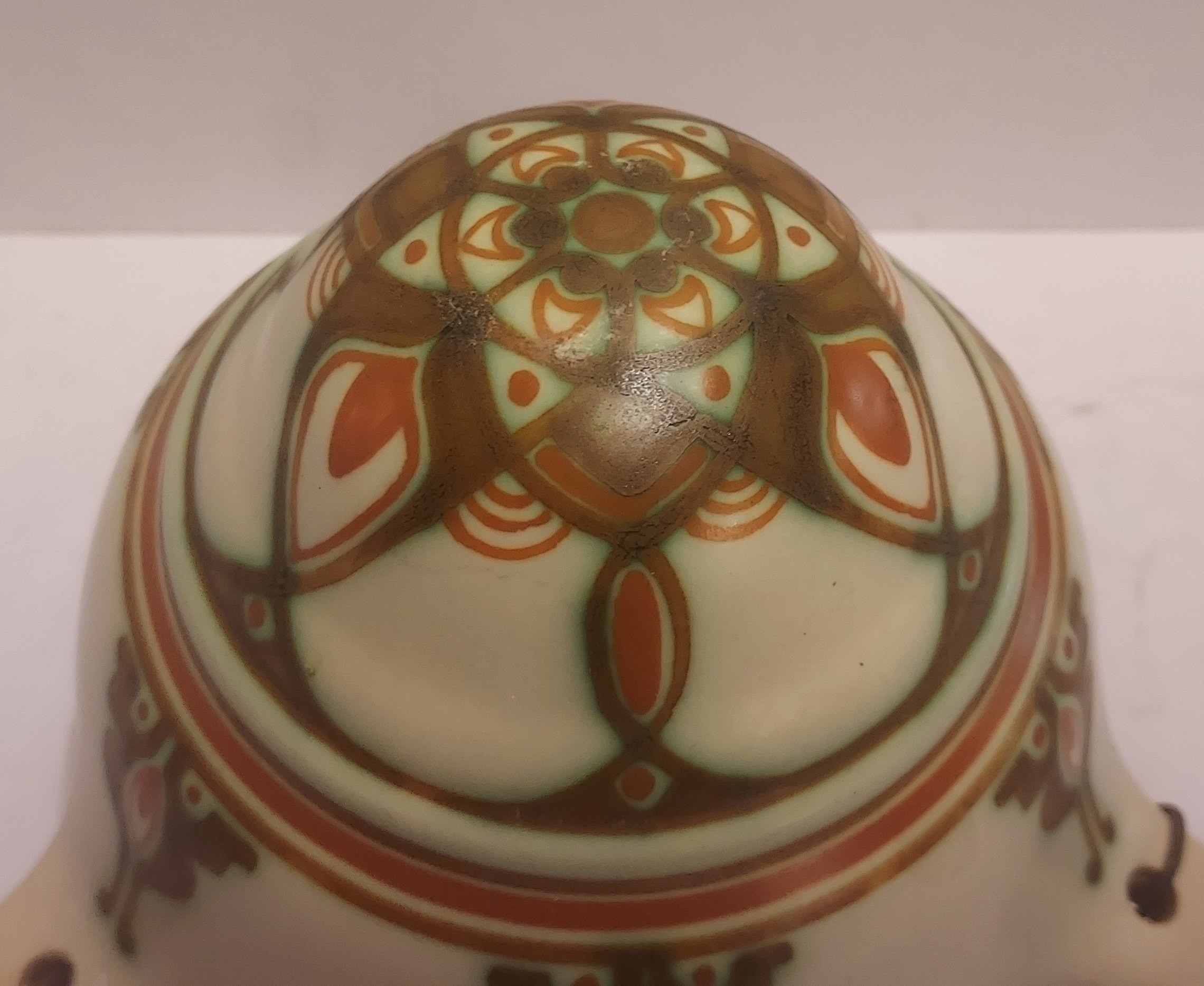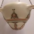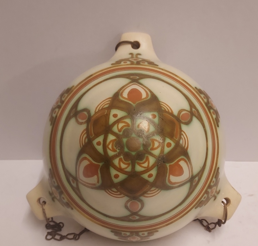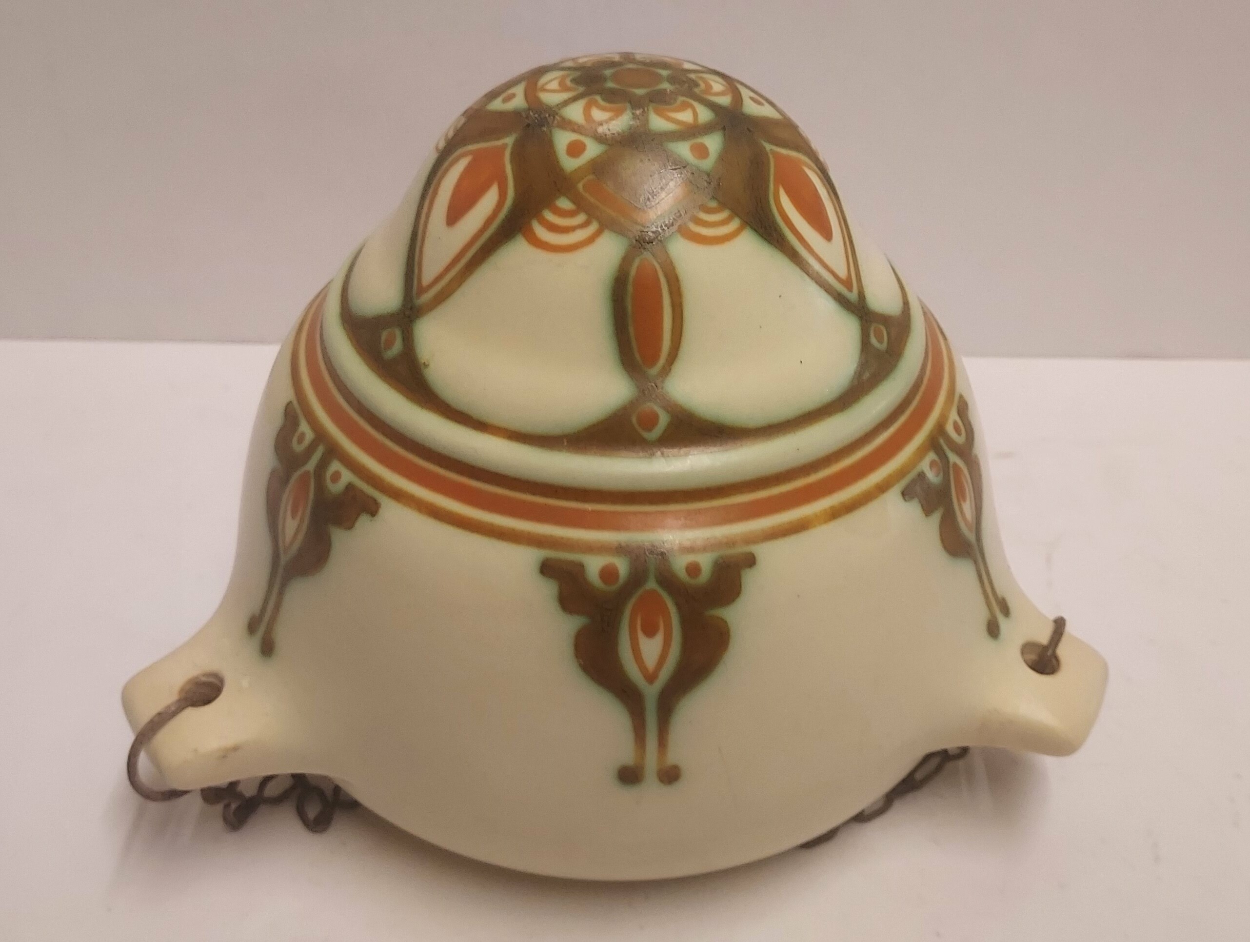 Suspension pour plantes en faïence avec un décor géométrique en vert et brun sur fond crème. Décoration conçue par Bert Nienhuis. Intérieur de la suspension marqué Distel Koninklijke Goedewaagen Gouda. Vers 1935.