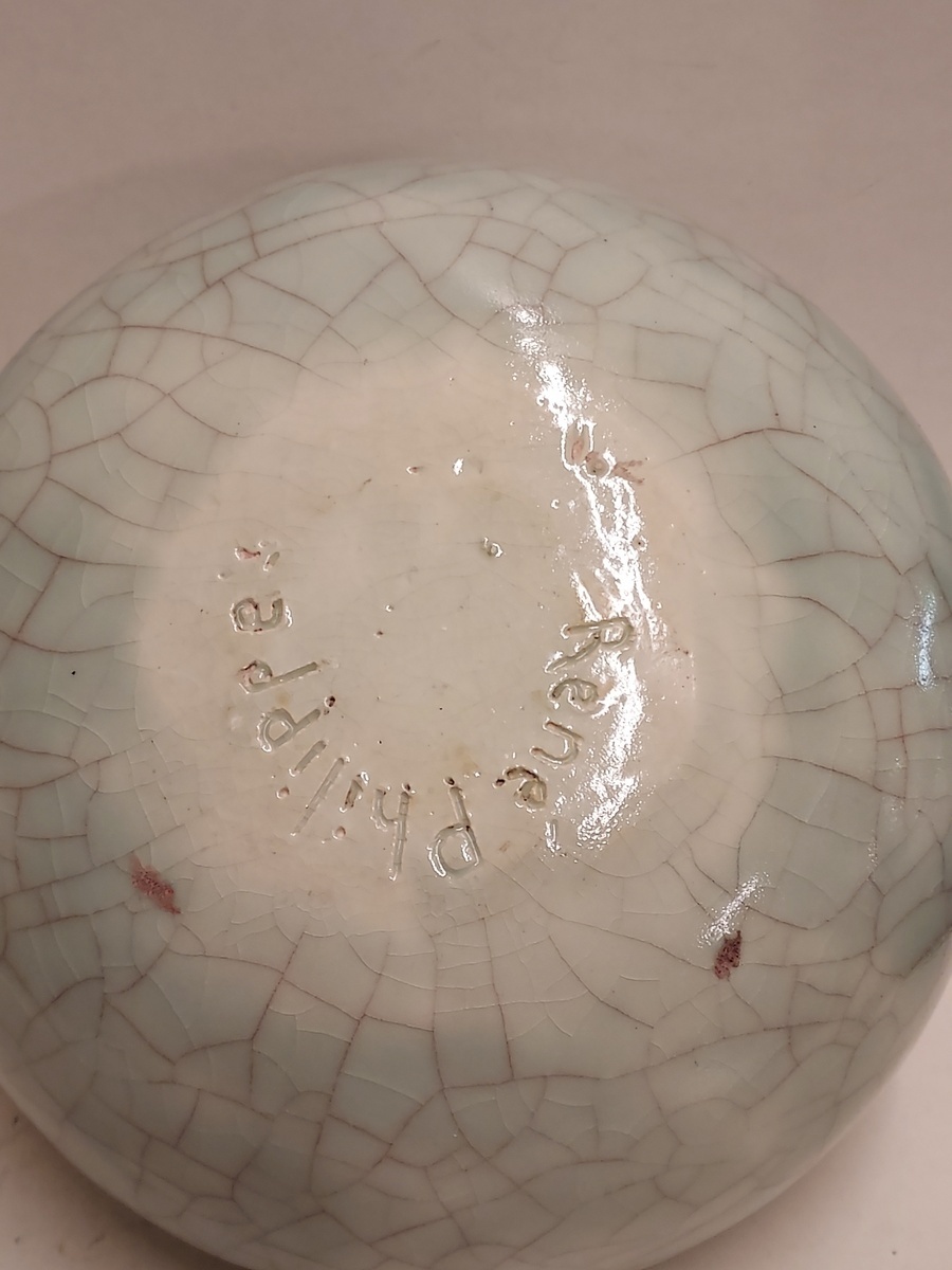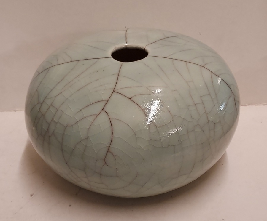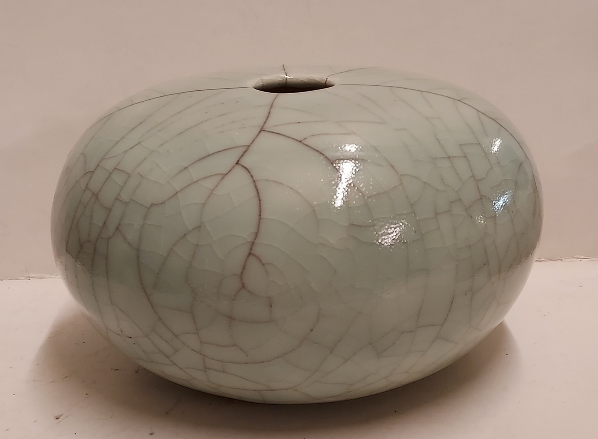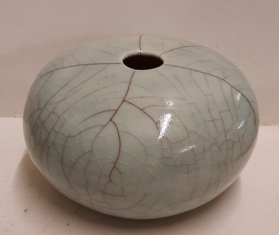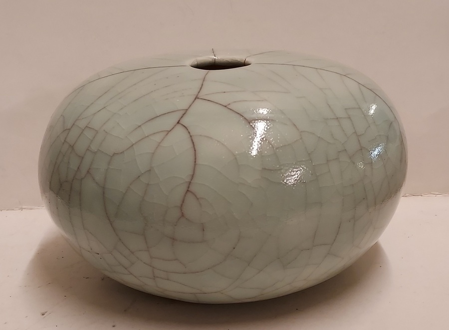 Vase craquelé avec glaçure céladon. Signé en entier sur le dessous.
