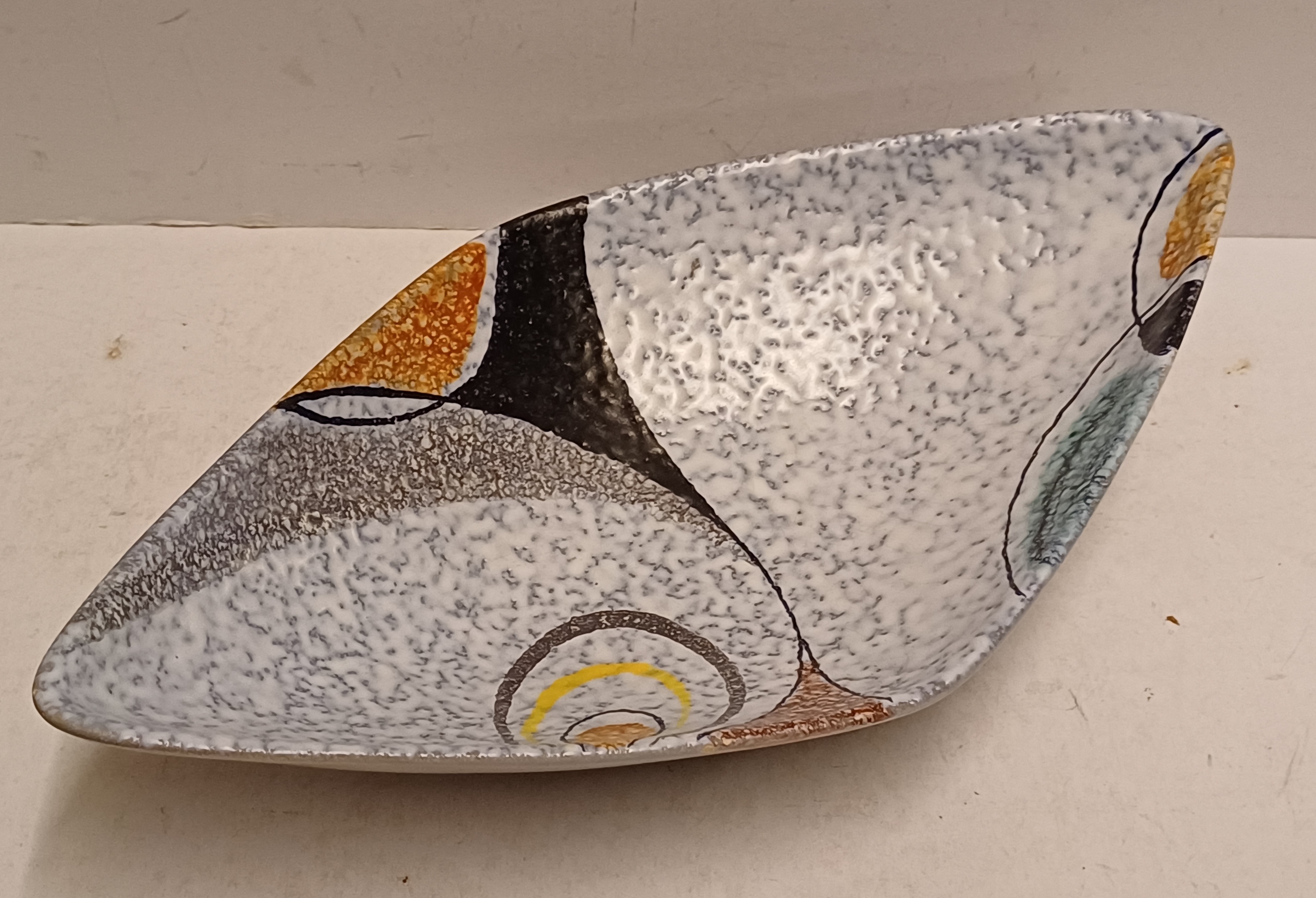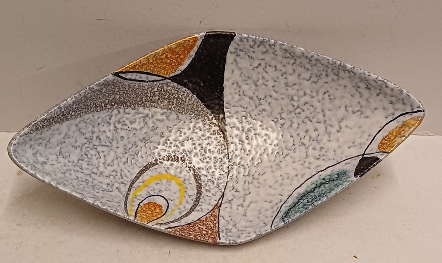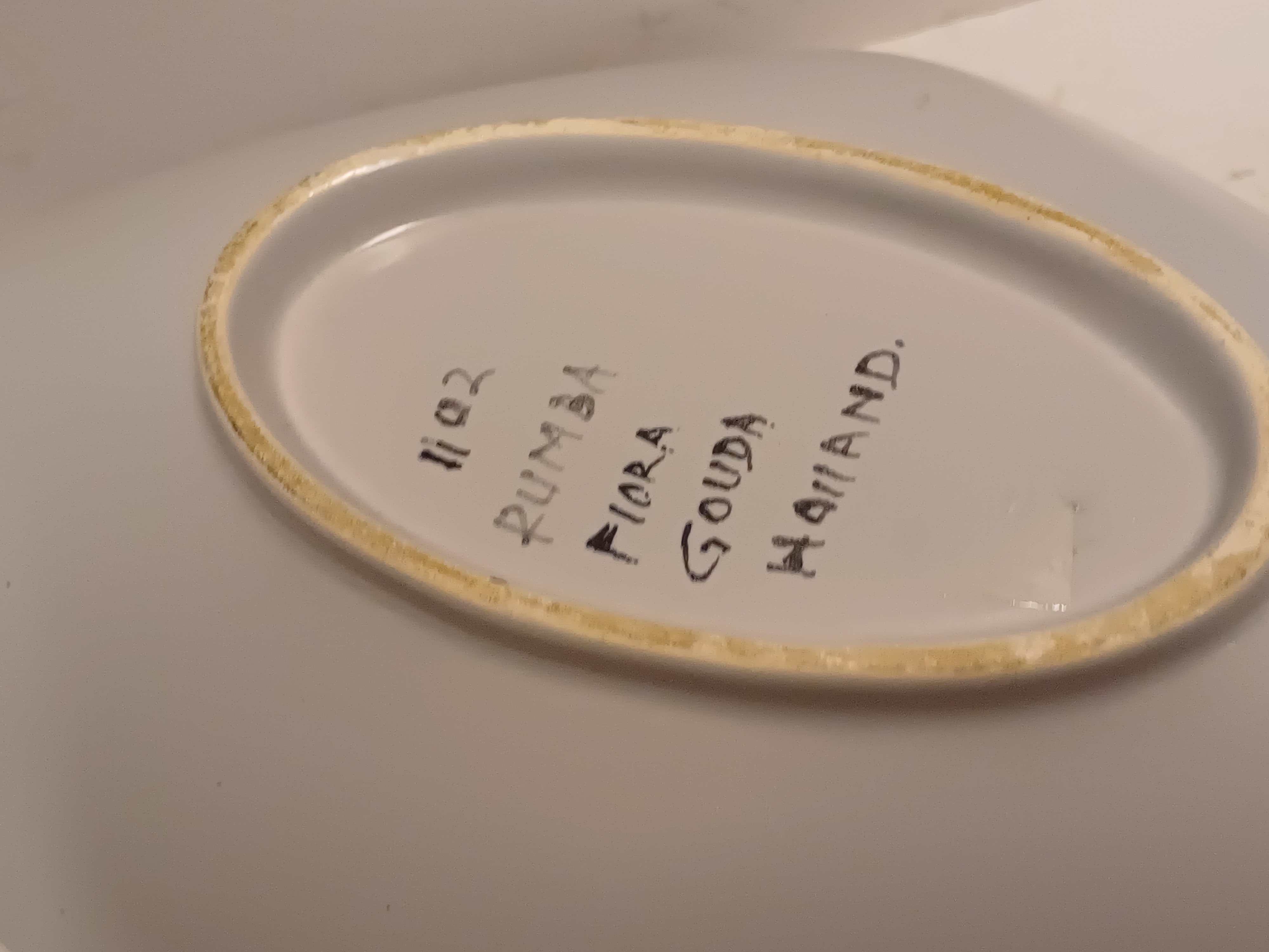 Platelen schaal met decor Rumba op grijs fond. Onderzijde met fabrieksmerk en modelnummer.
