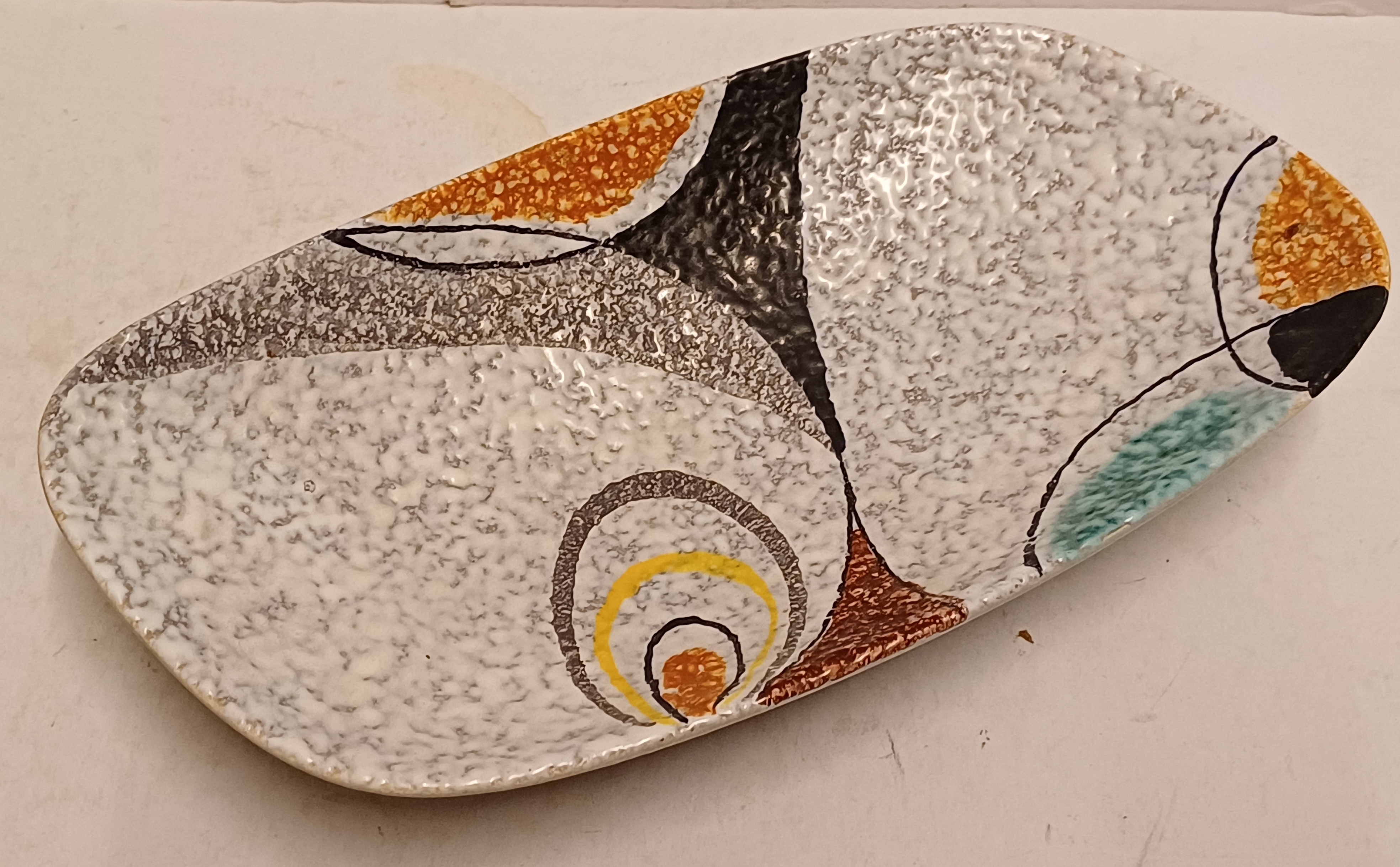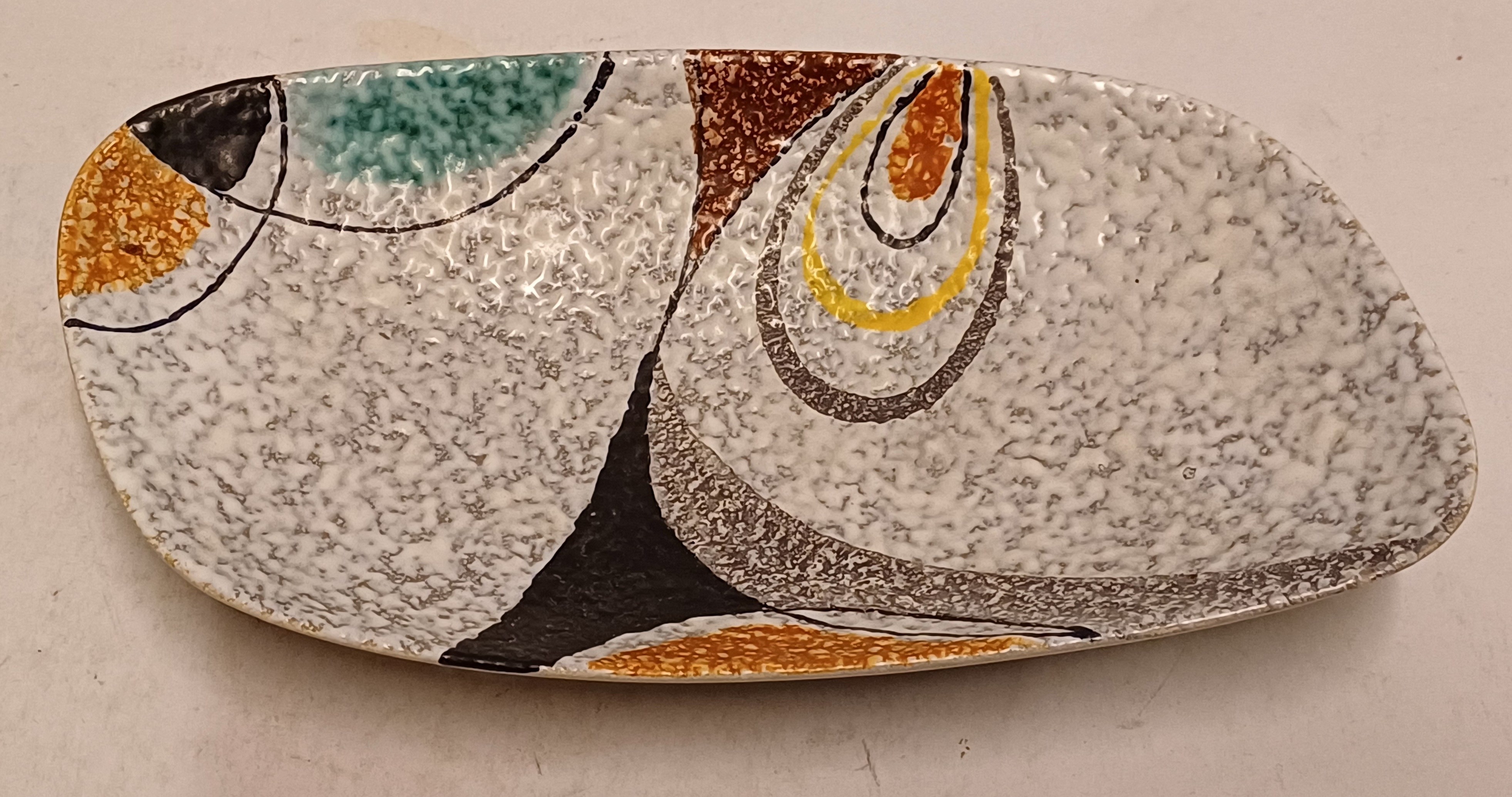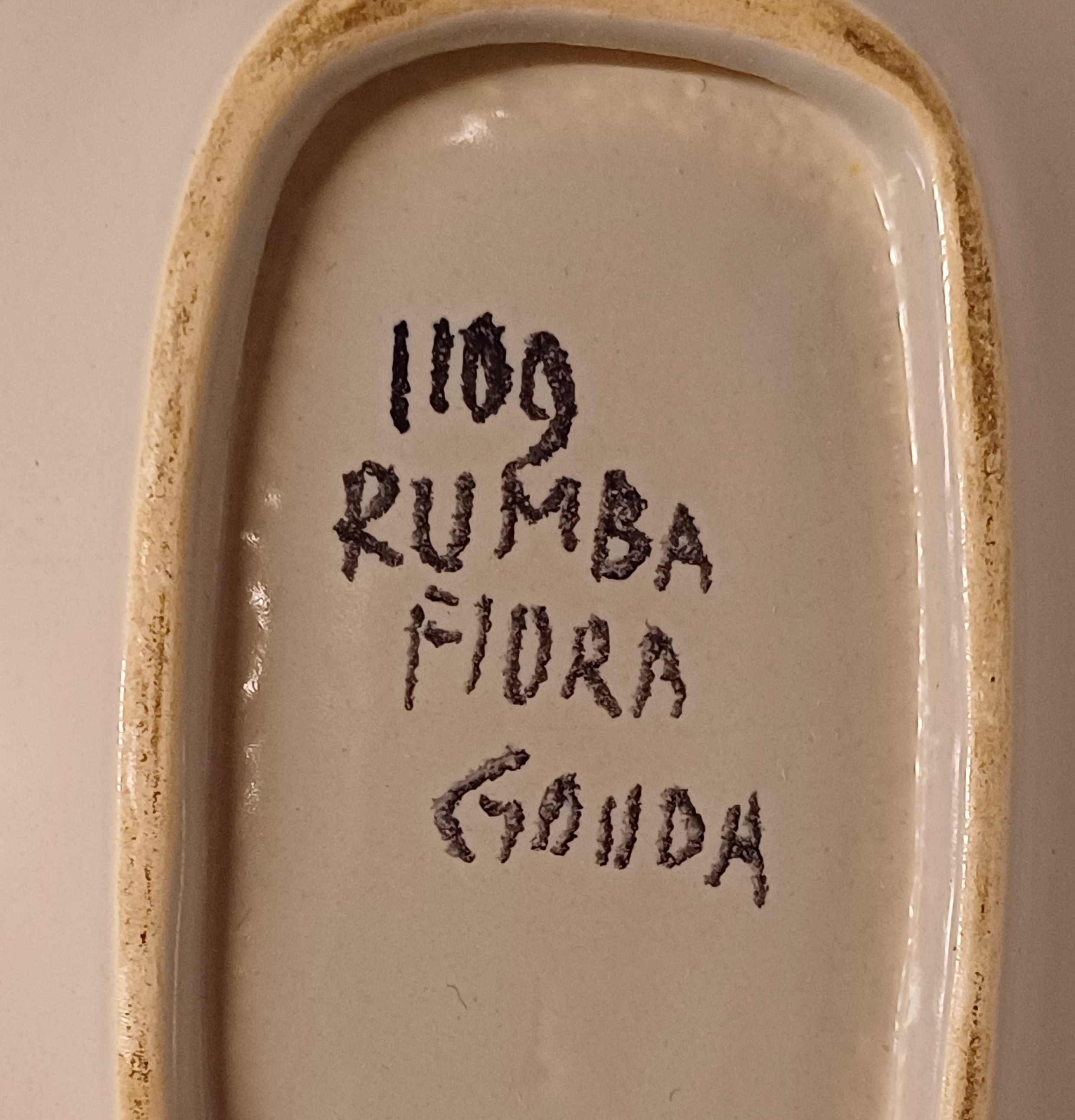 Platelen schaal met decor Rumba op grijs fond. Onderzijde met fabrieksmerk en modelnummer.