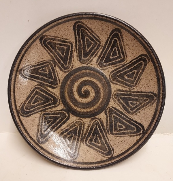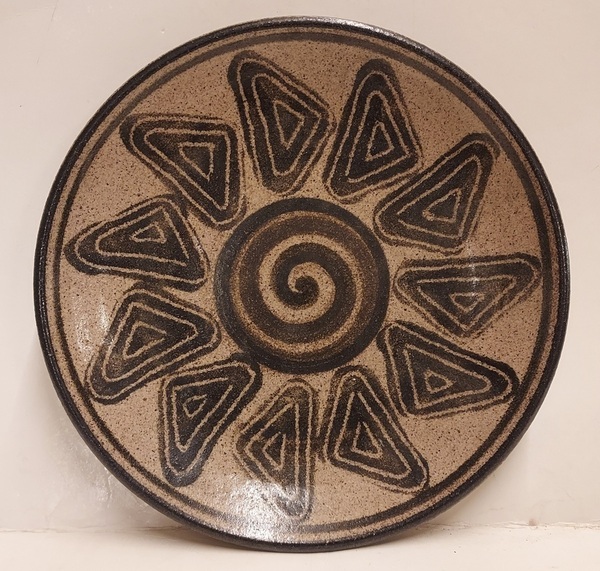 Assiette en terre cuite avec décoration abstraite en noir. Signée au verso.