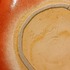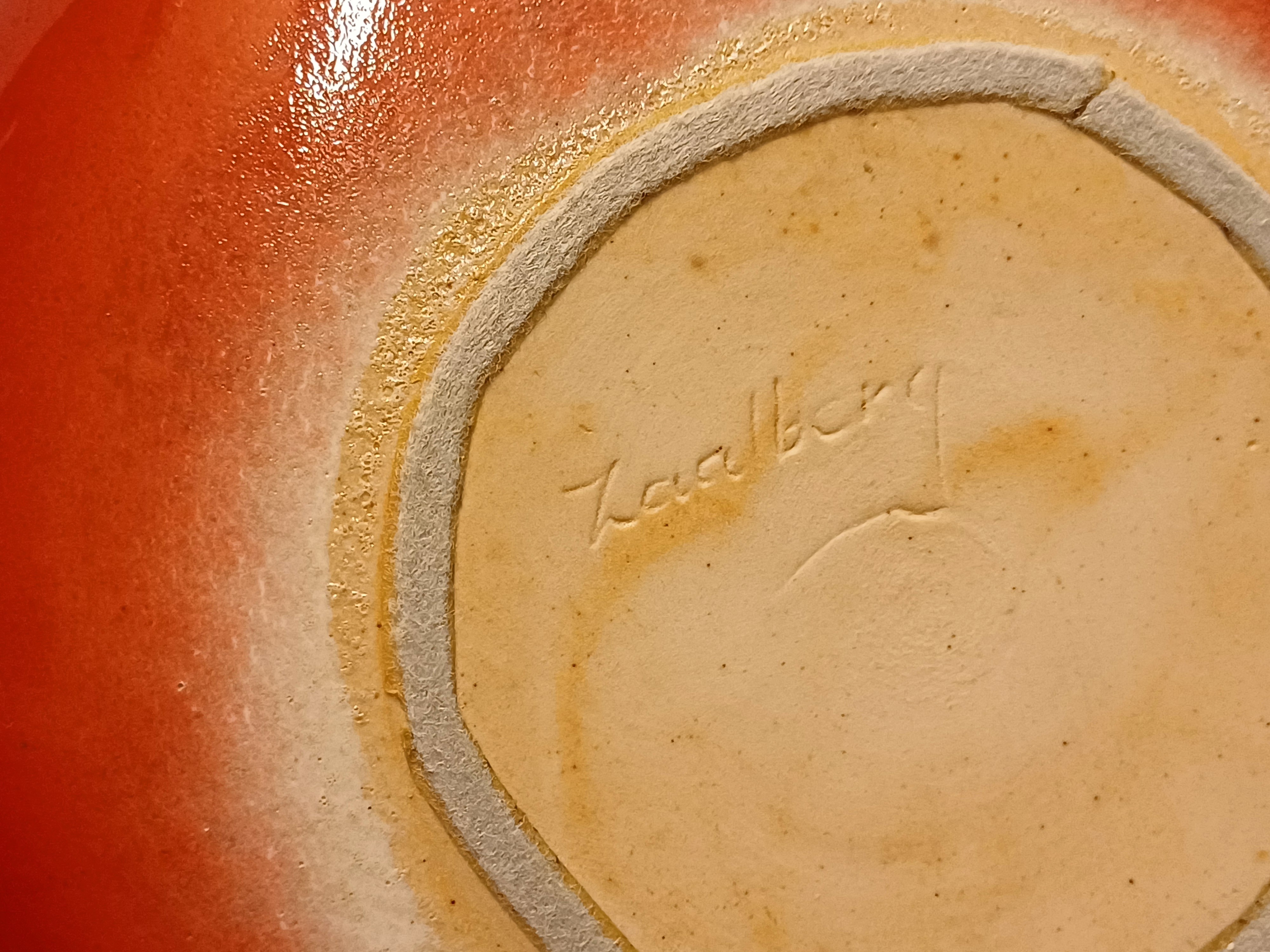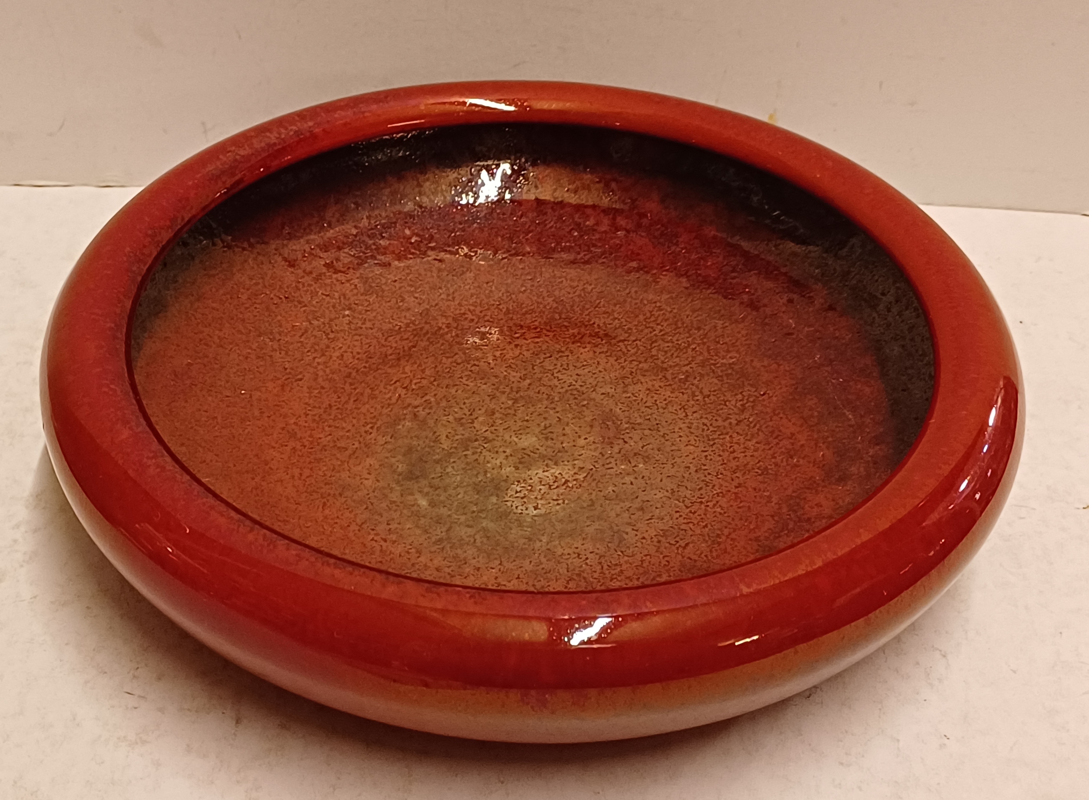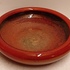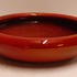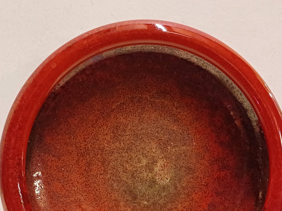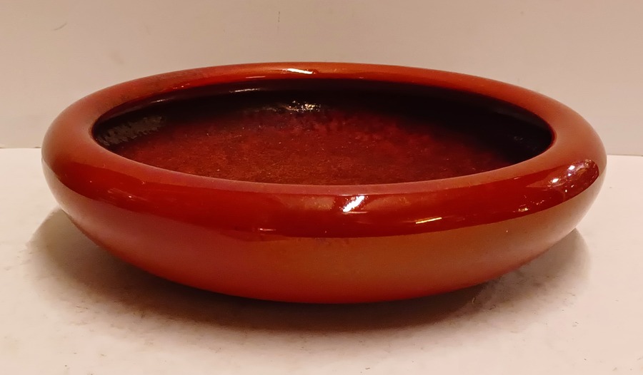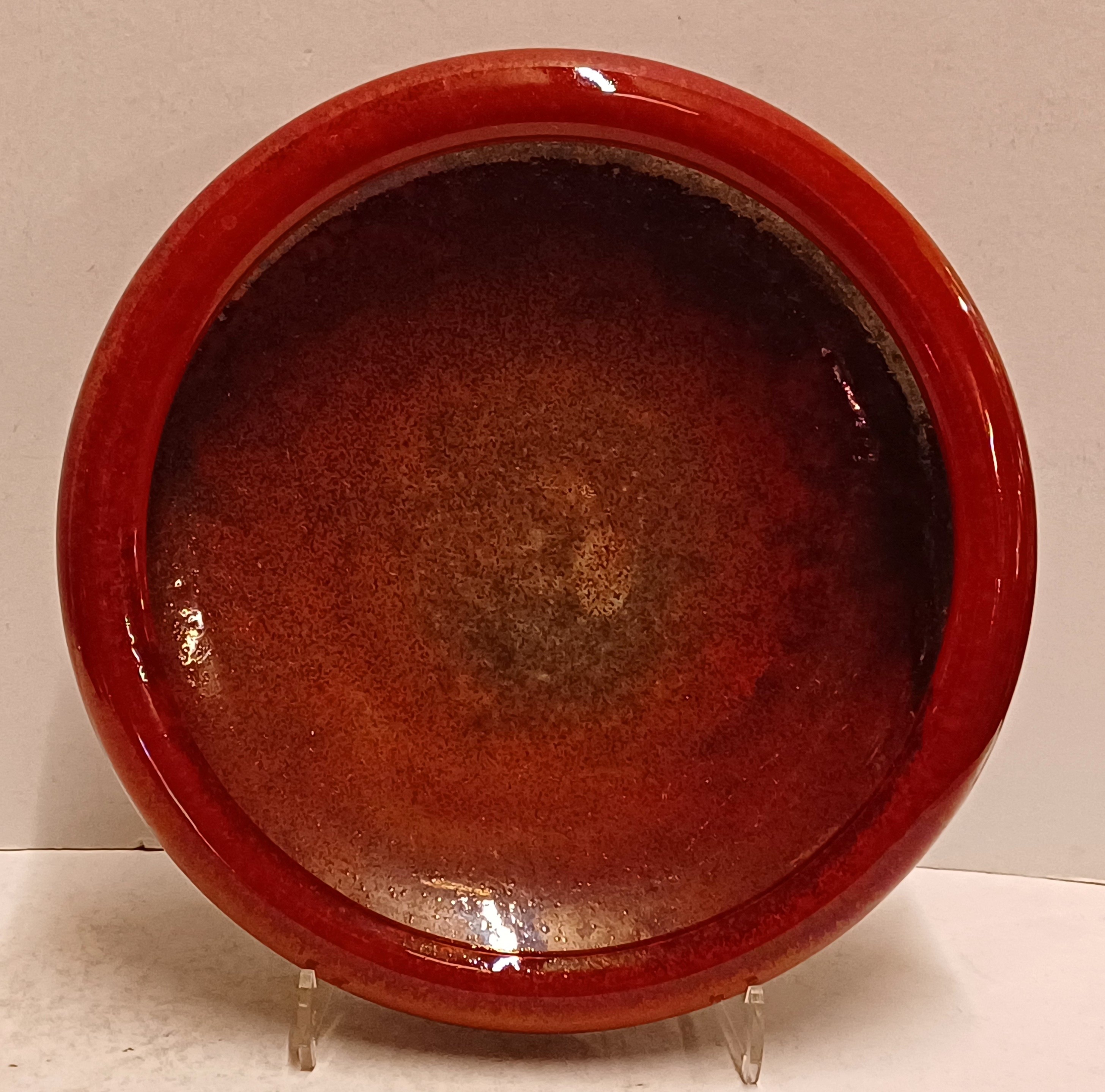 Aardewerken schaal met rode metallic glazuur. Onderzijde met signatuur.
