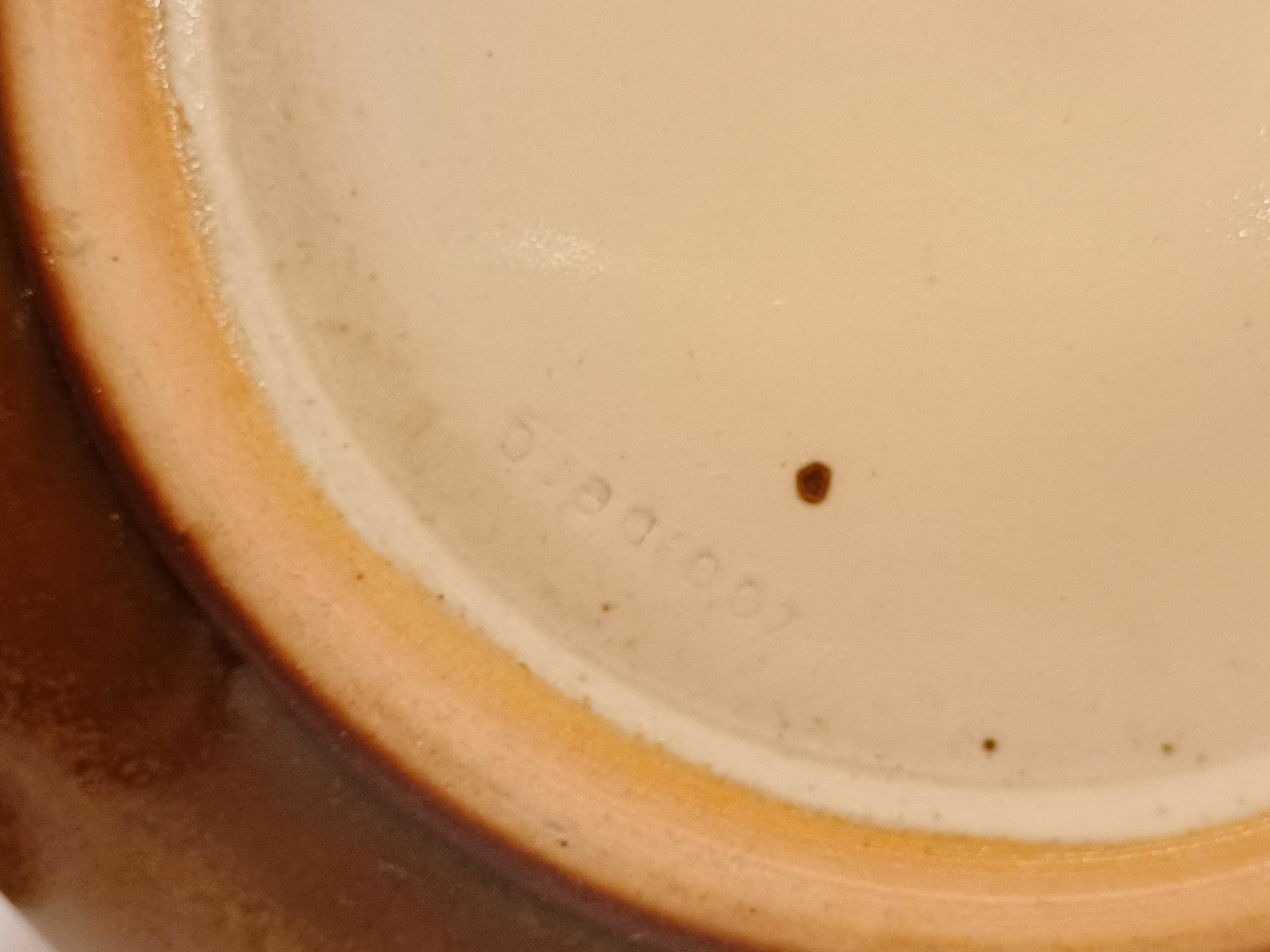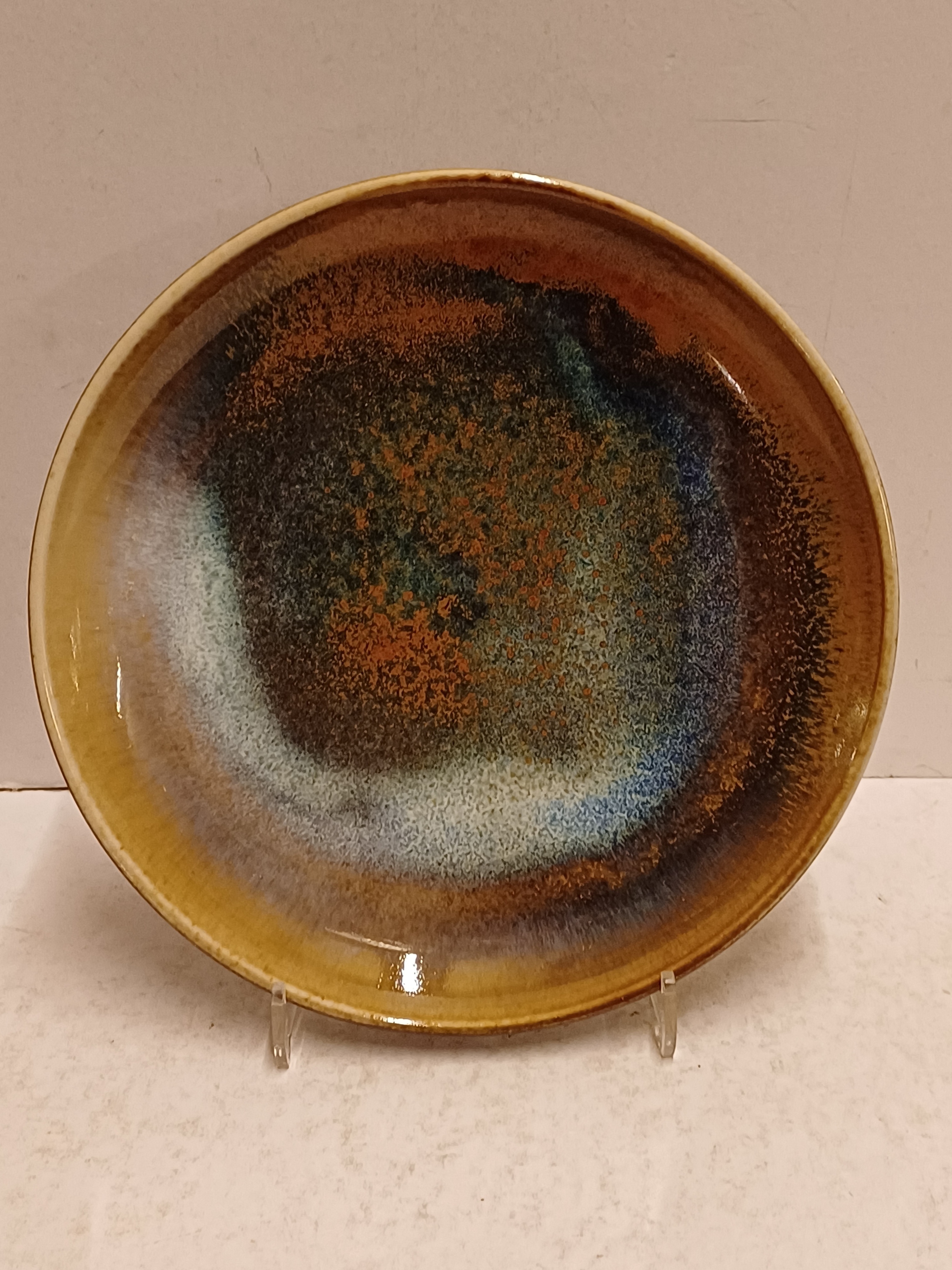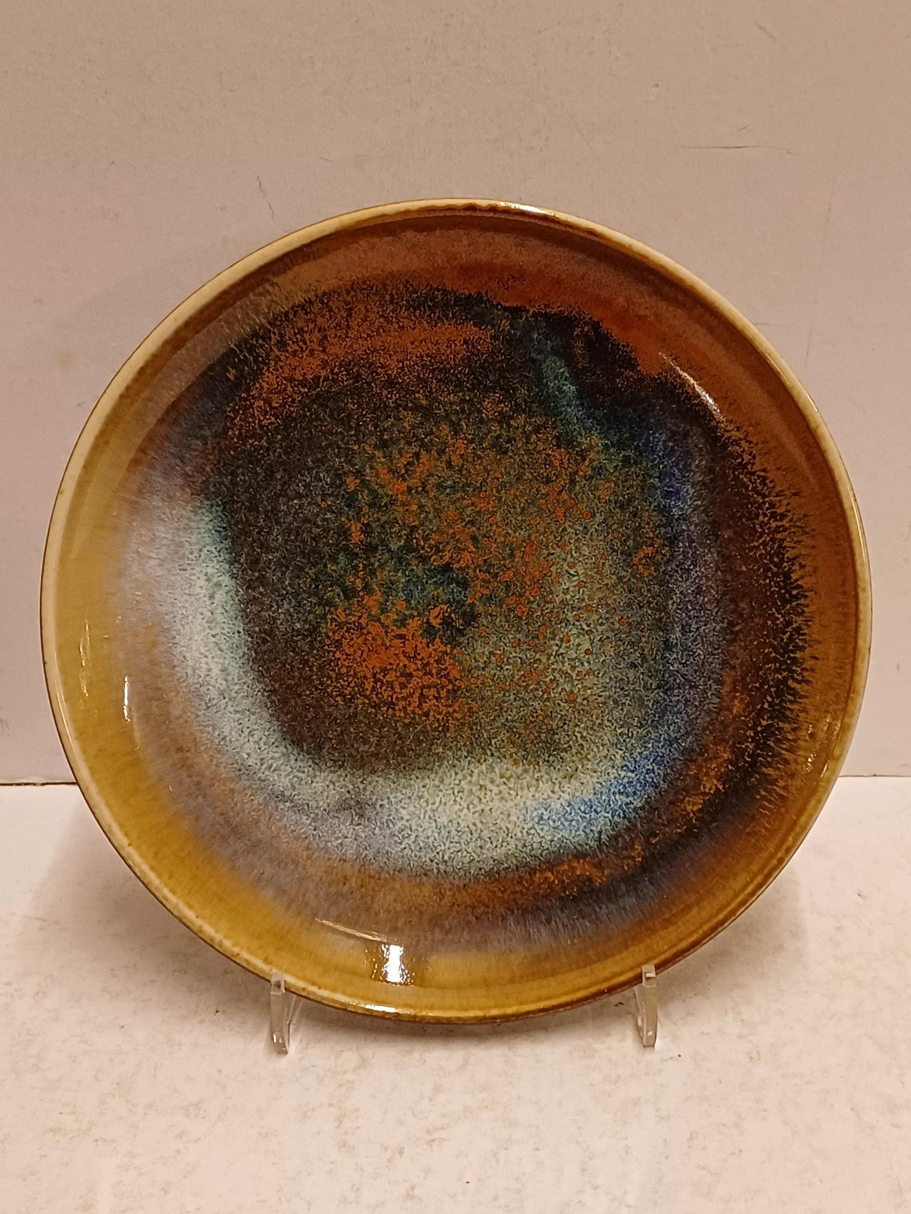 Aardewerken bord met gevlamde glazuur. Onderzijde met fabrieksmerk.