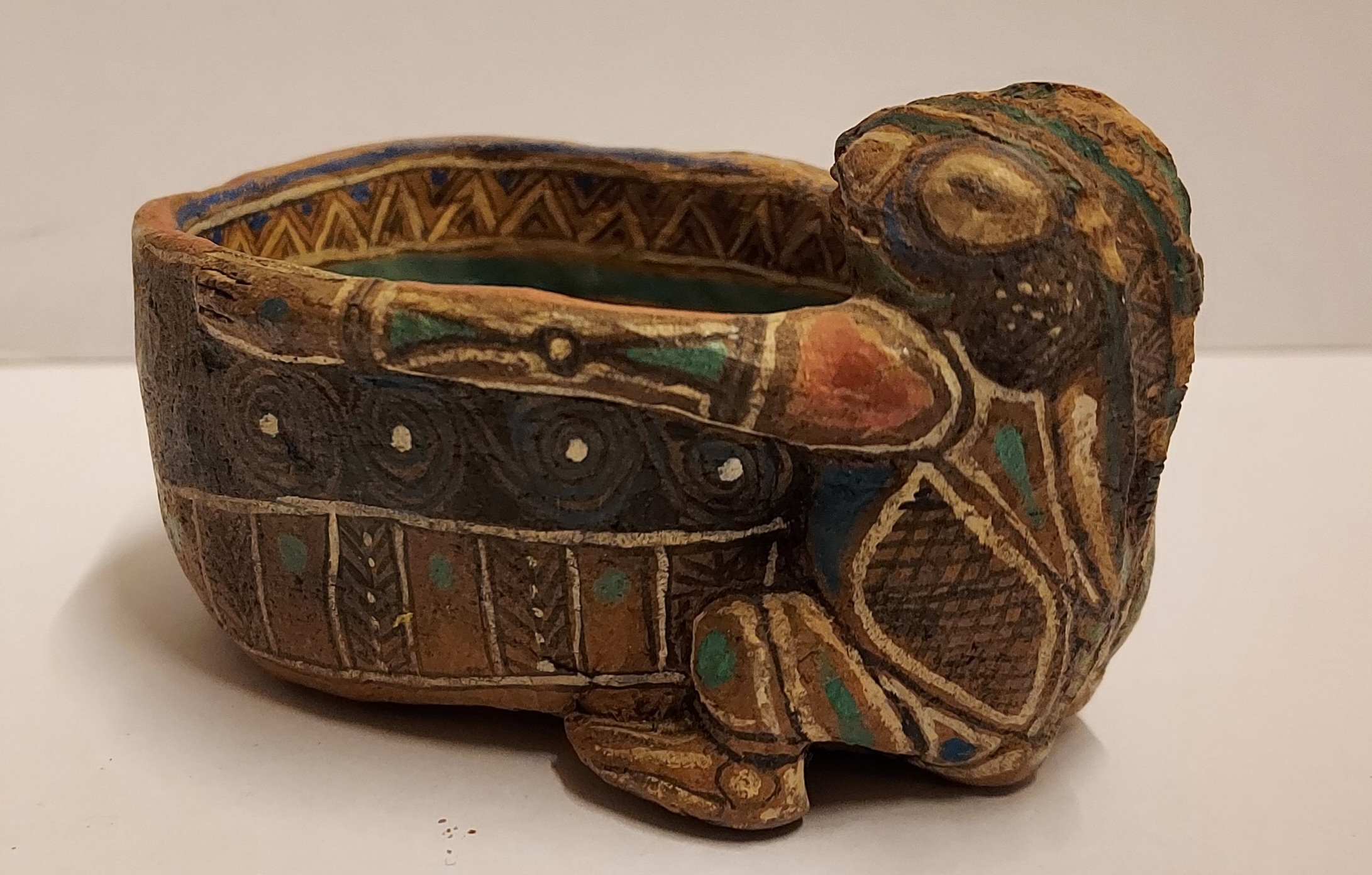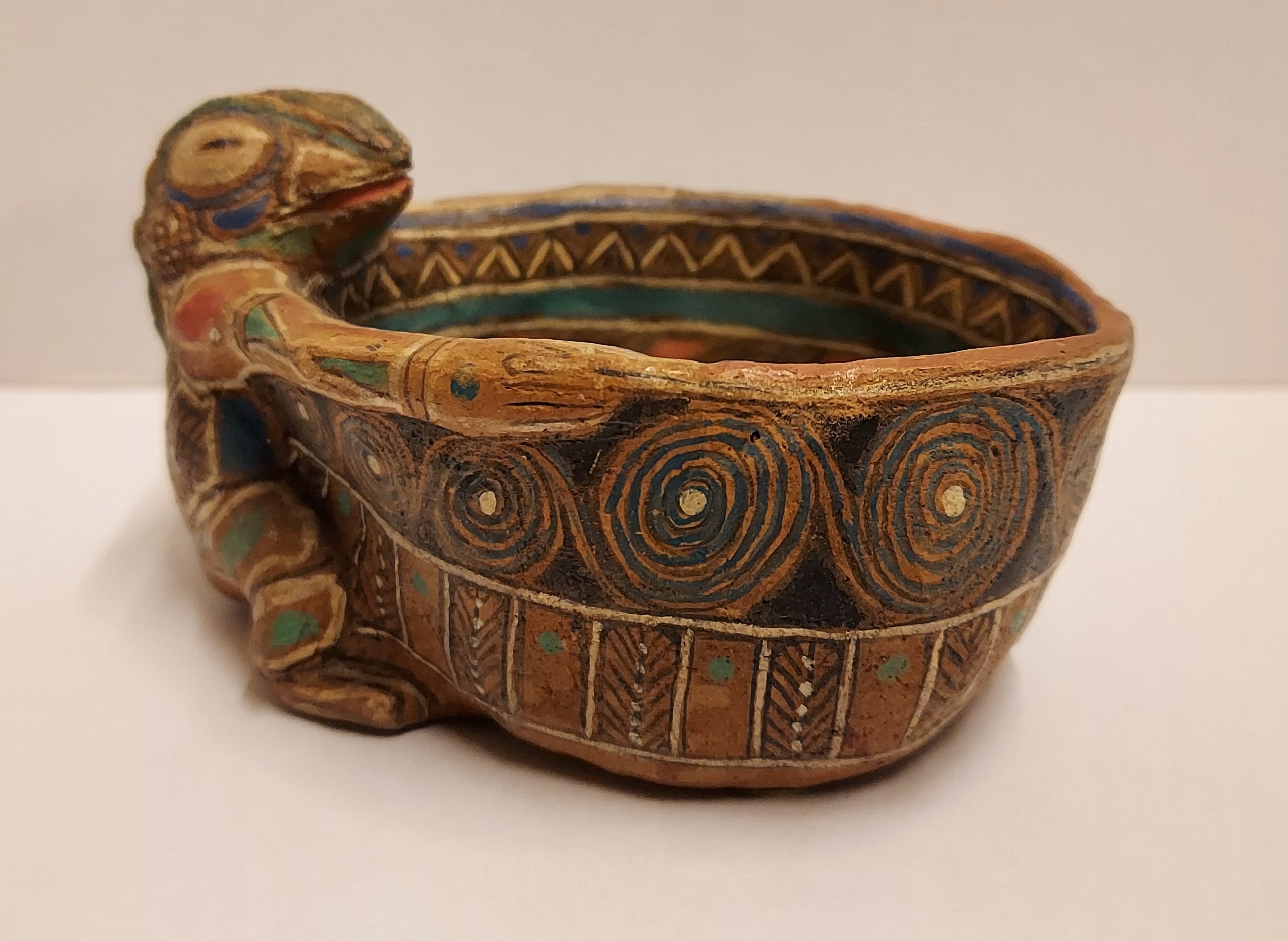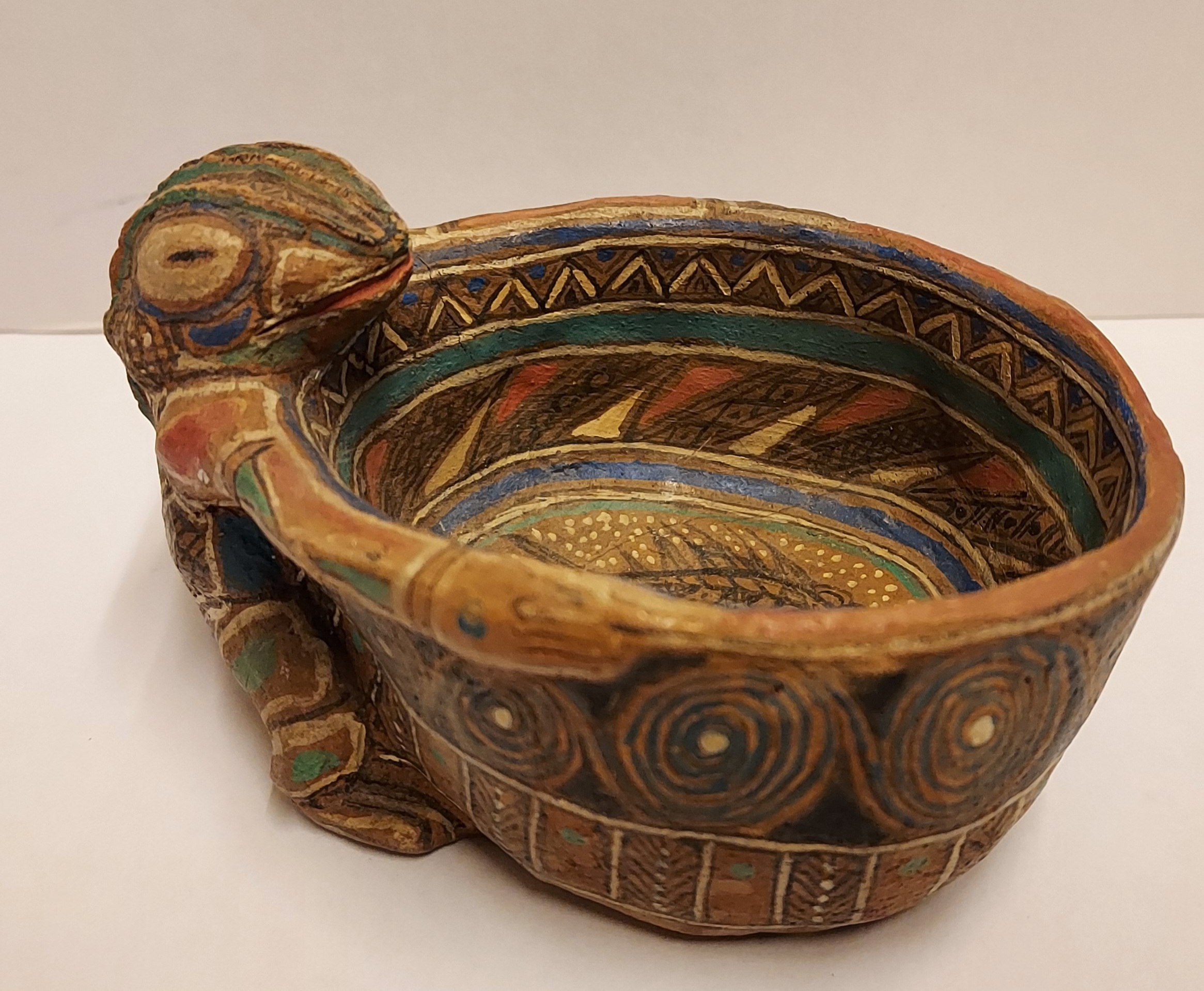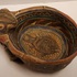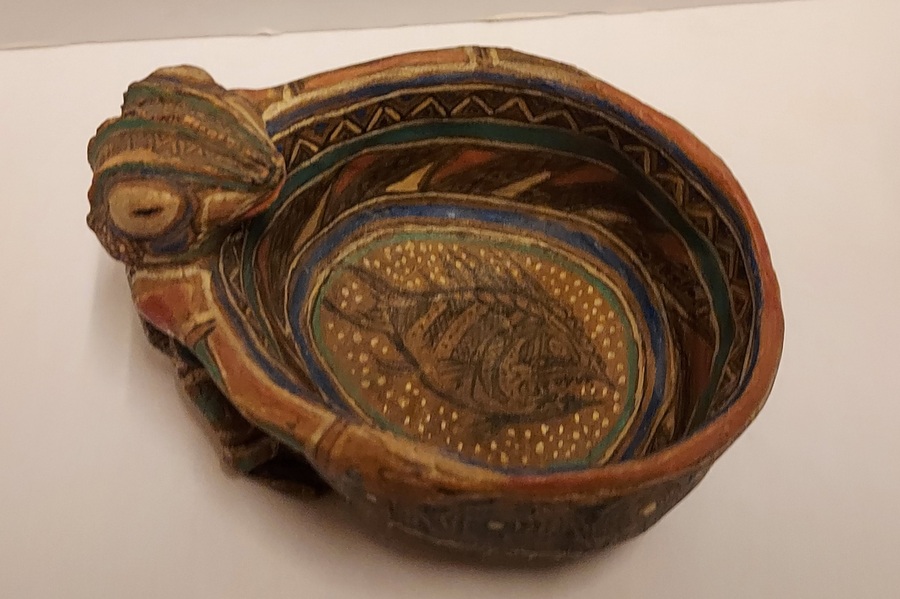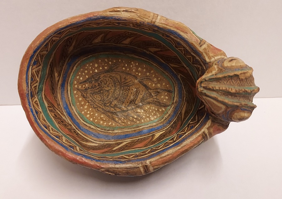 Pièce en terre cuite façonnée à la main, appelée Kikkerbakje. Argile rouge clair cuite et décorée à froid avec un ornement géométrique en blanc, rouge, vert et noir. Au fond, un dessin de poisson. Non signé. Ex collection J.W.N. van Agterbergh.