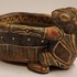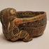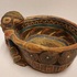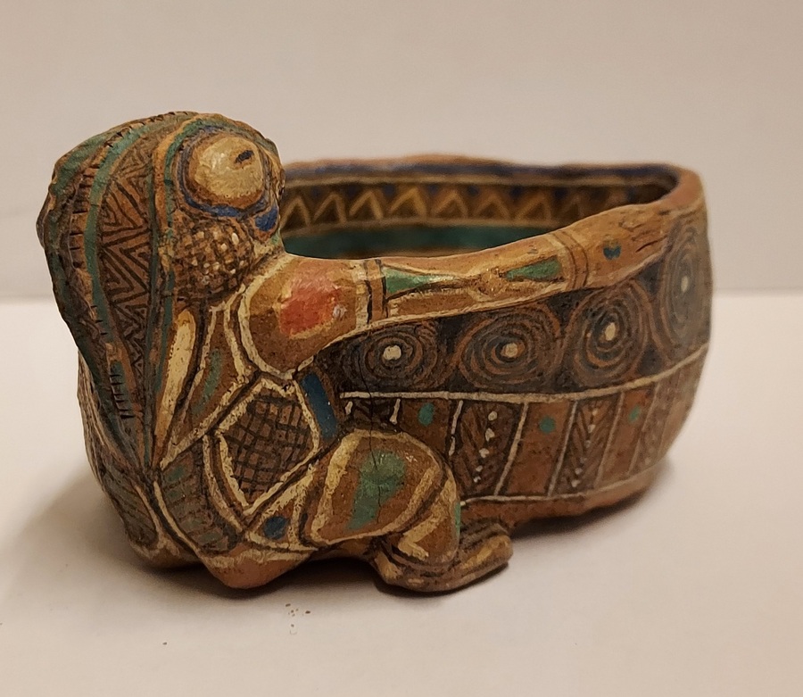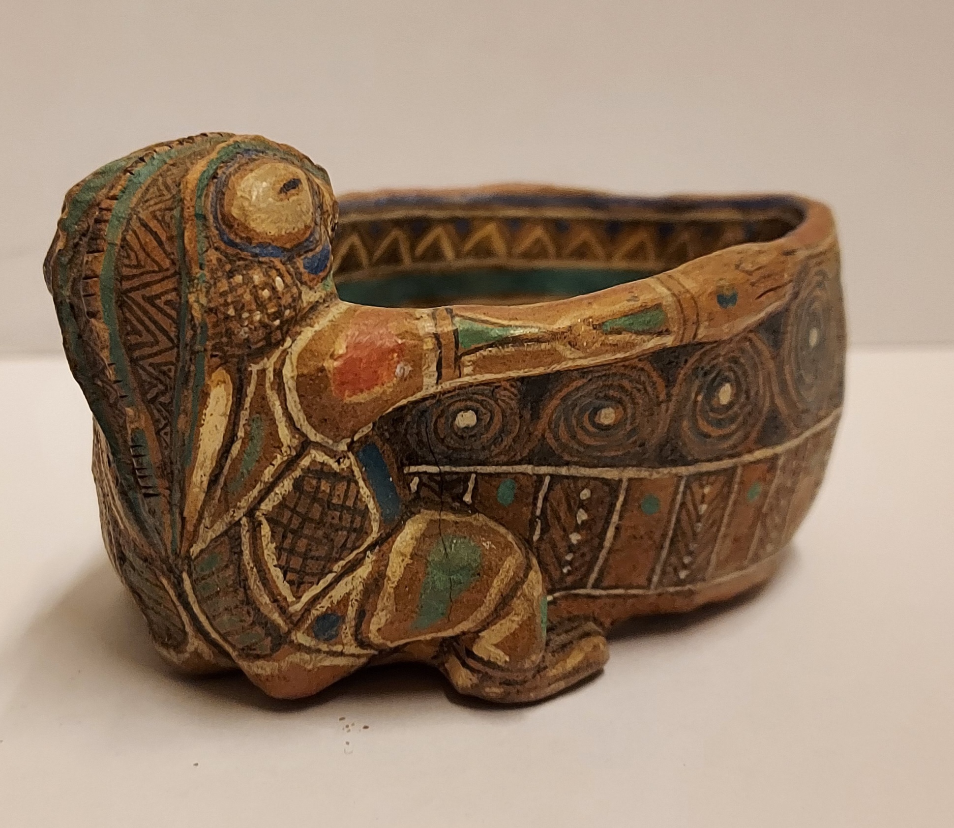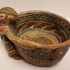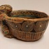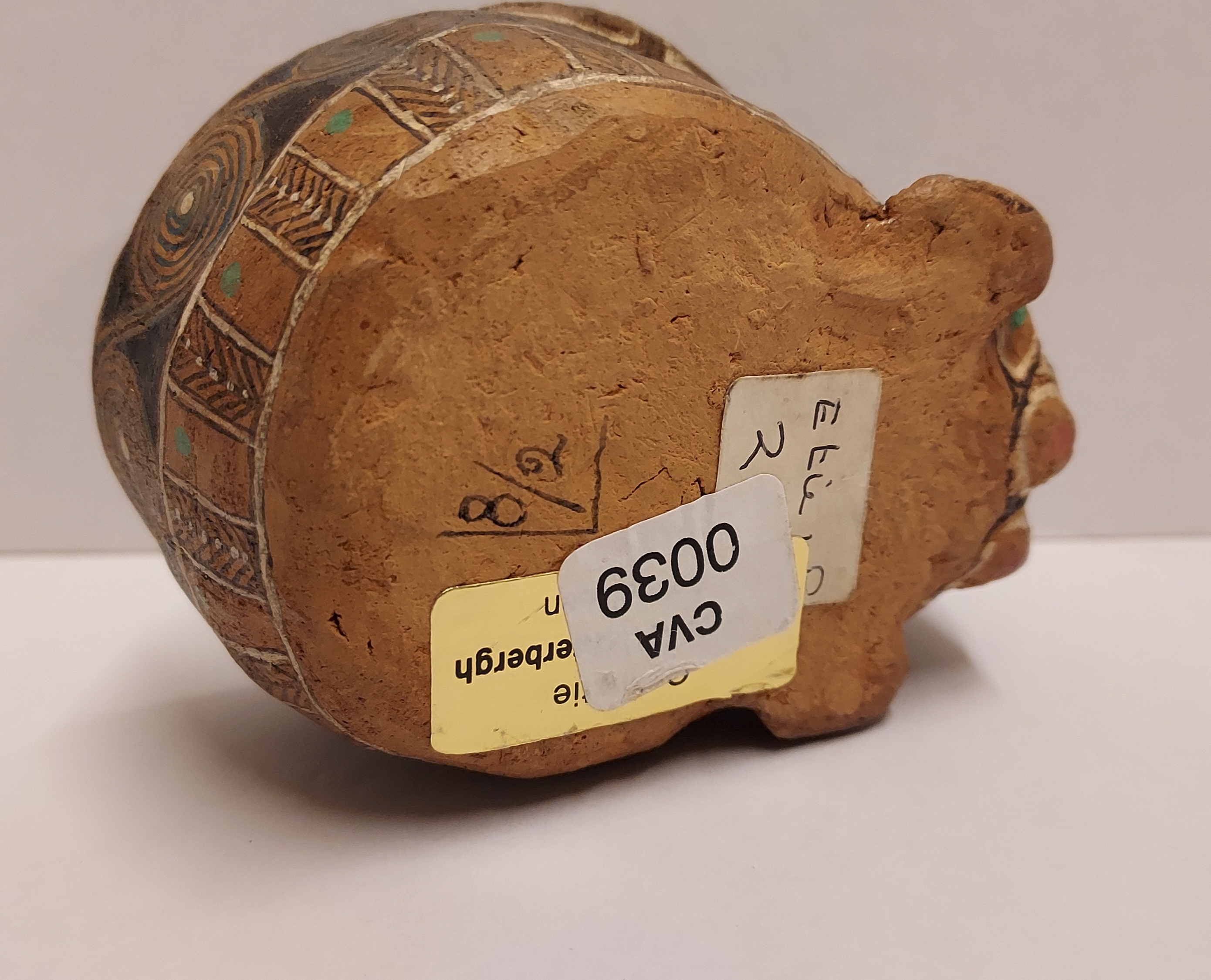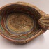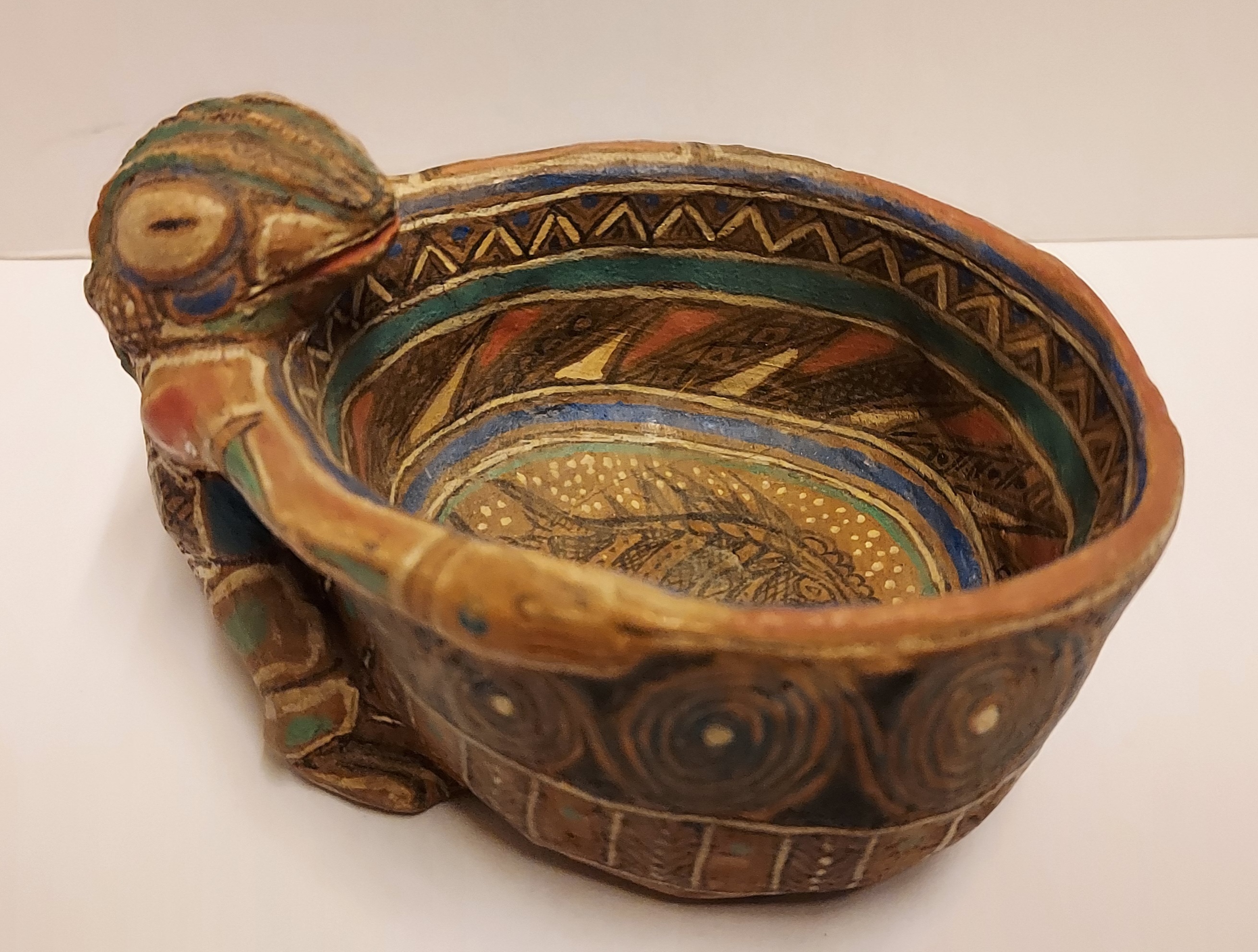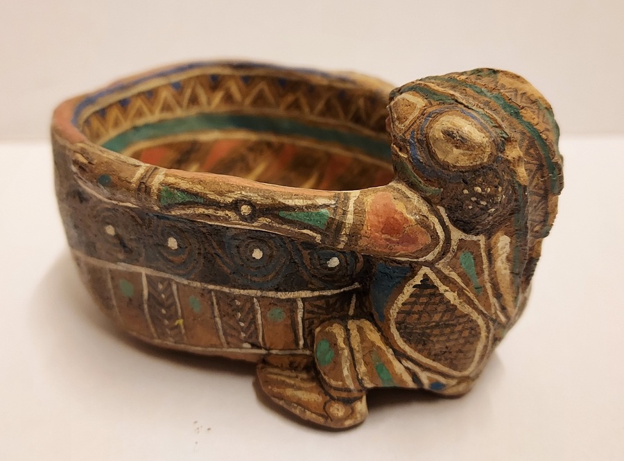 Pièce en terre cuite façonnée à la main, appelée Kikkerbakje. Argile rouge clair cuite et décorée à froid avec un ornement géométrique en blanc, rouge, vert et noir. Au fond, un dessin de poisson. Non signé. Ex collection J.W.N. van Agterbergh.