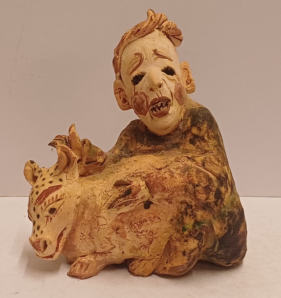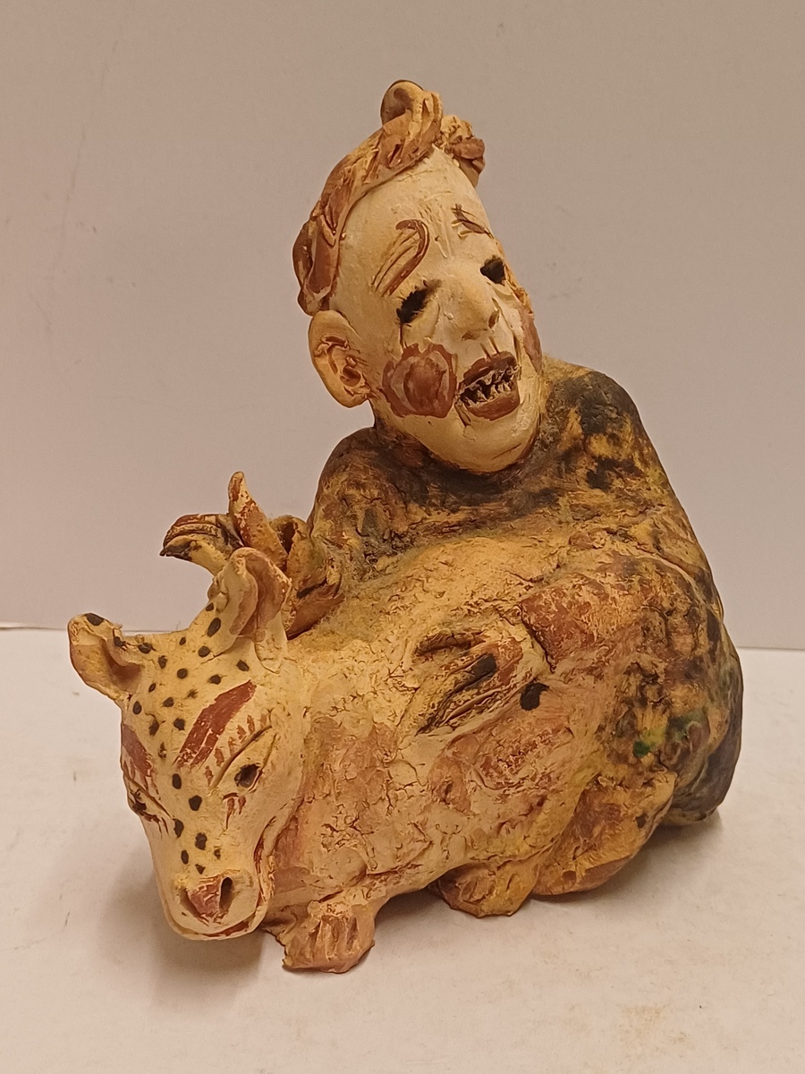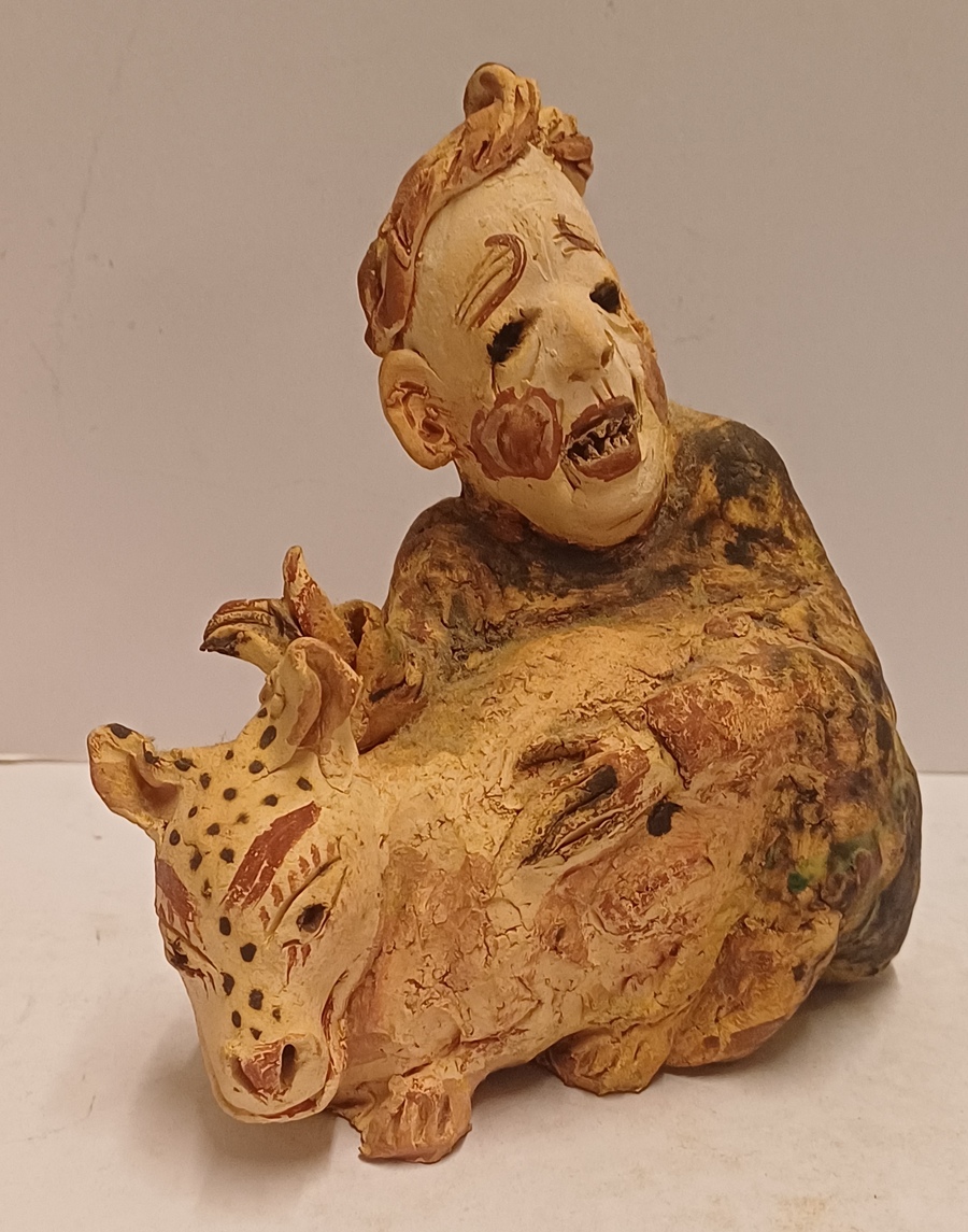 Aardewerken handgevormde sculptuurtje van een jongen met rund. Onderzijde gesigneerd en schets