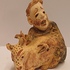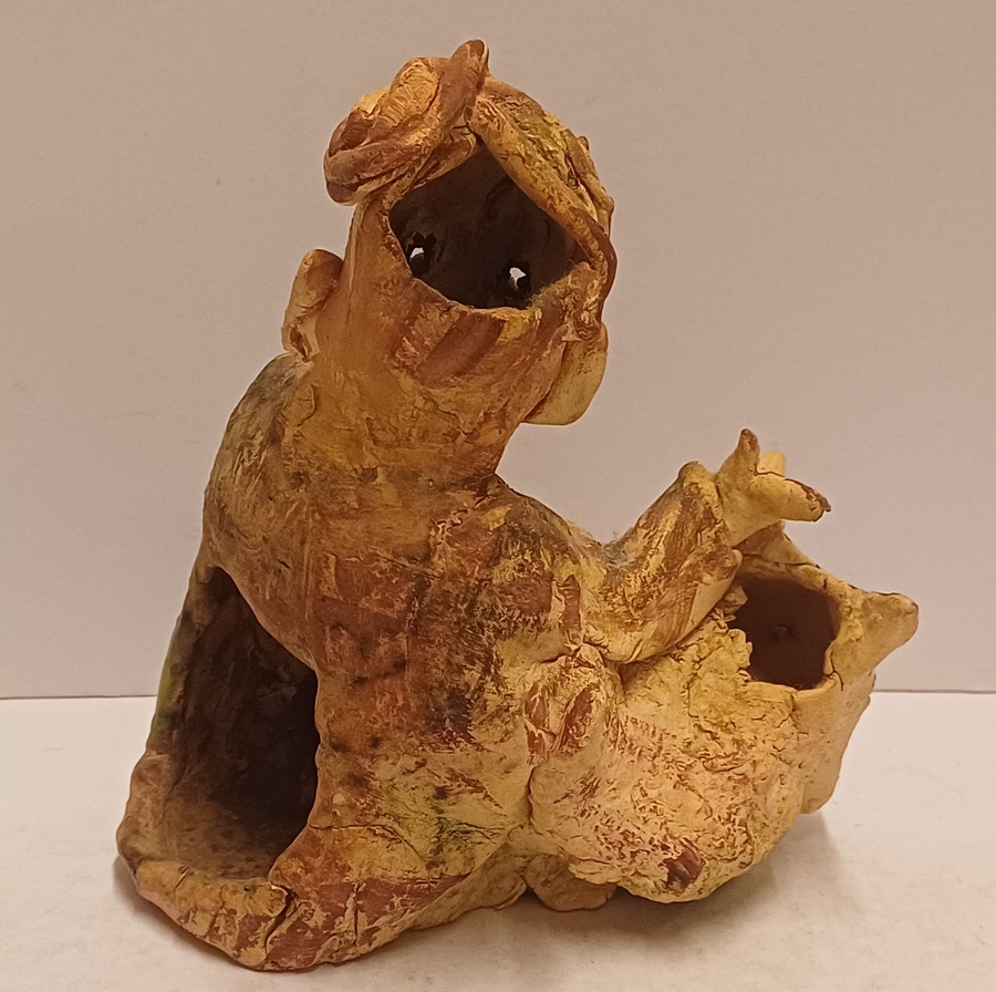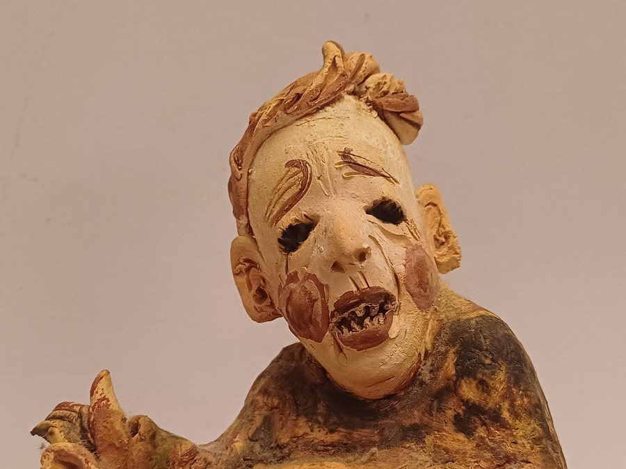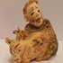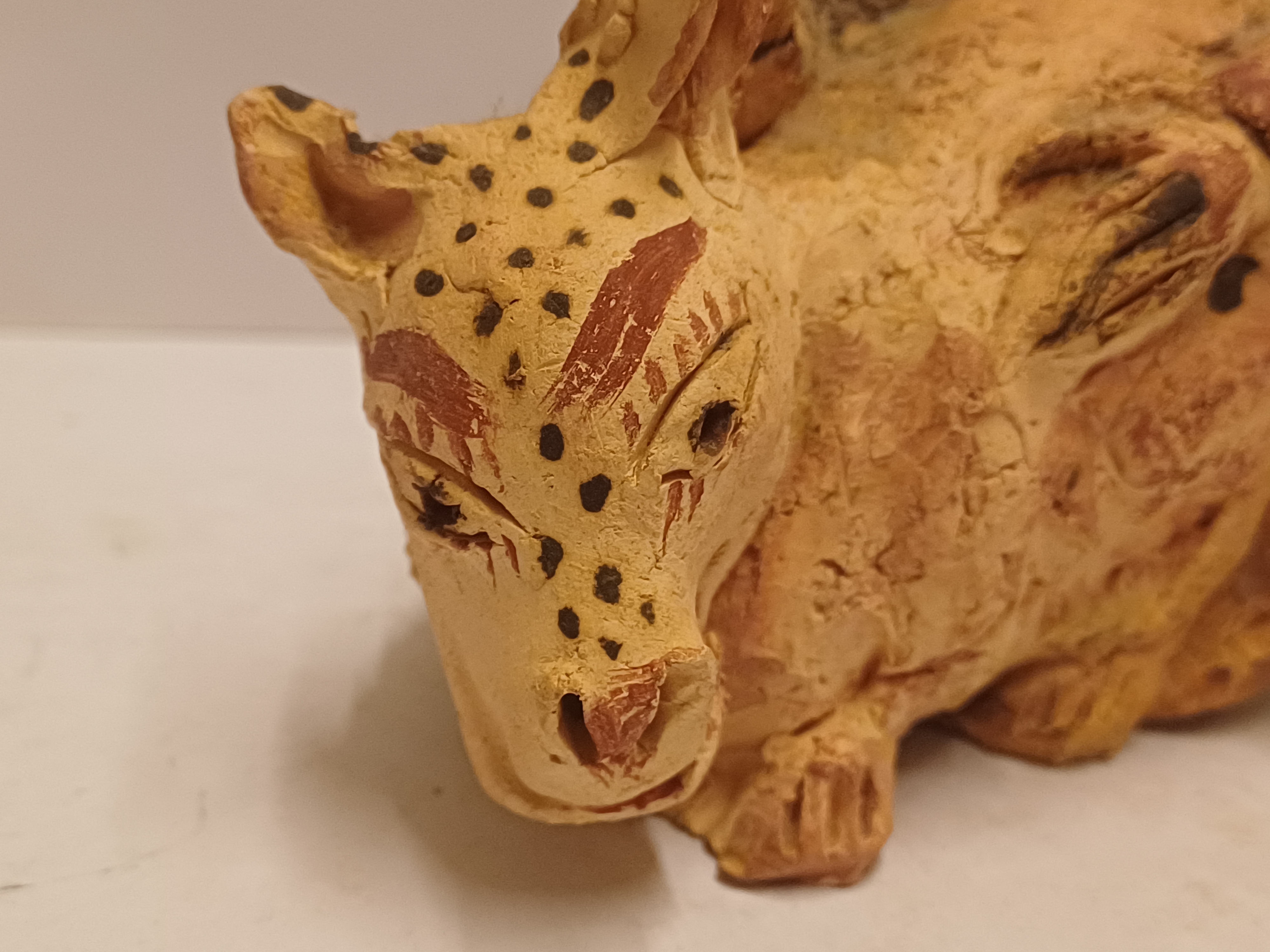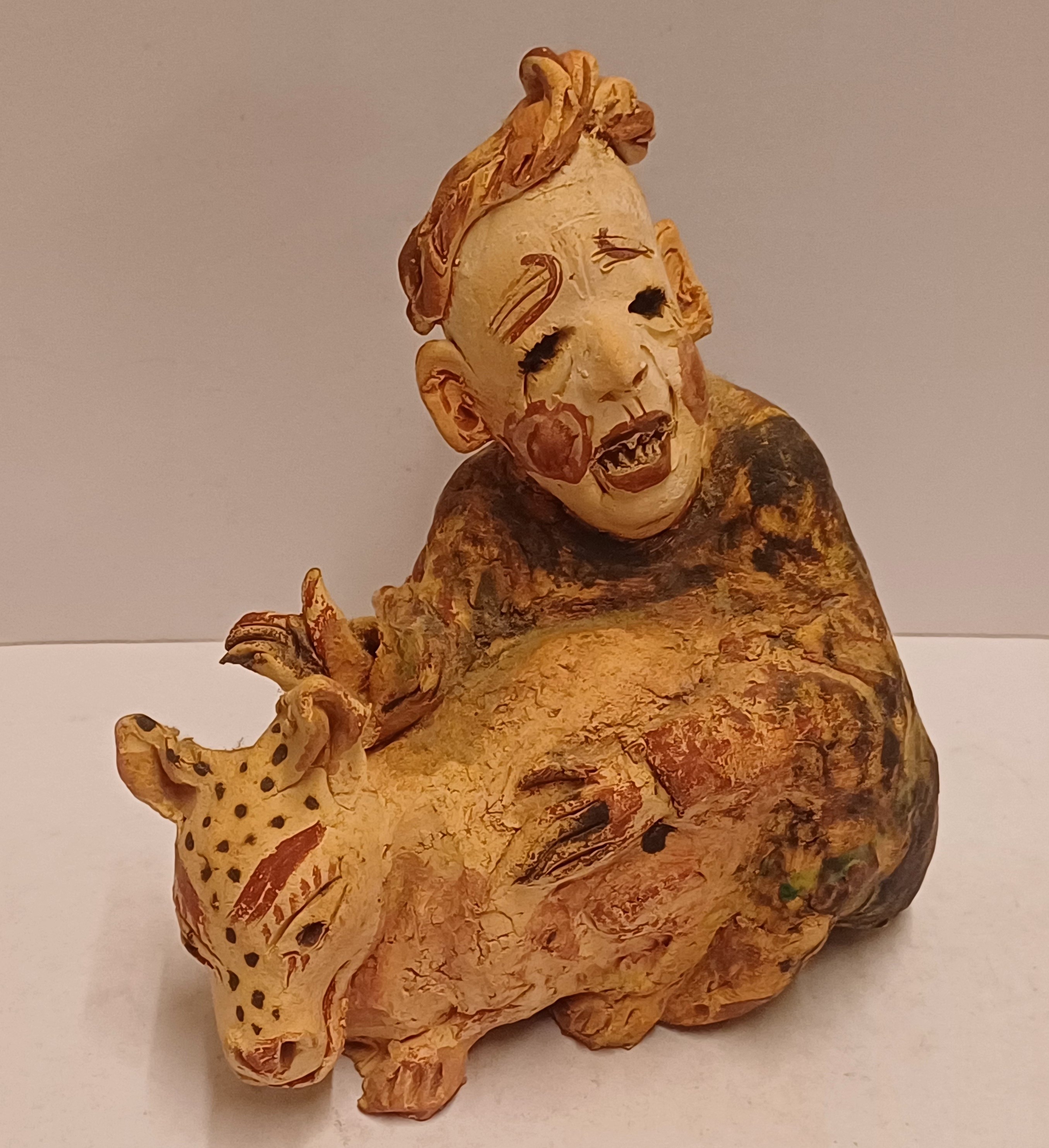 Aardewerken handgevormde sculptuurtje van een jongen met rund. Onderzijde gesigneerd en schets