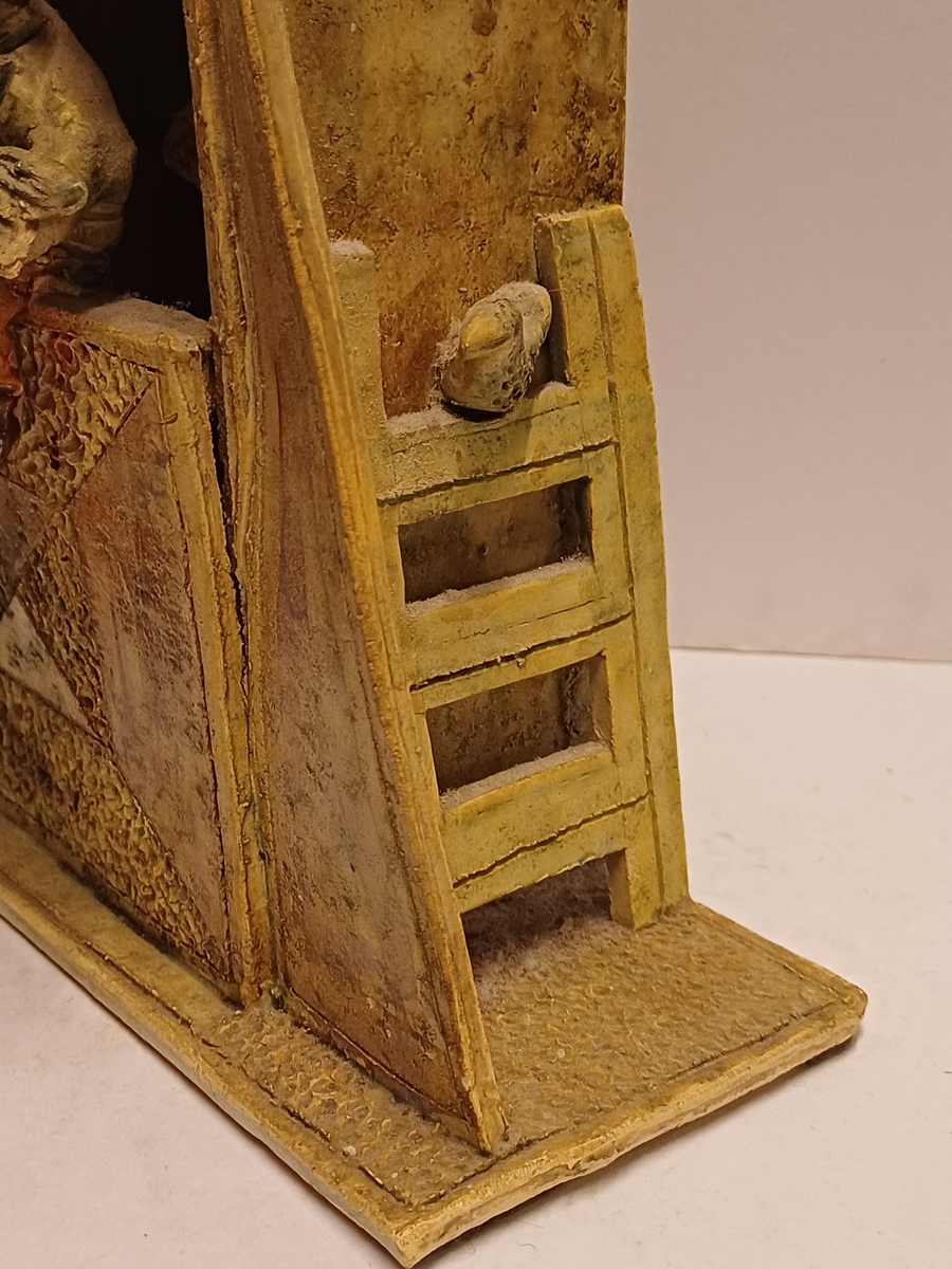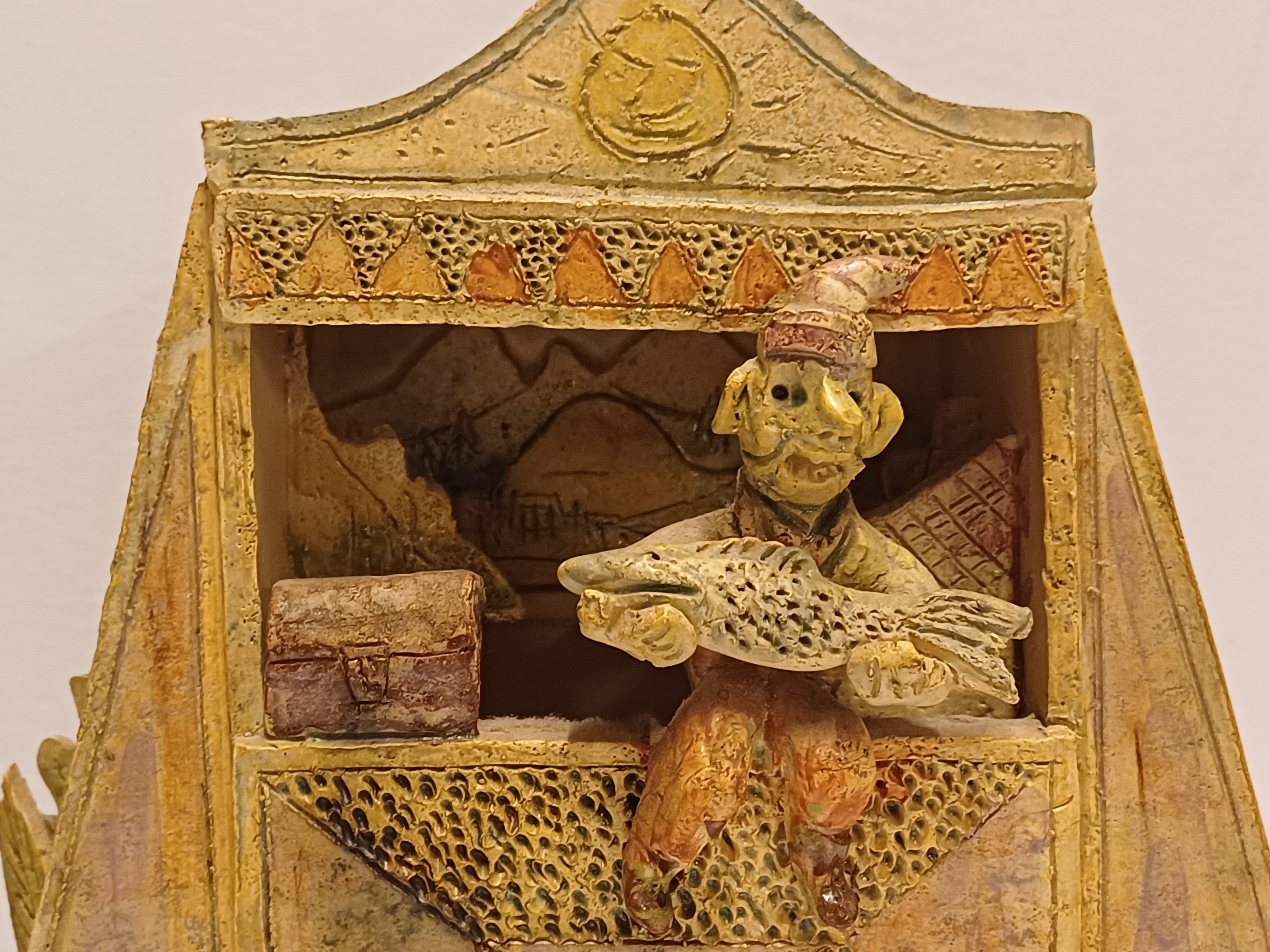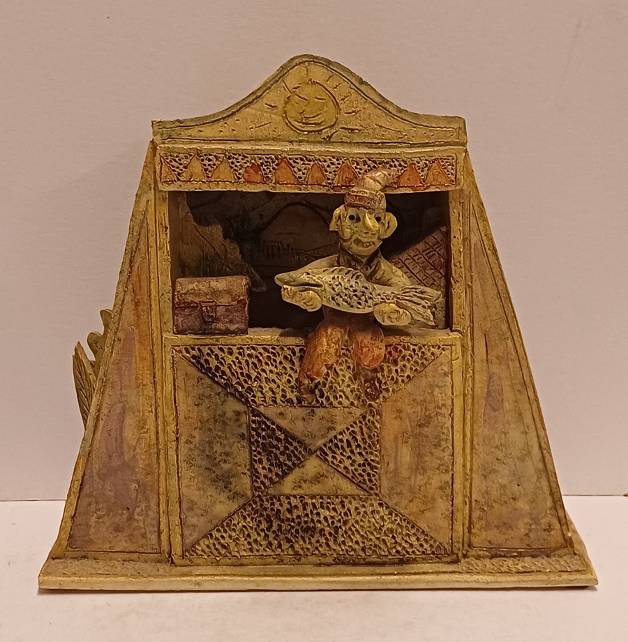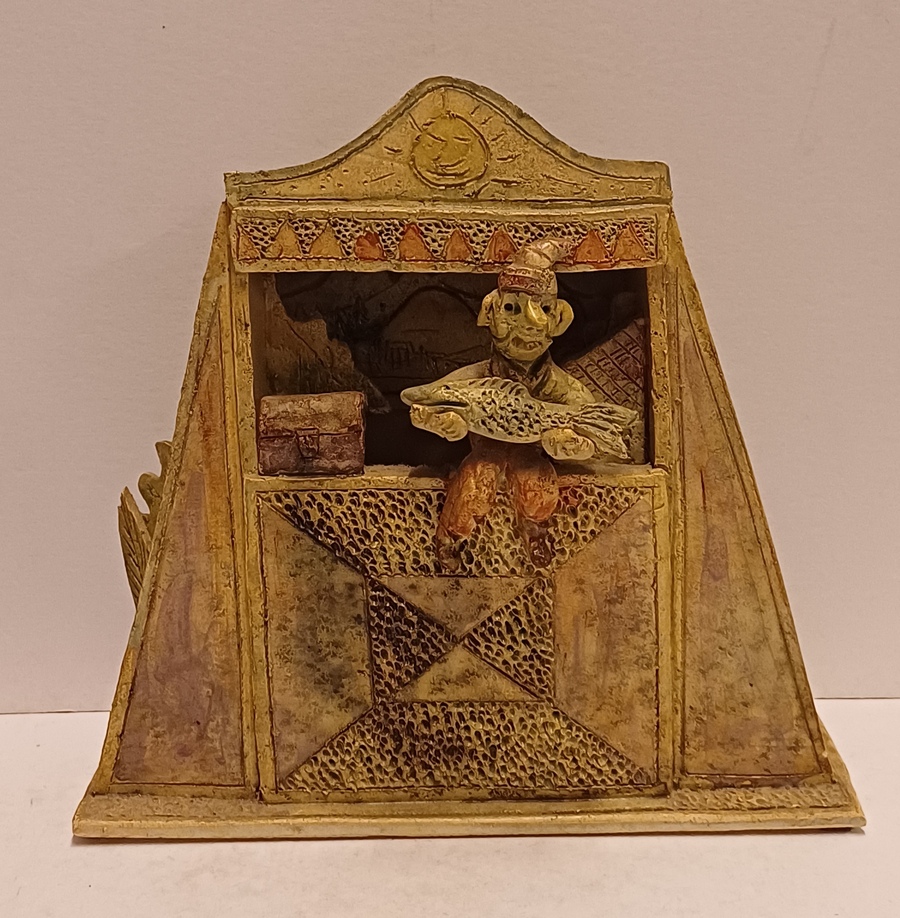 Aardewerken poppenkast, met Jan Klaassen met een vis in de hand. Met groenige glazuur. Achterzijde gesigneerd