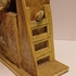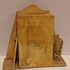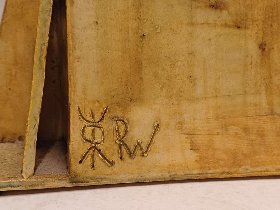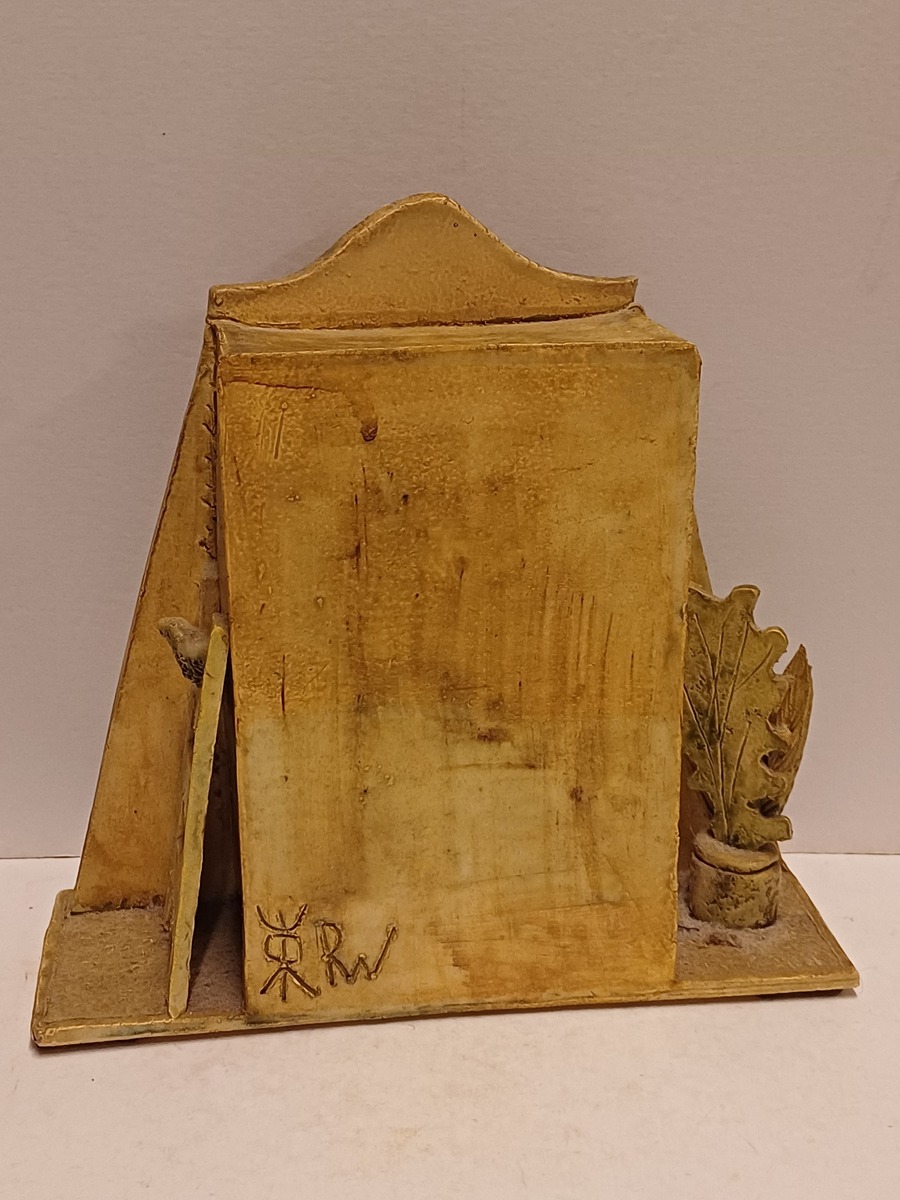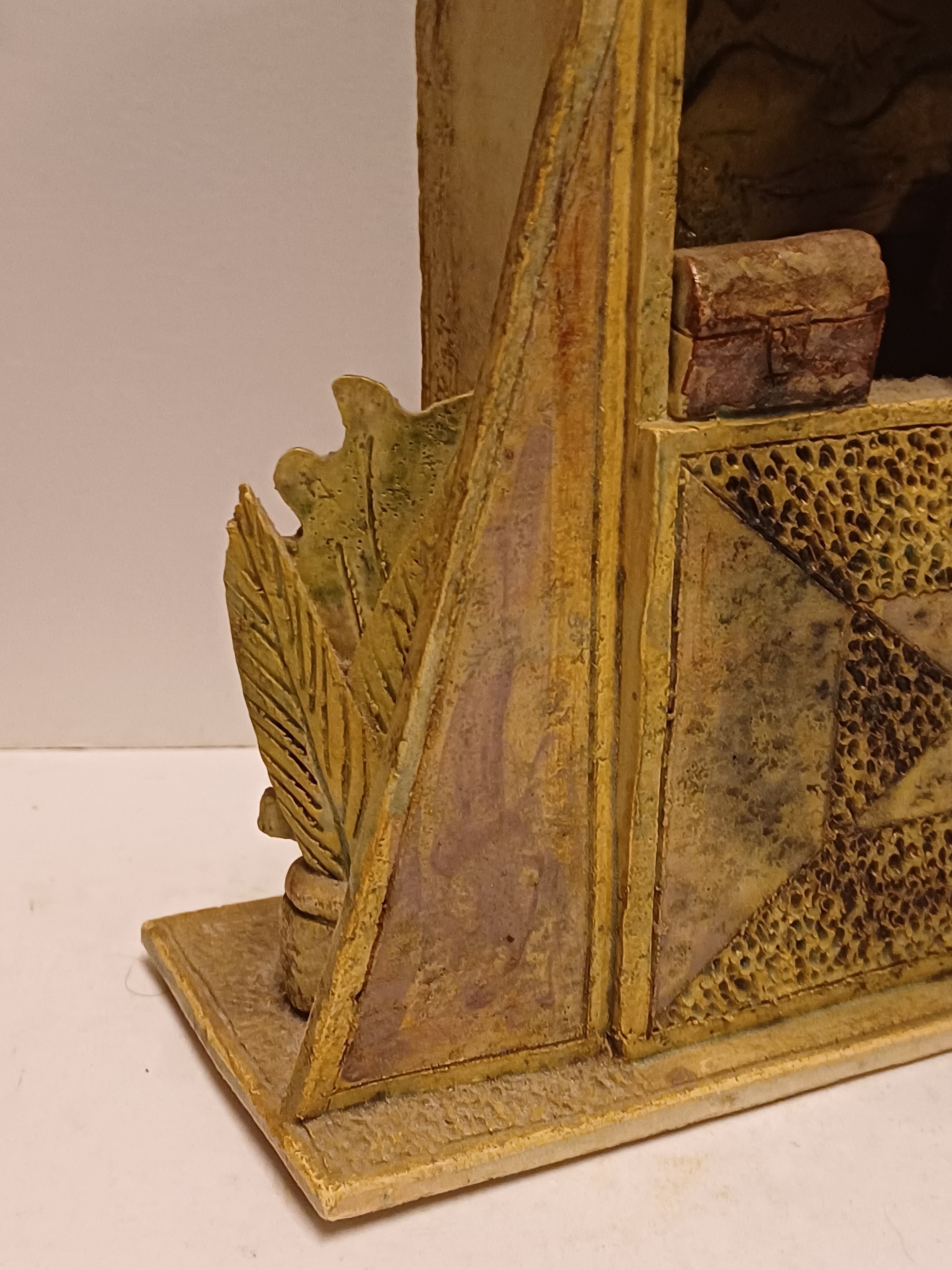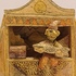 Aardewerken poppenkast, met Jan Klaassen met een vis in de hand. Met groenige glazuur. Achterzijde gesigneerd