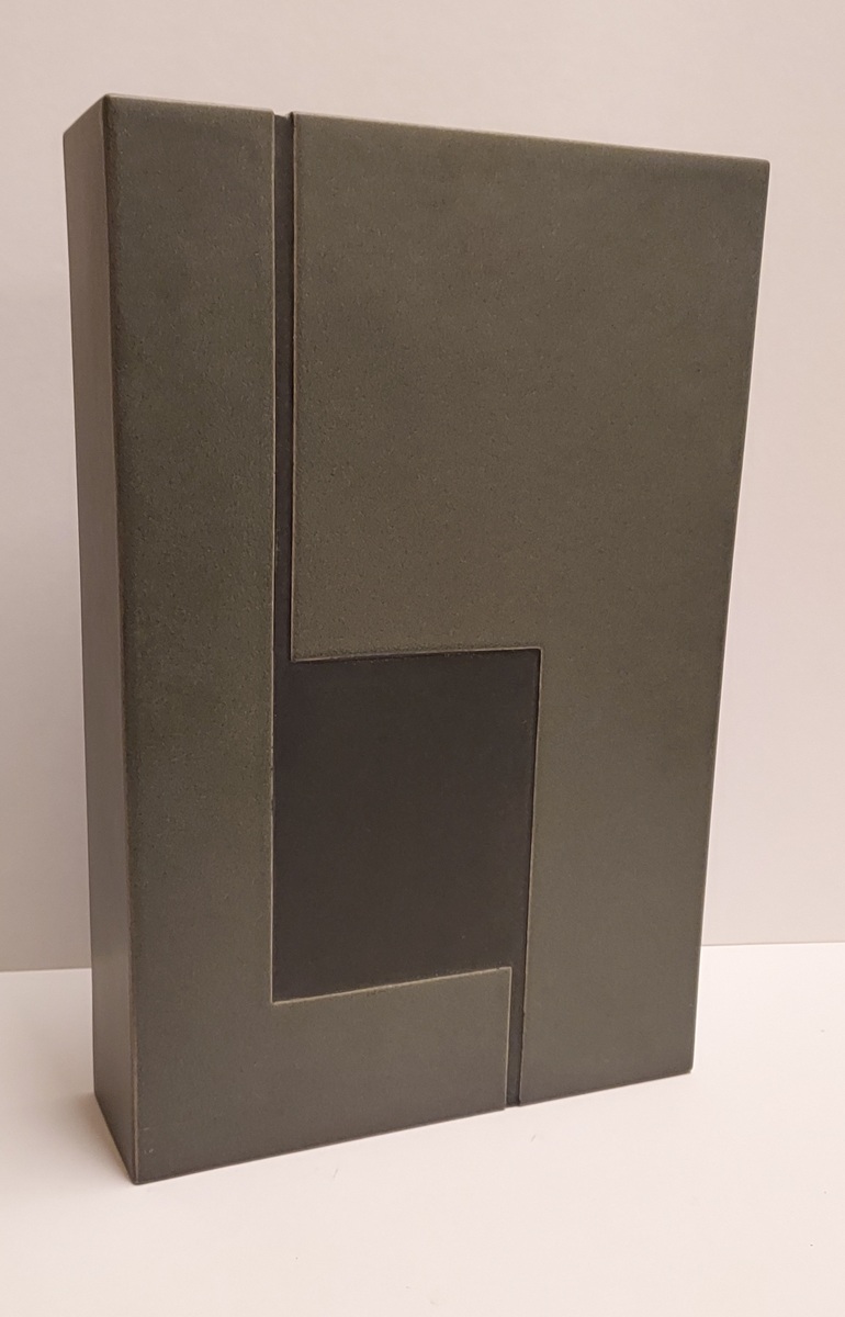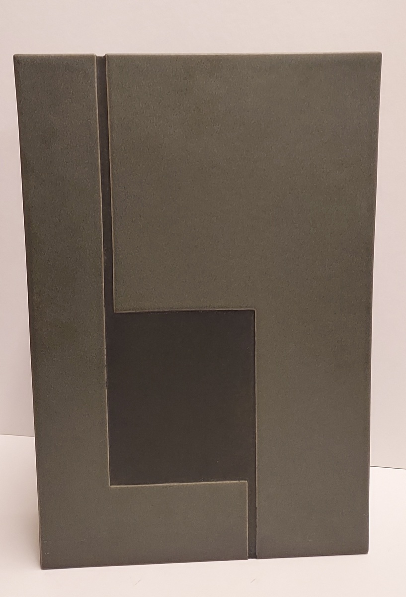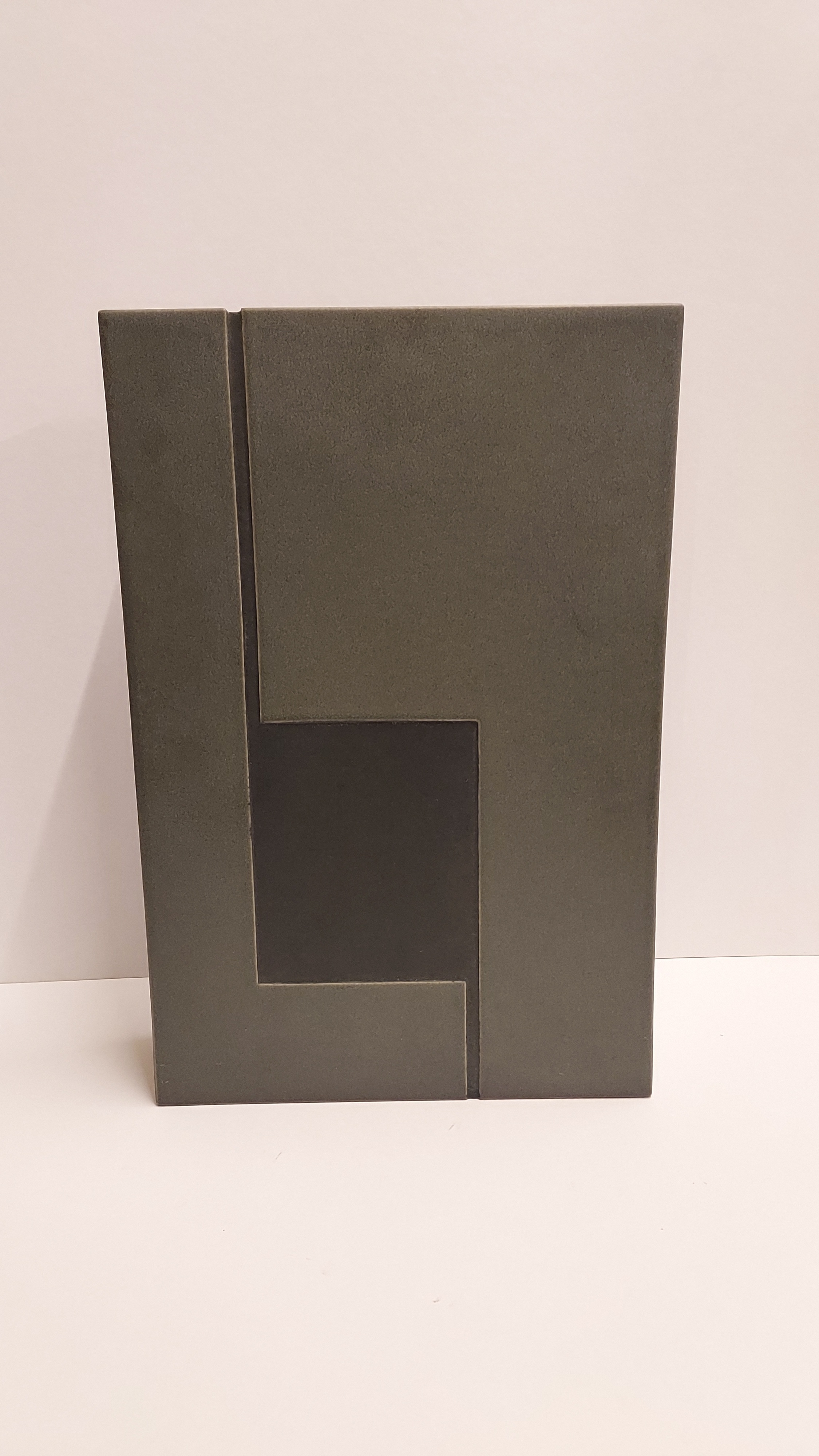 Sculpture en forme de bloc rectangulaire avec une surface grise et un rétrécissement. Signée et numérotée 156 sur le dessous.