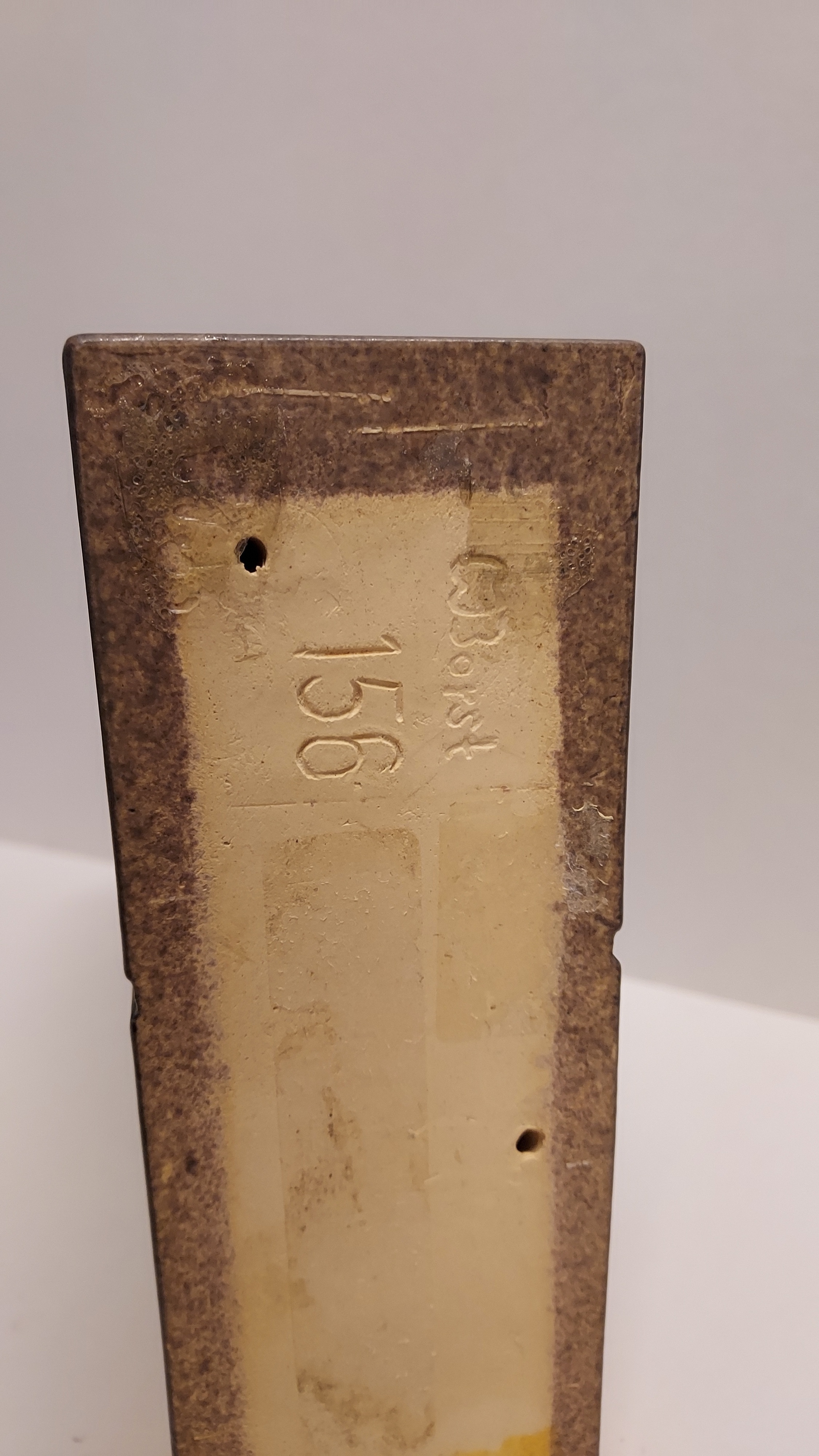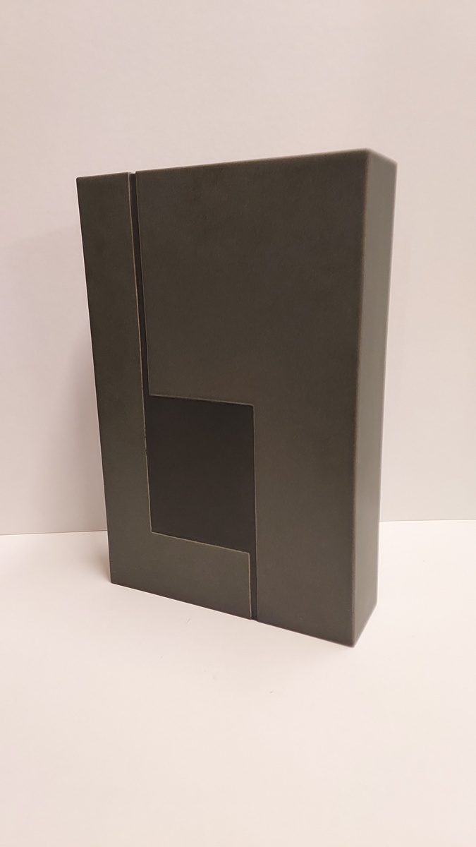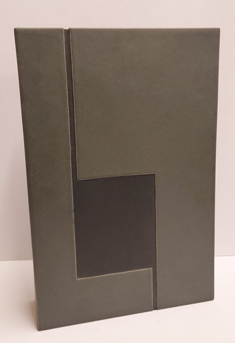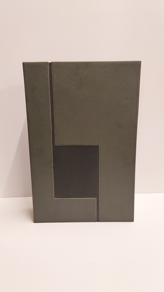 Sculpture en forme de bloc rectangulaire avec une surface grise et un rétrécissement. Signée et numérotée 156 sur le dessous.