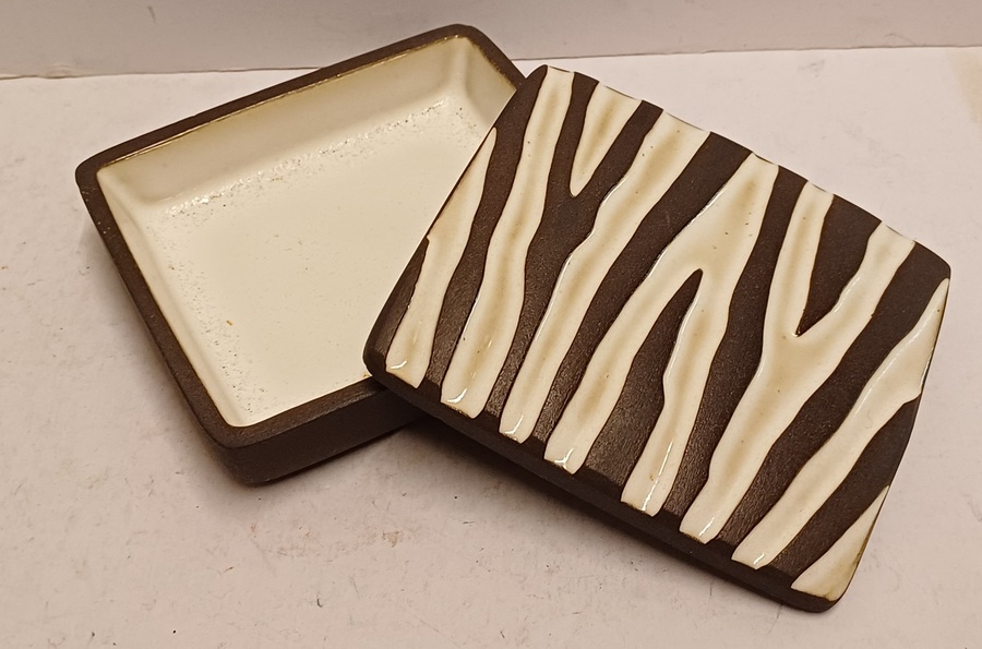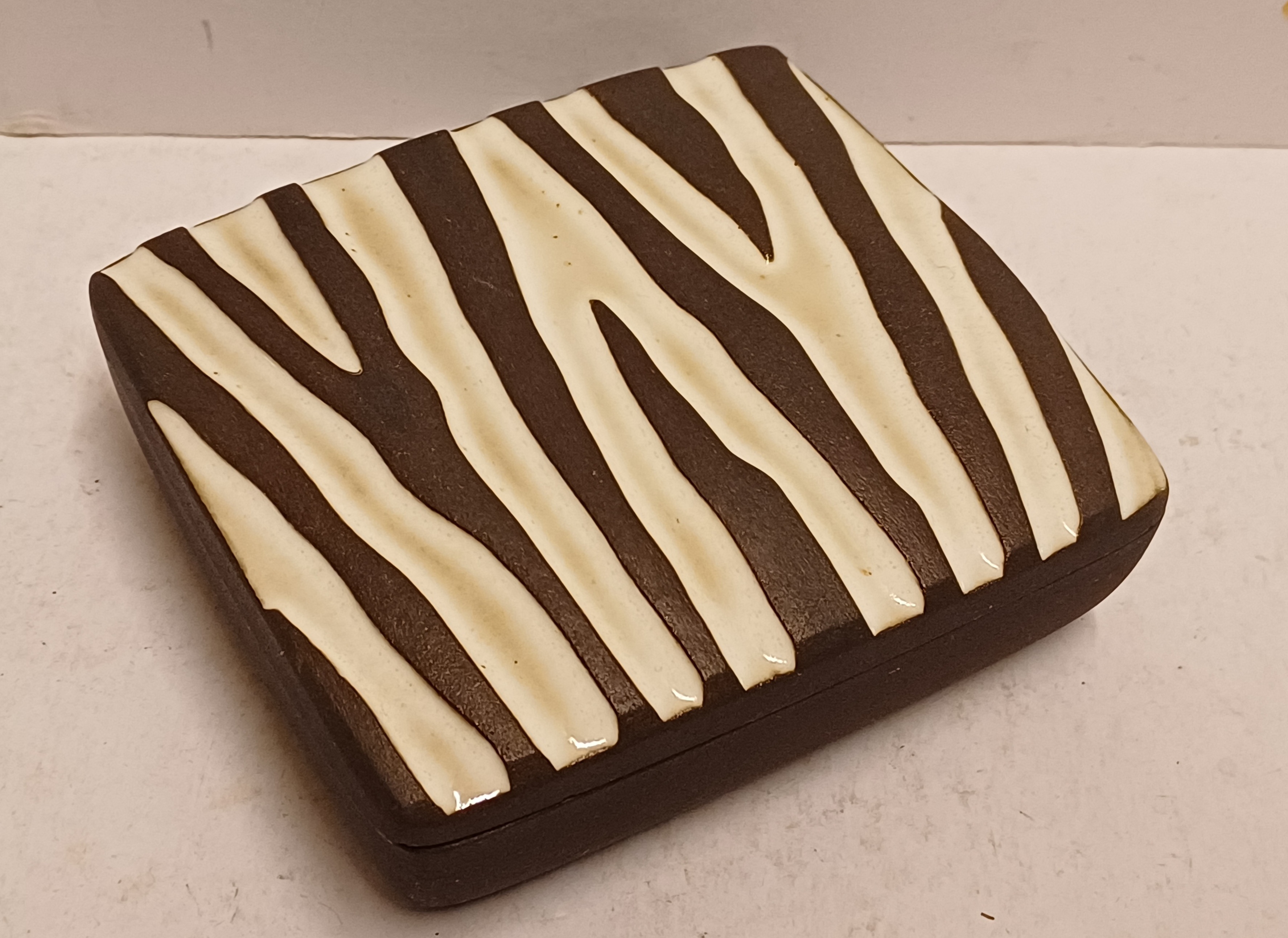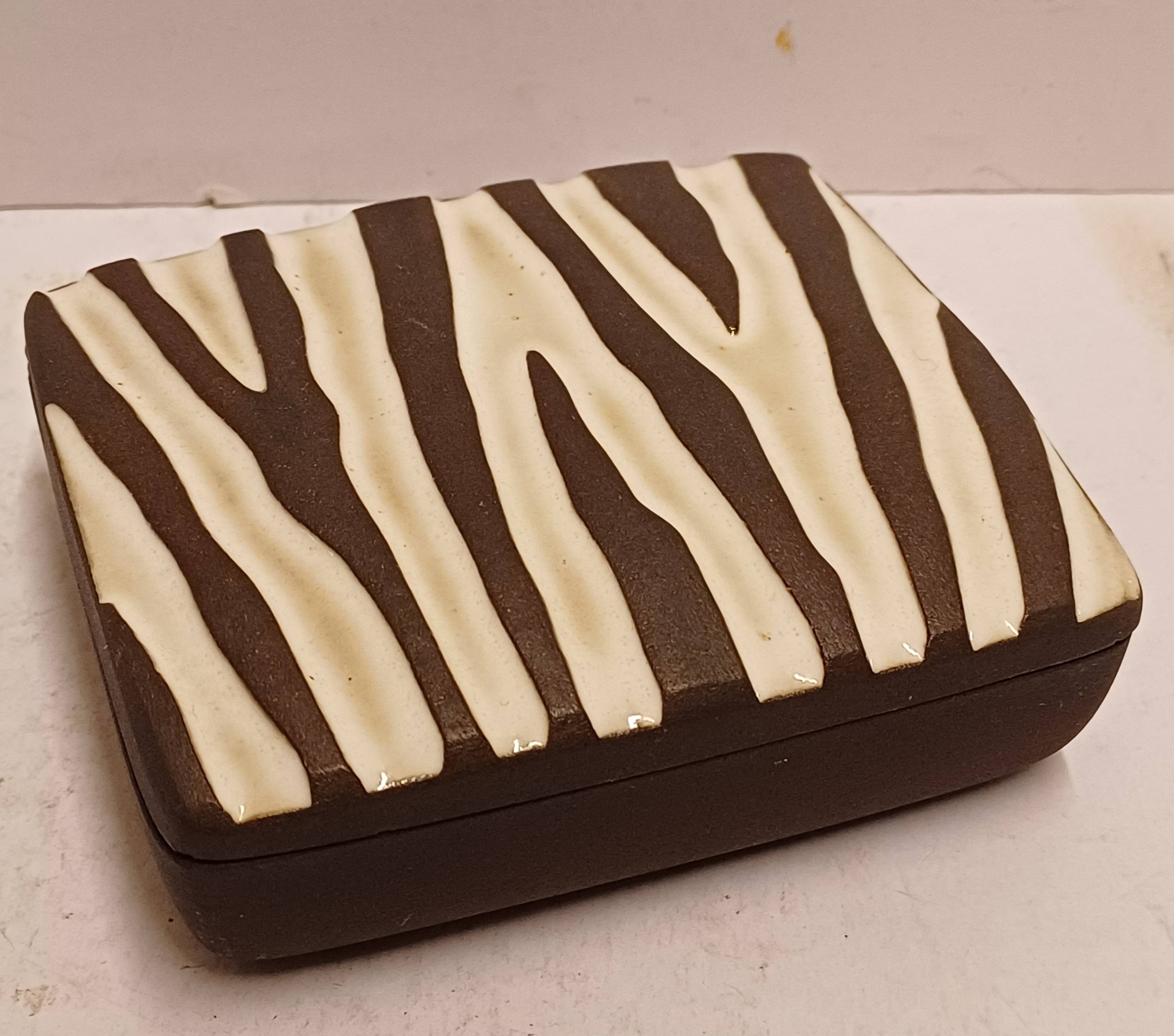 Boîte à couvercle en argile brune avec un motif de zèbre blanc glacé sur le couvercle. Dessous signé et numéroté.