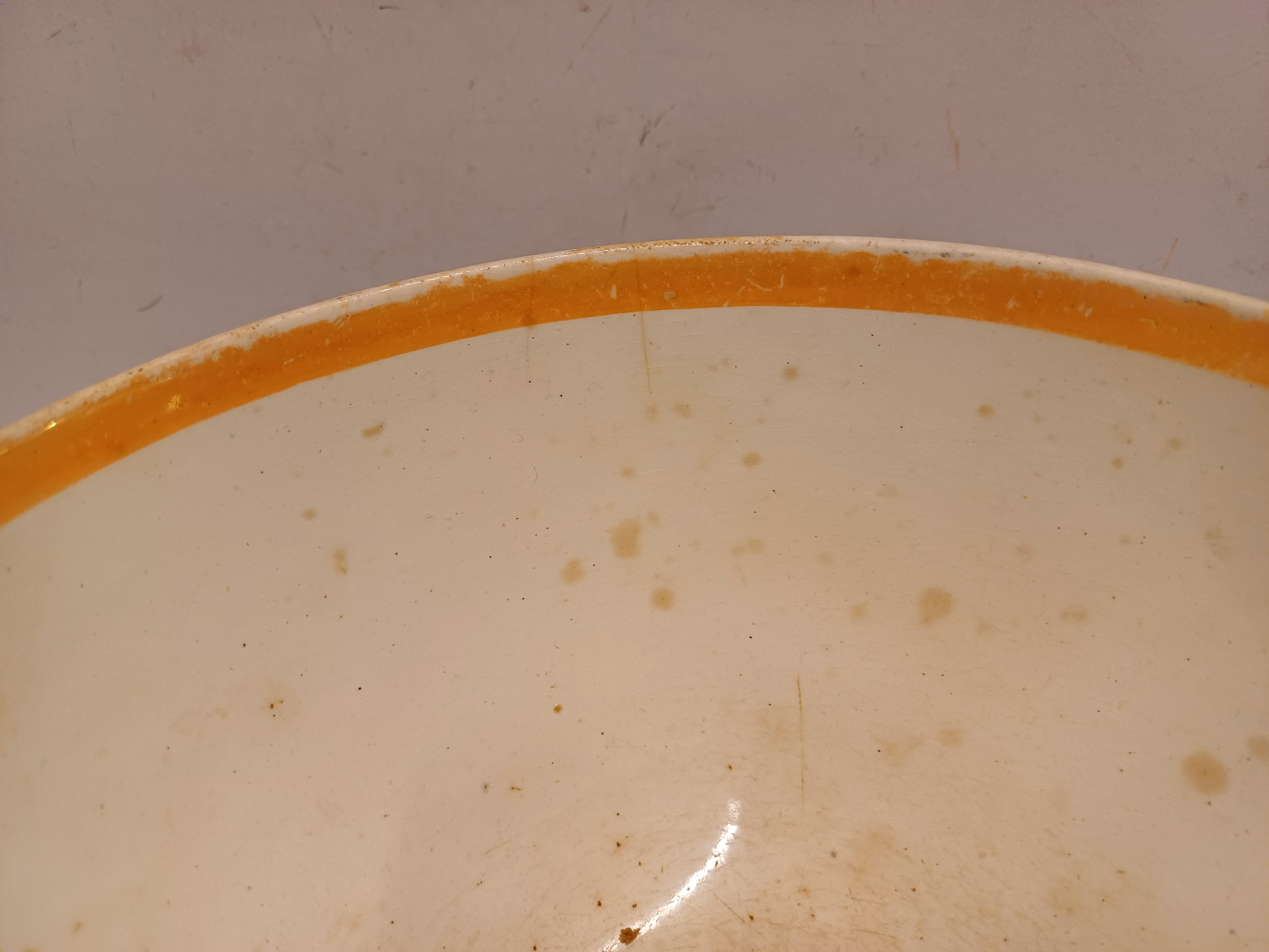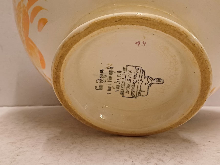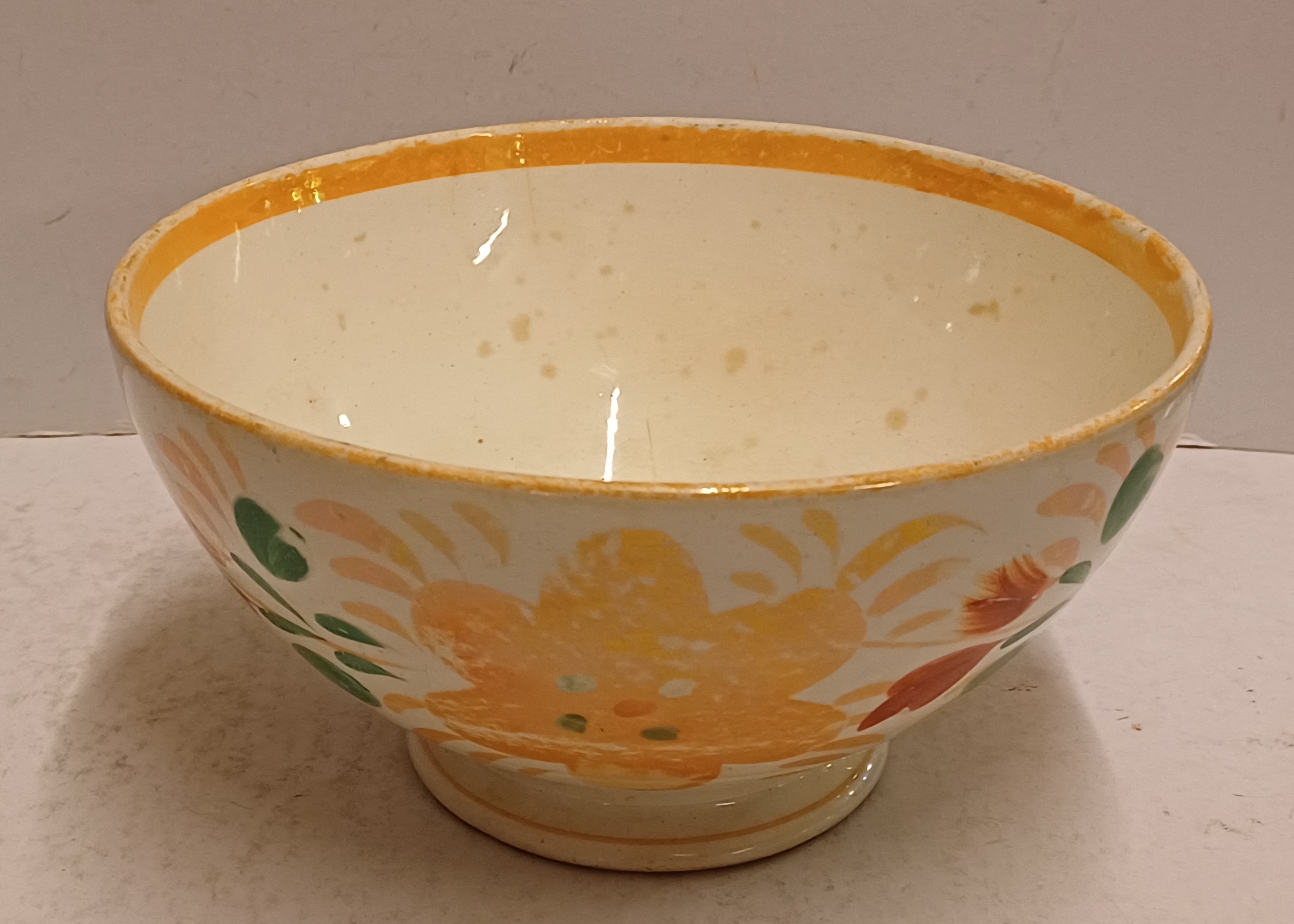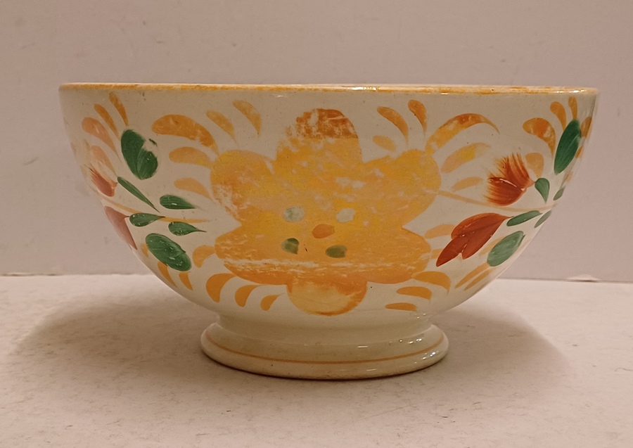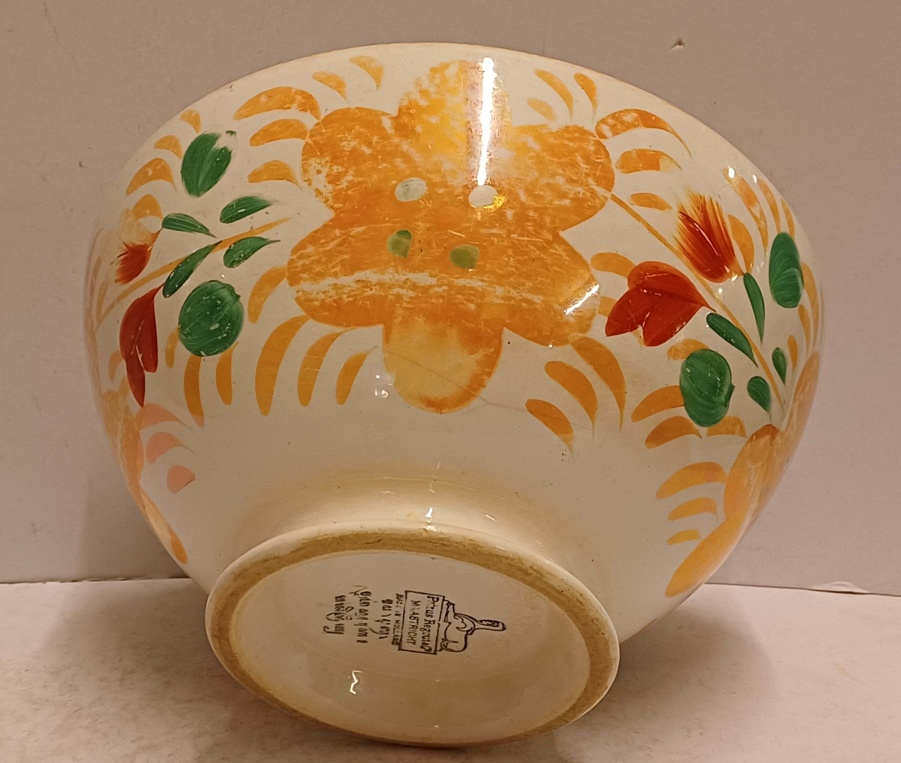 Spoelkom met luster decor Boerenbont en rode en groene blaadjes. Onderzijde met fabrieksmerk en javaans export merk.