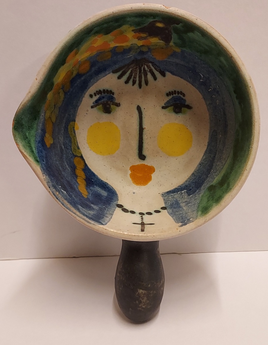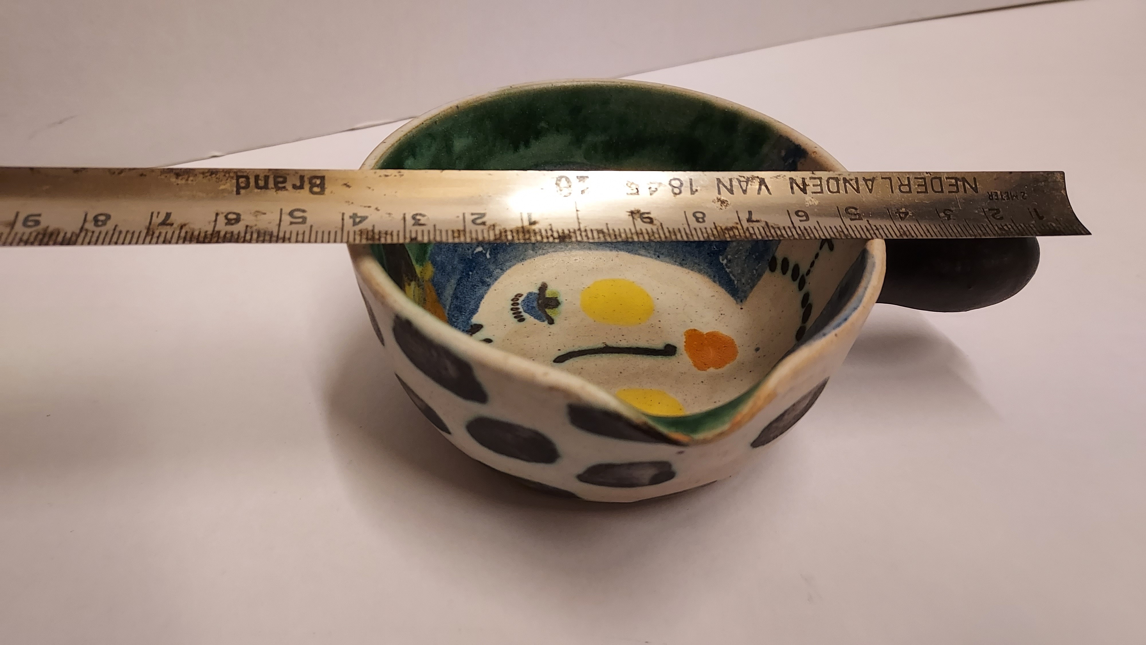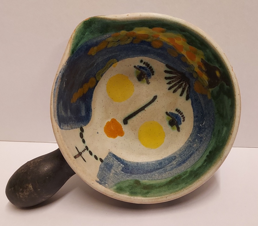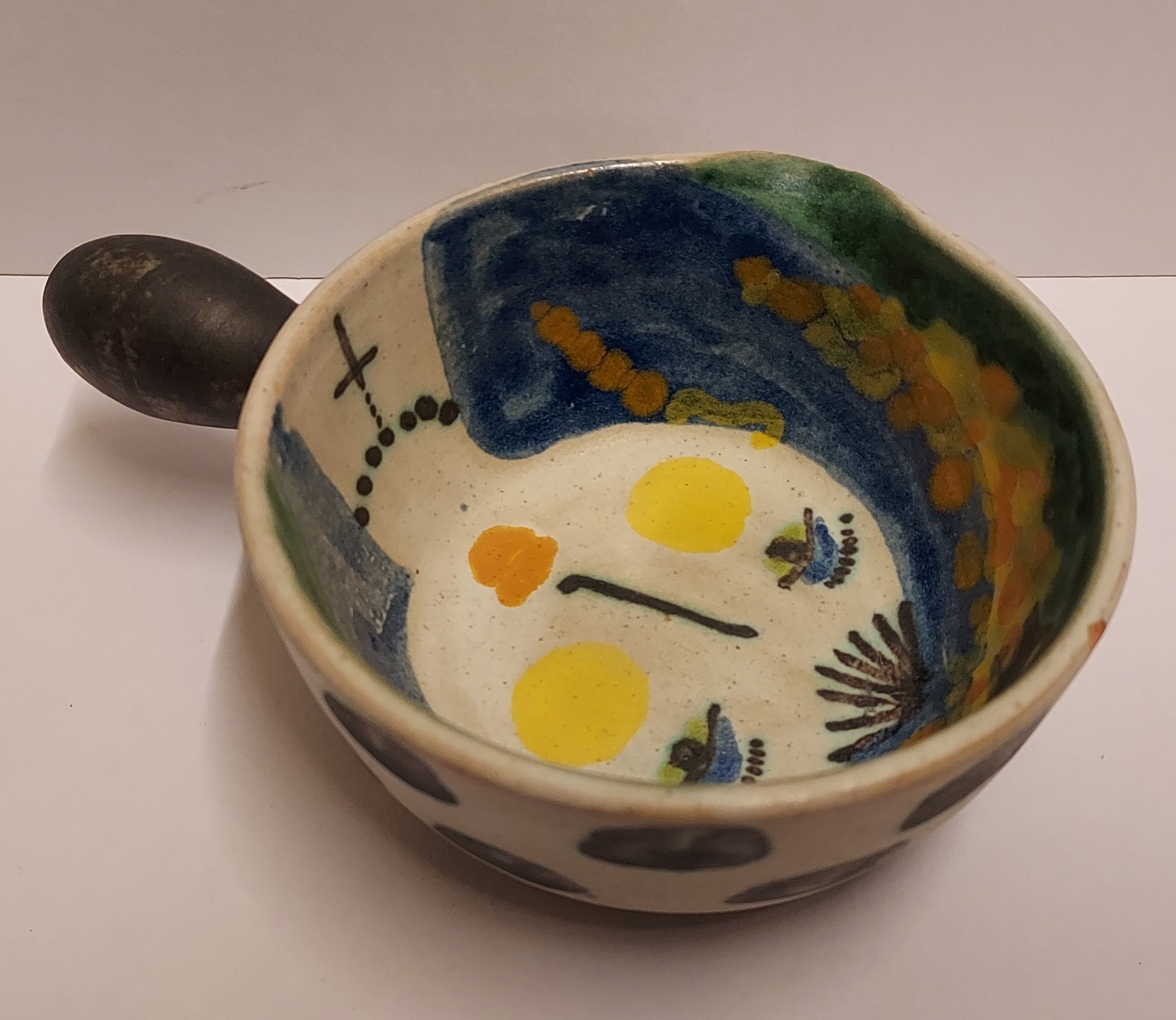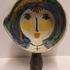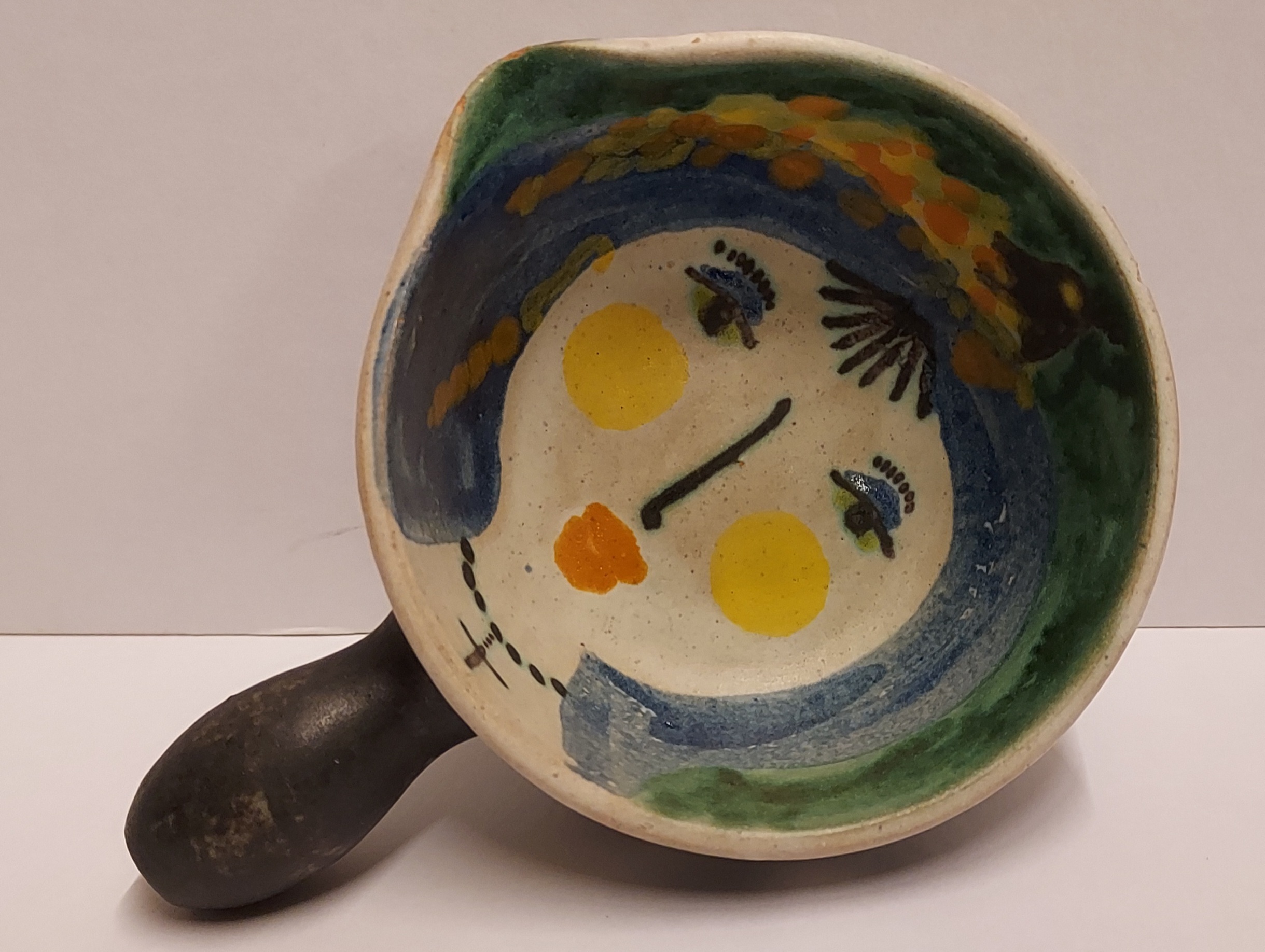 Petite casserole avec un décor représentant un visage. Le dessous est marqué IST et un petit arbre.