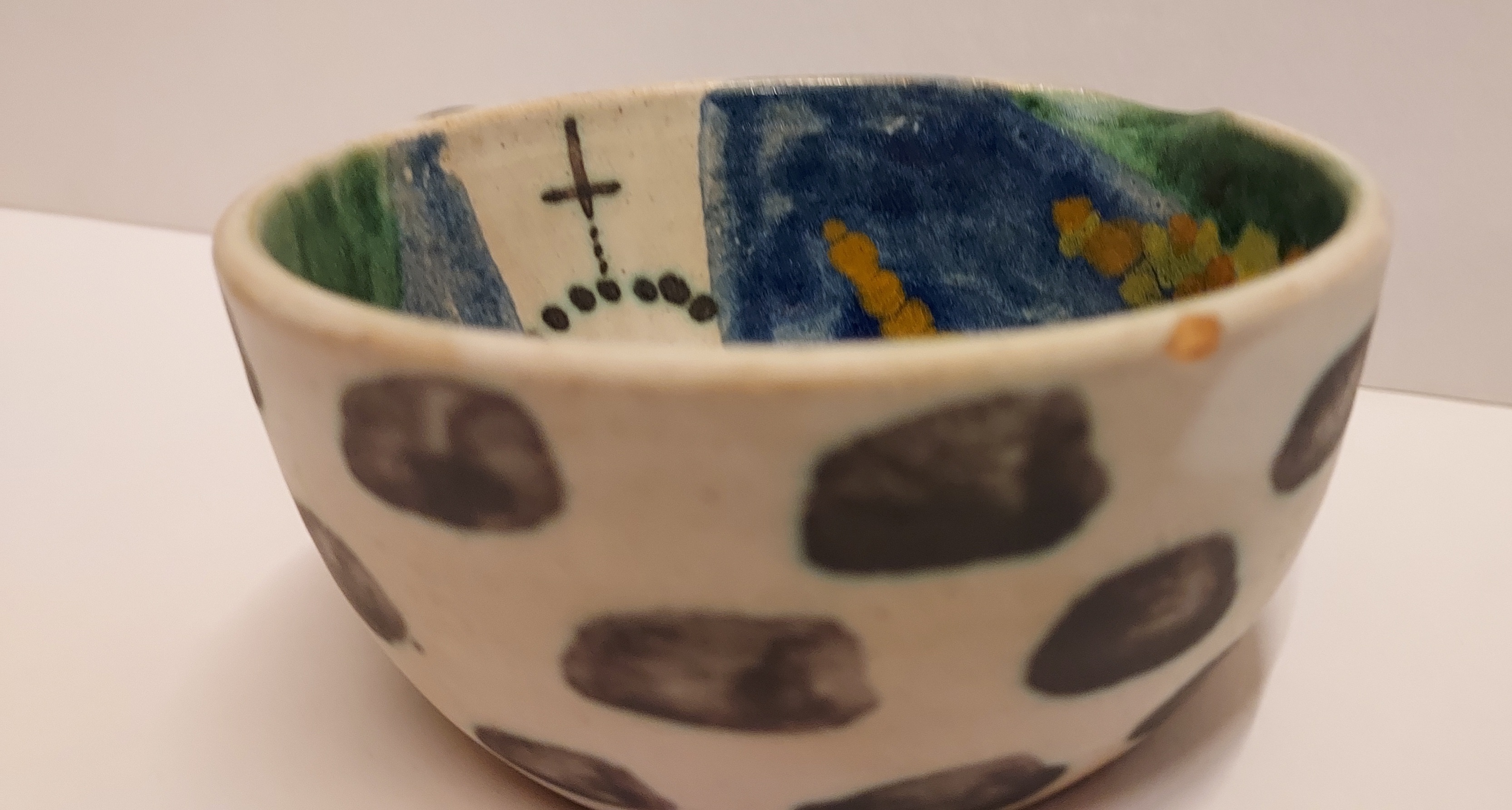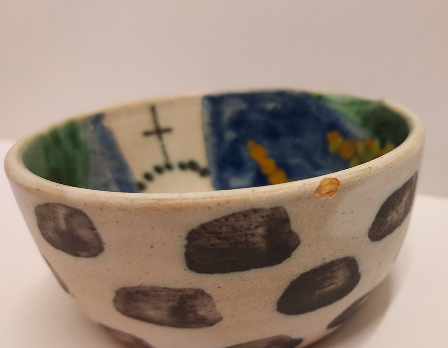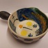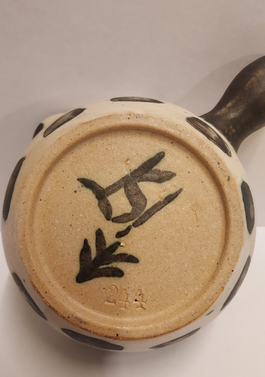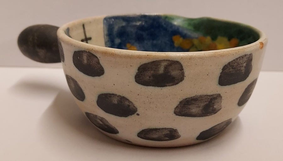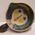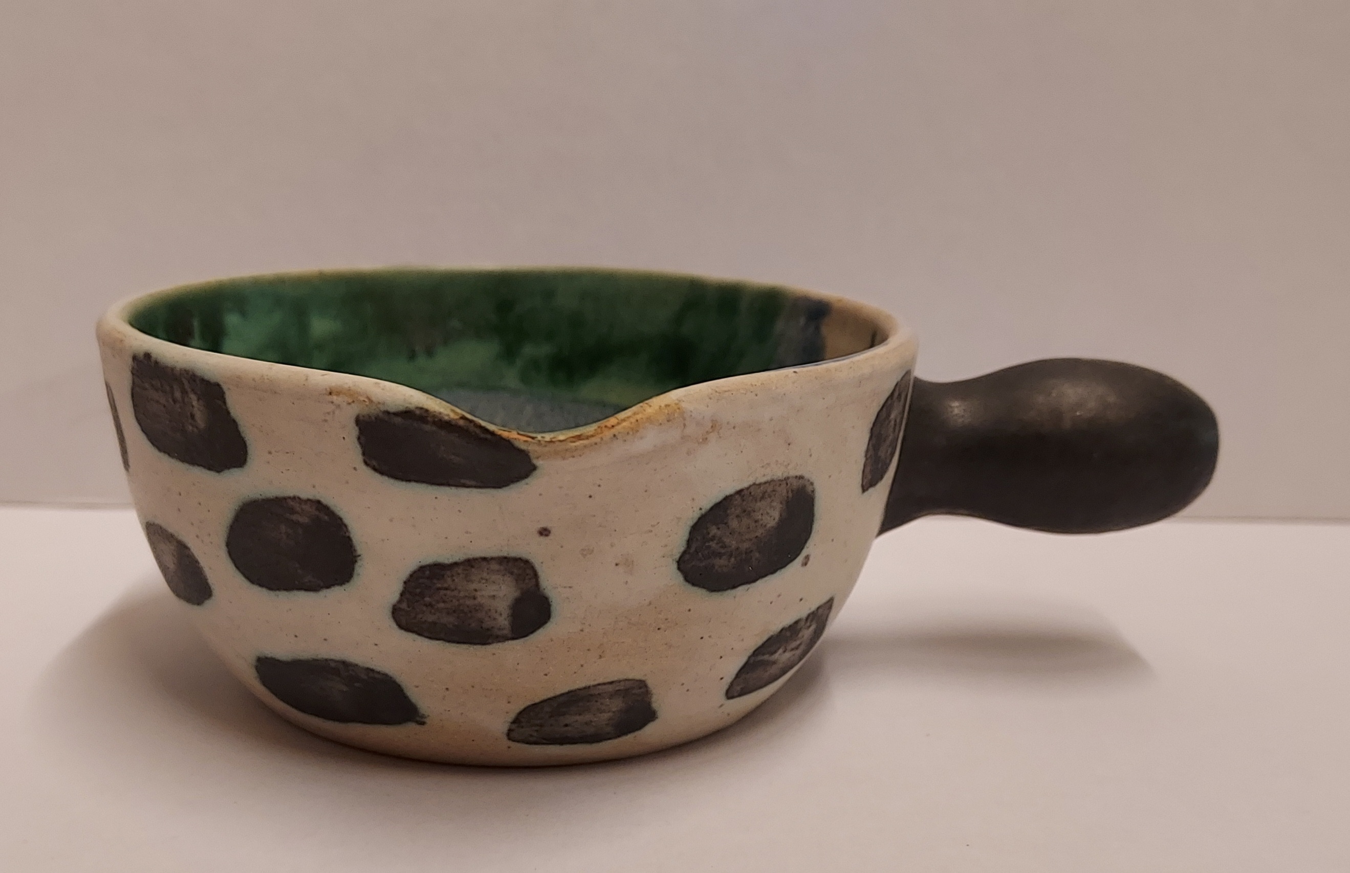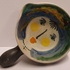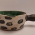 Petite casserole avec un décor représentant un visage. Le dessous est marqué IST et un petit arbre.
