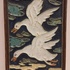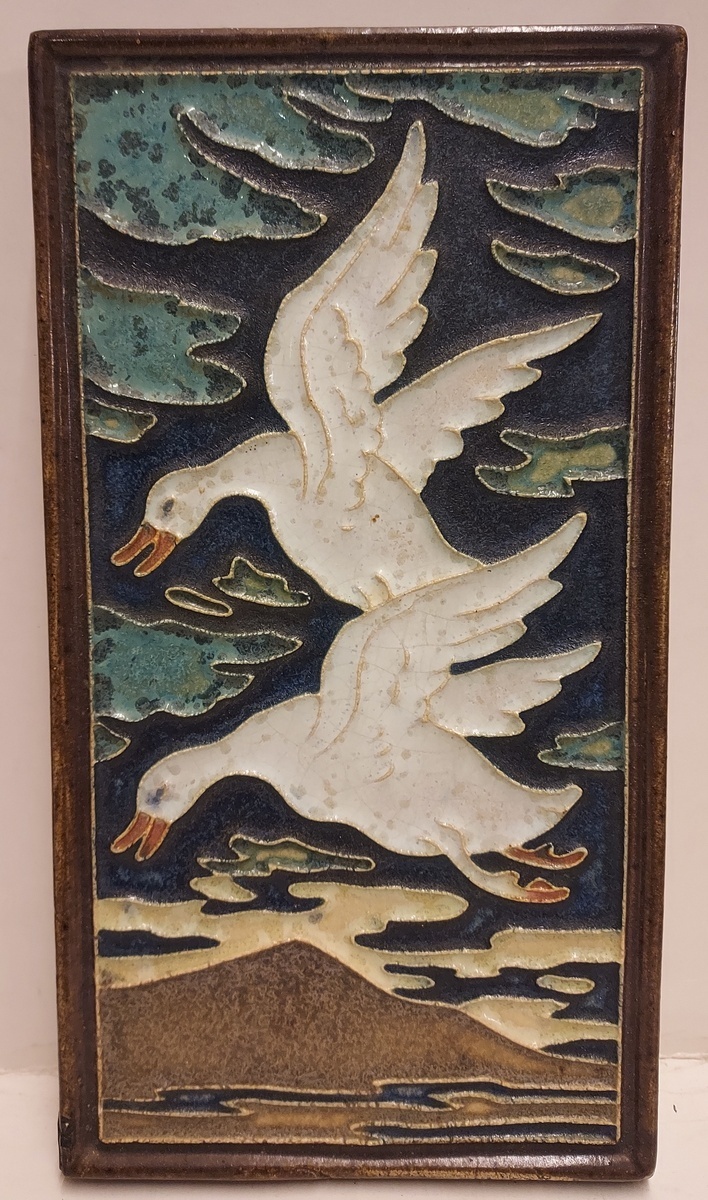 Carreau debout avec un décor de 2 oies blanches en vol. Verso avec marque de fabrique.