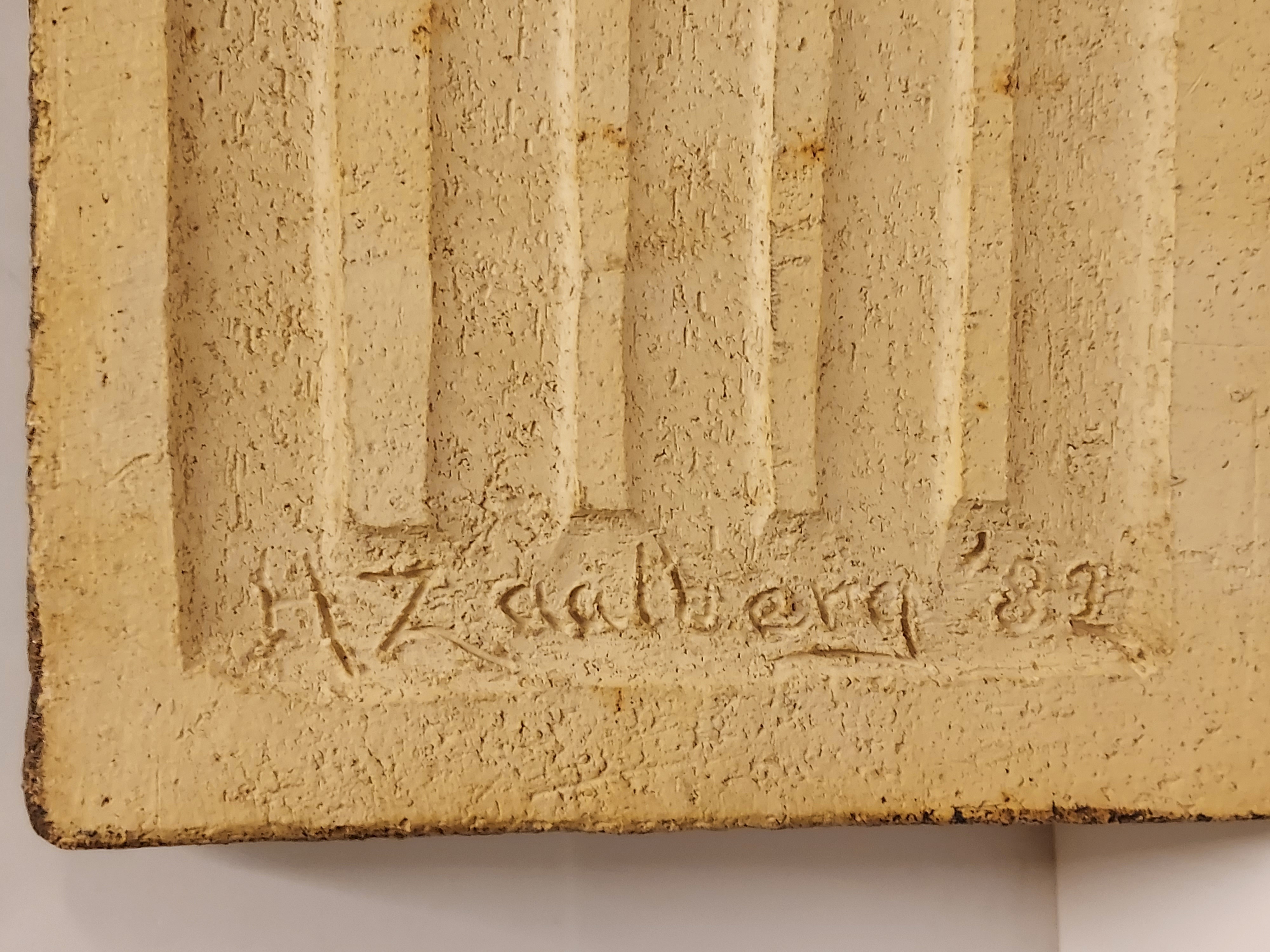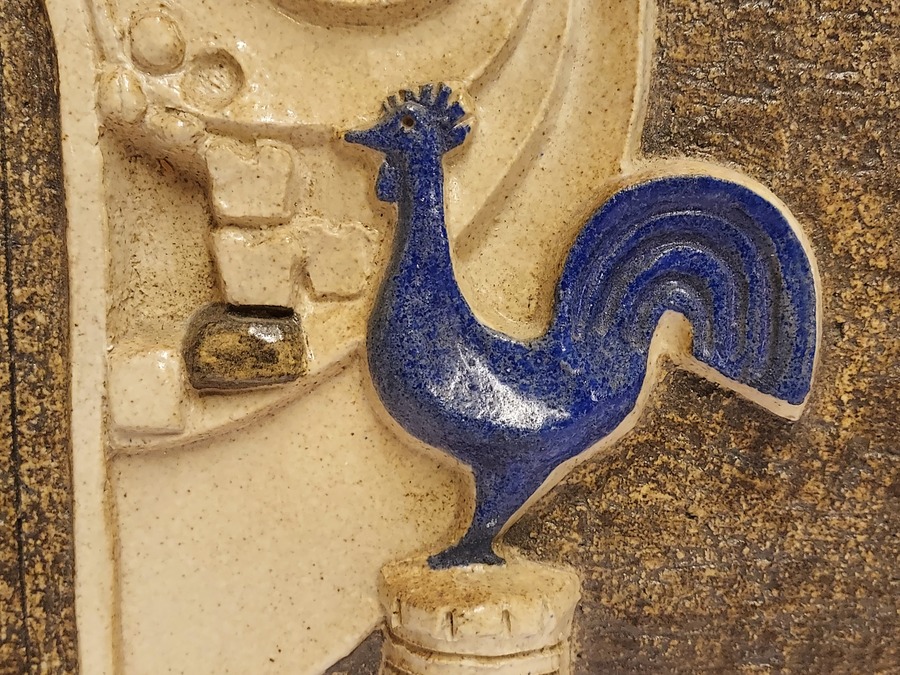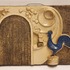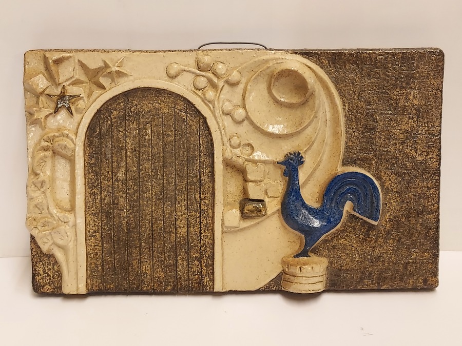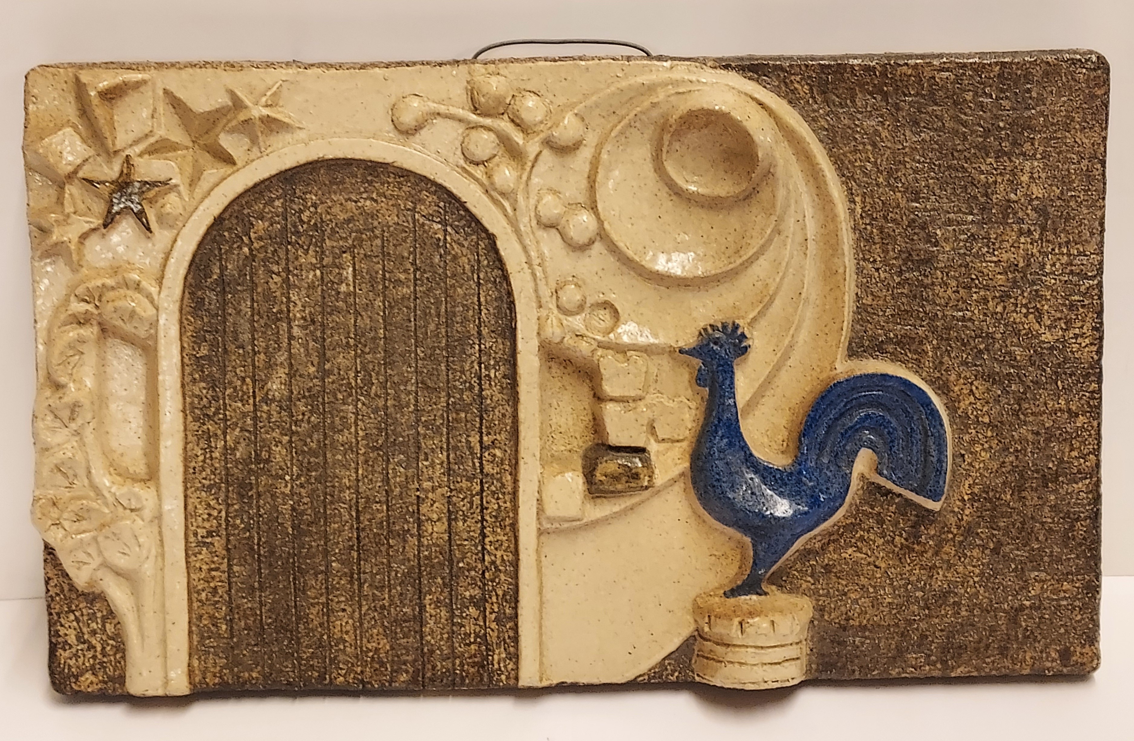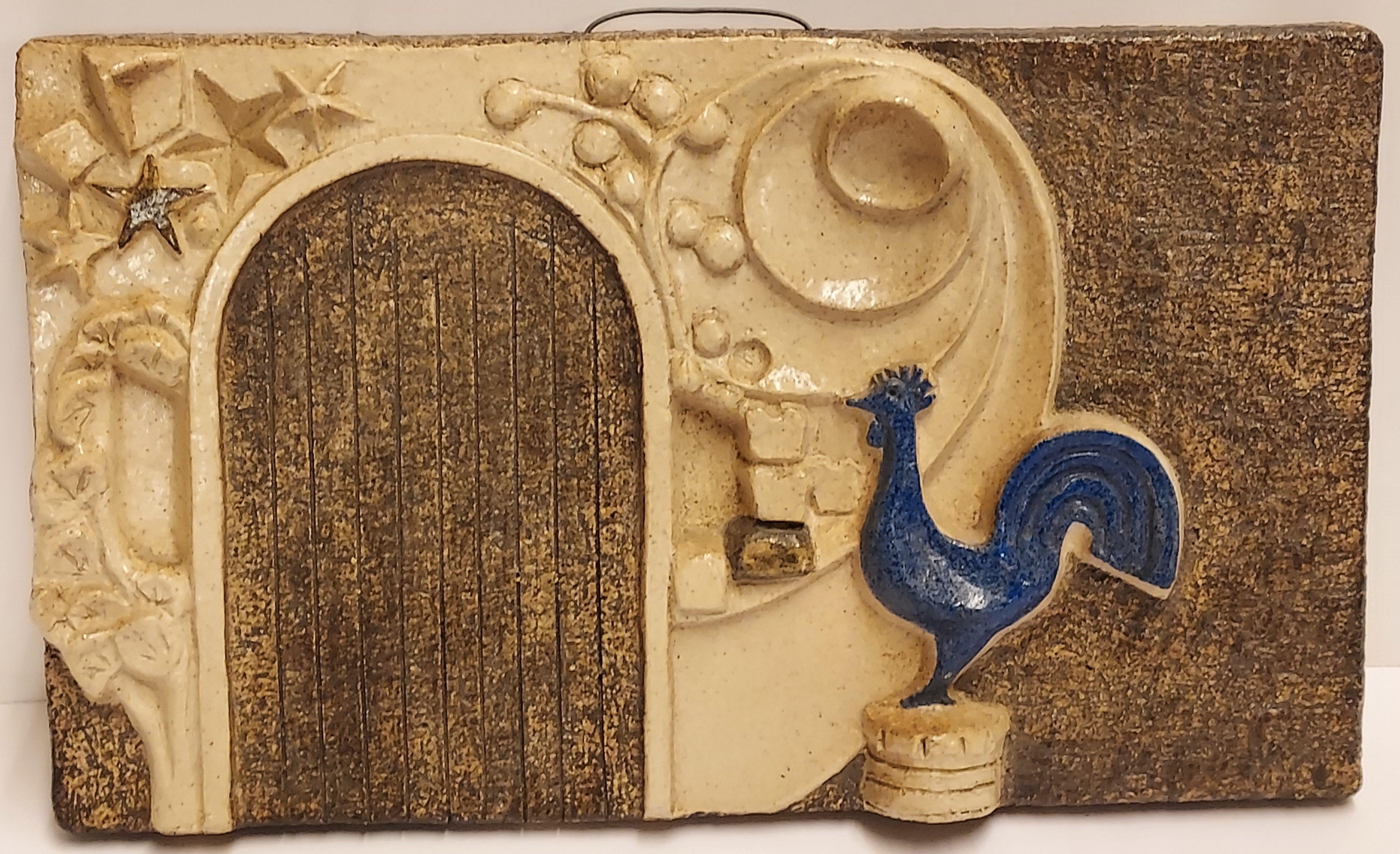 Carreau décoré d'une porte avec un coq bleu. Verso signé H. Zaalberg.