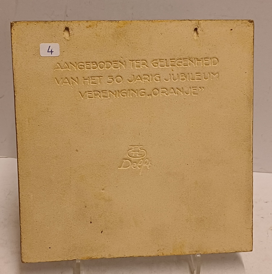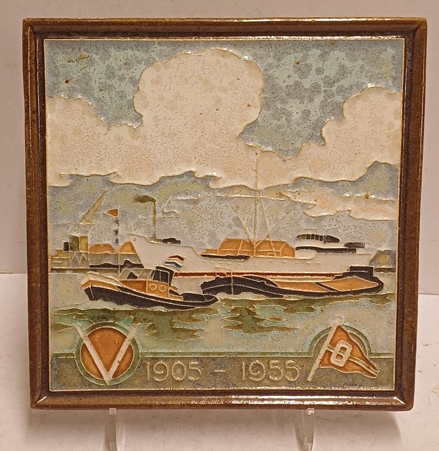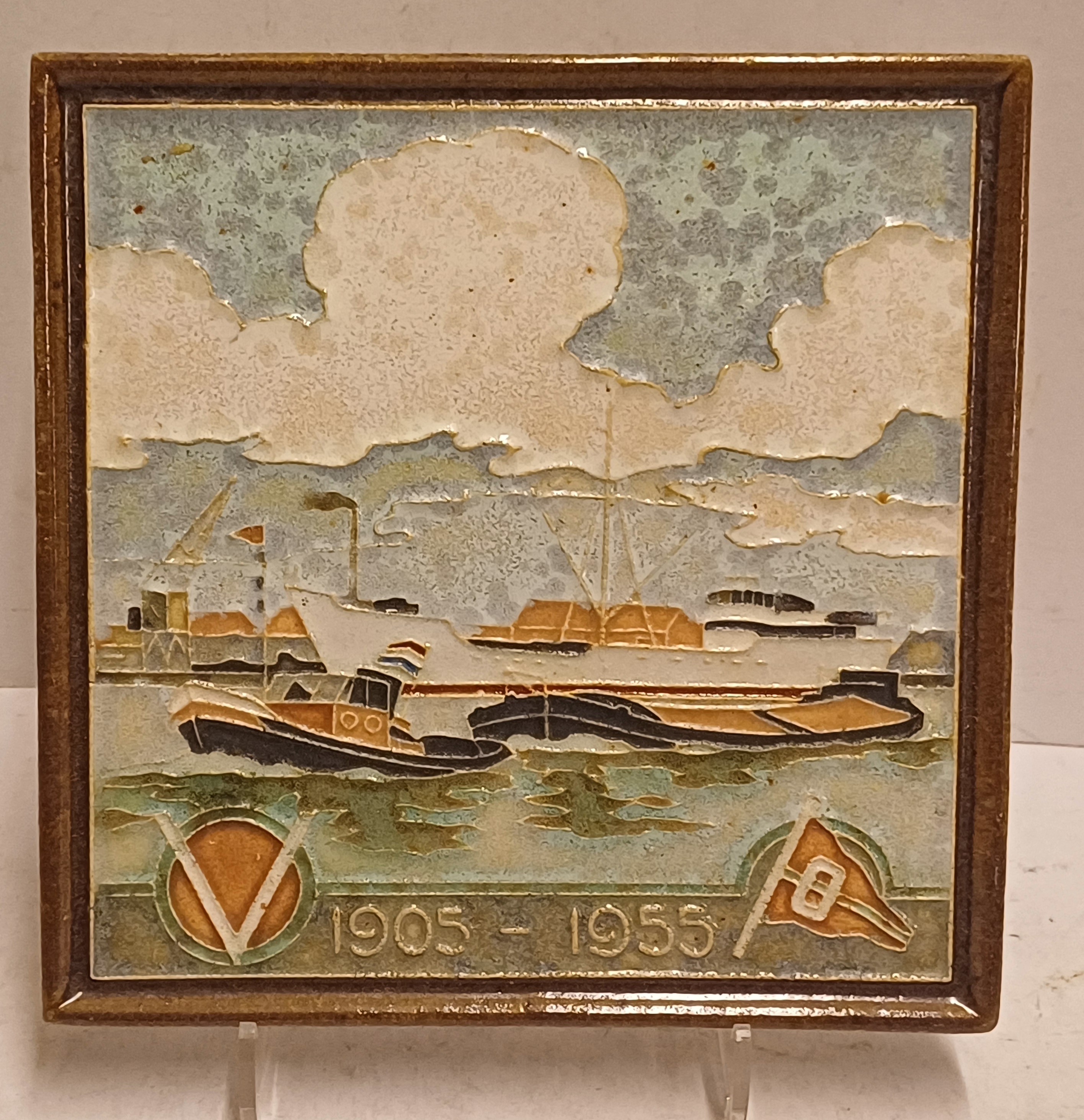 Tegel met afbeelding van meerde schepen op open water. de onderste regel met logo en jaartallen 1905-1955. Achterzijde met fabrieksmerk en de tekst "aangeboden t6er gelegenheid van het 50 jarig jubileum vereniging Oranje"