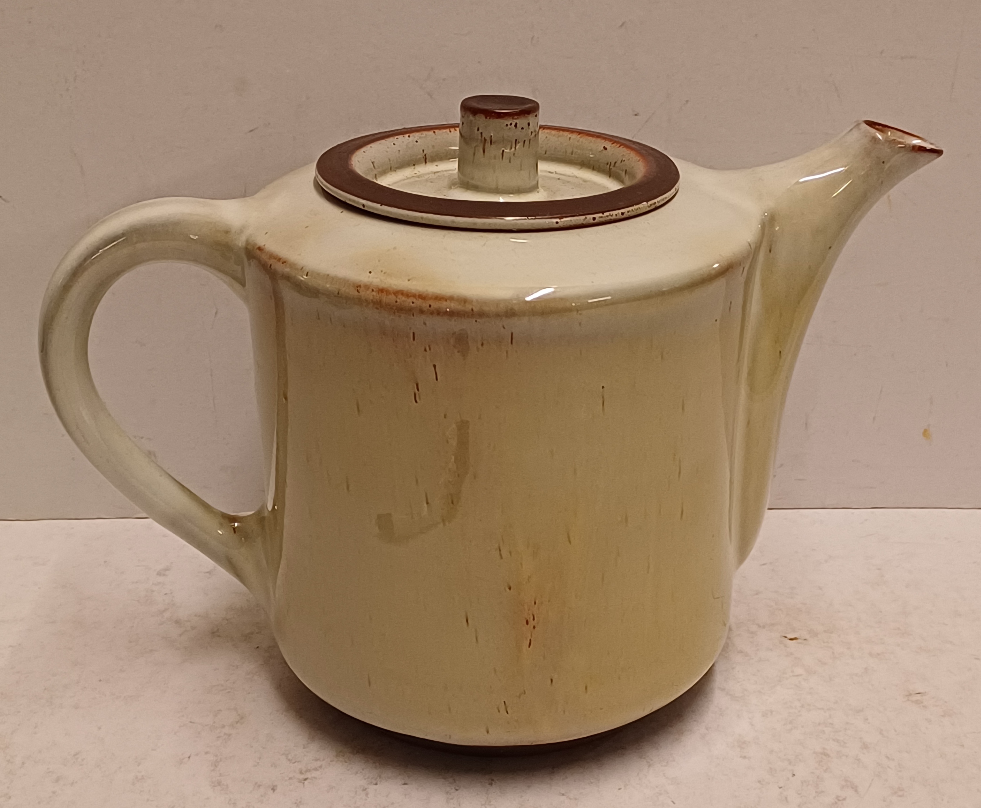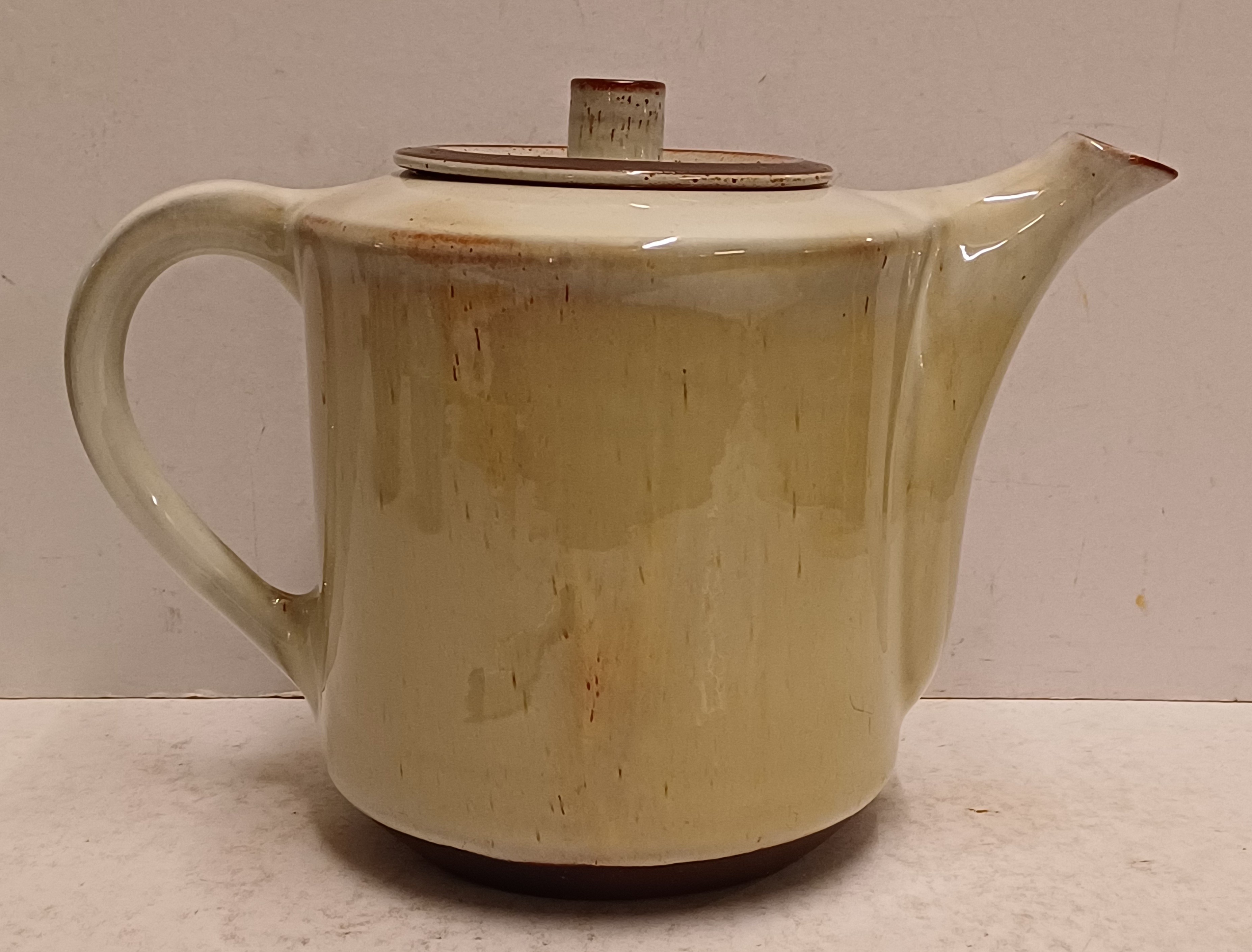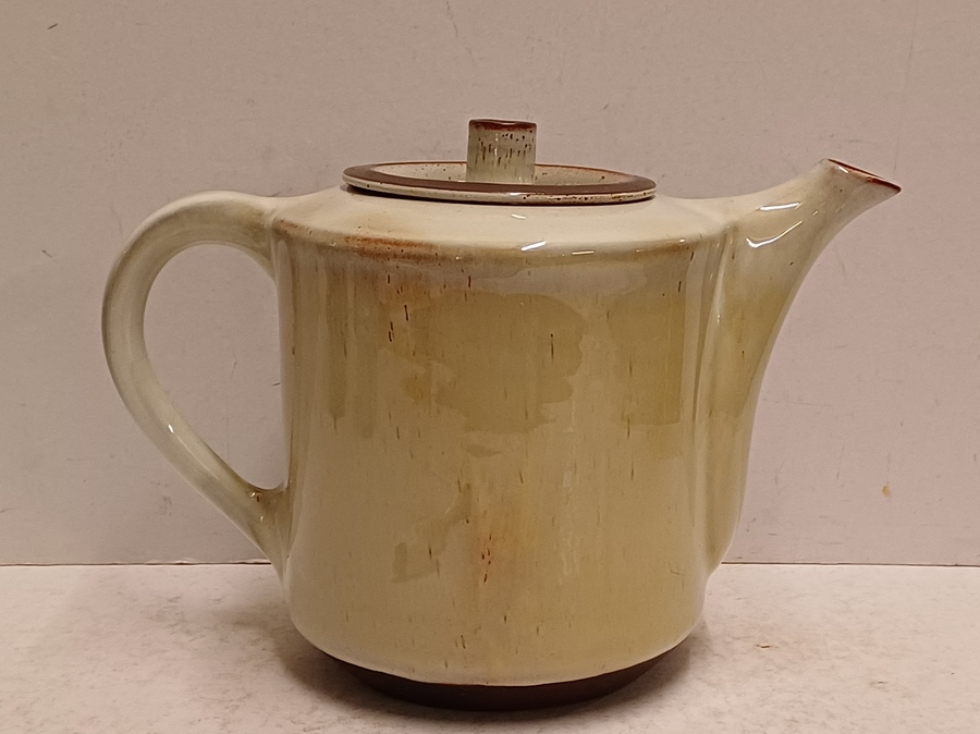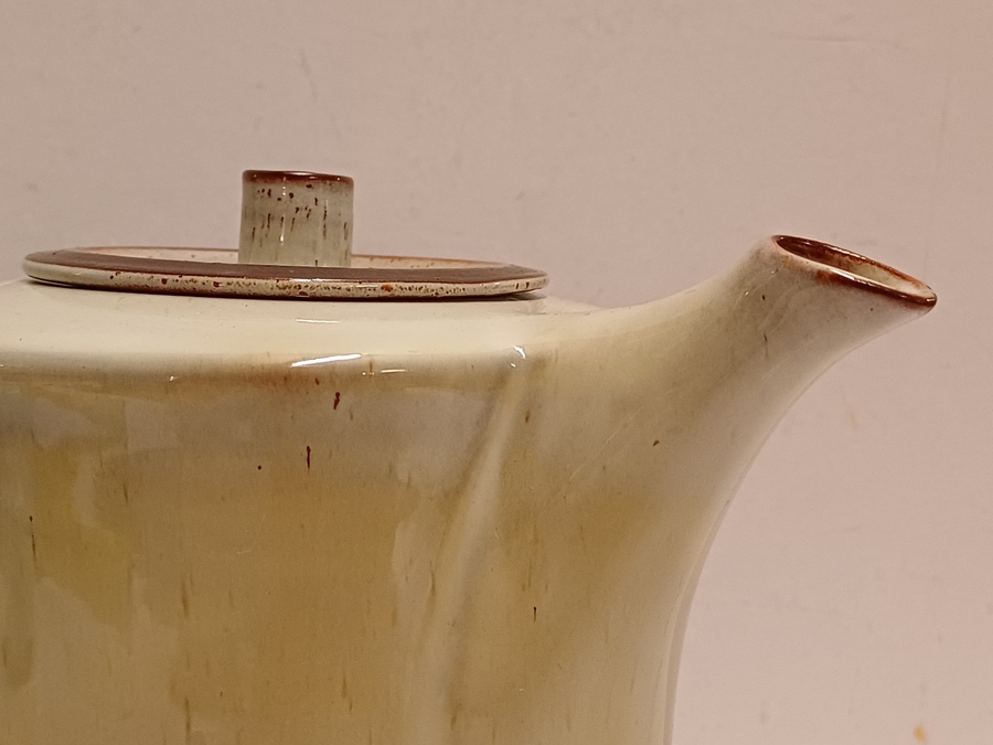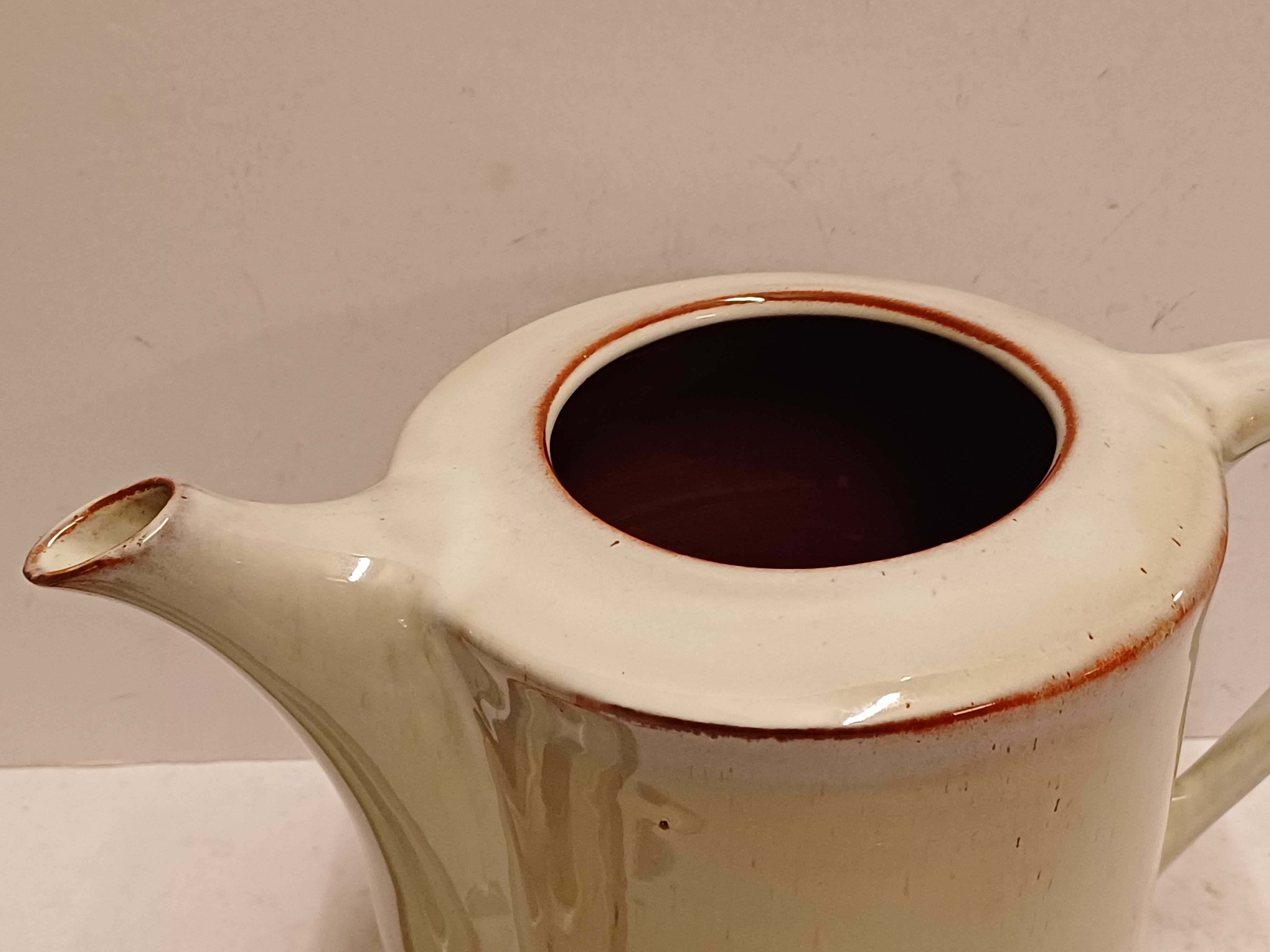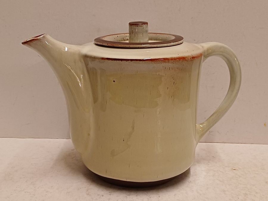 Aardewerken theepot met glanzende glazuur. Onderzijde met fabrieksstempel