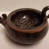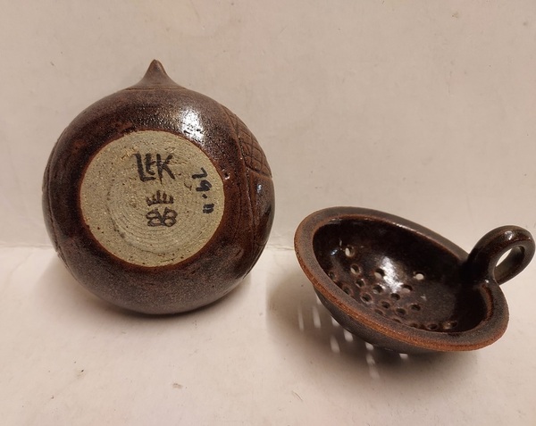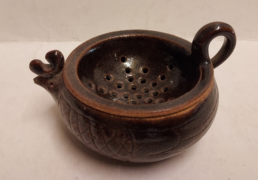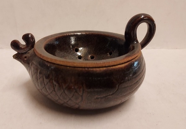 Passoire à thé en forme de coq, avec un glaçure tenmoku. Dessous avec monogramme et marque supplémentaire.