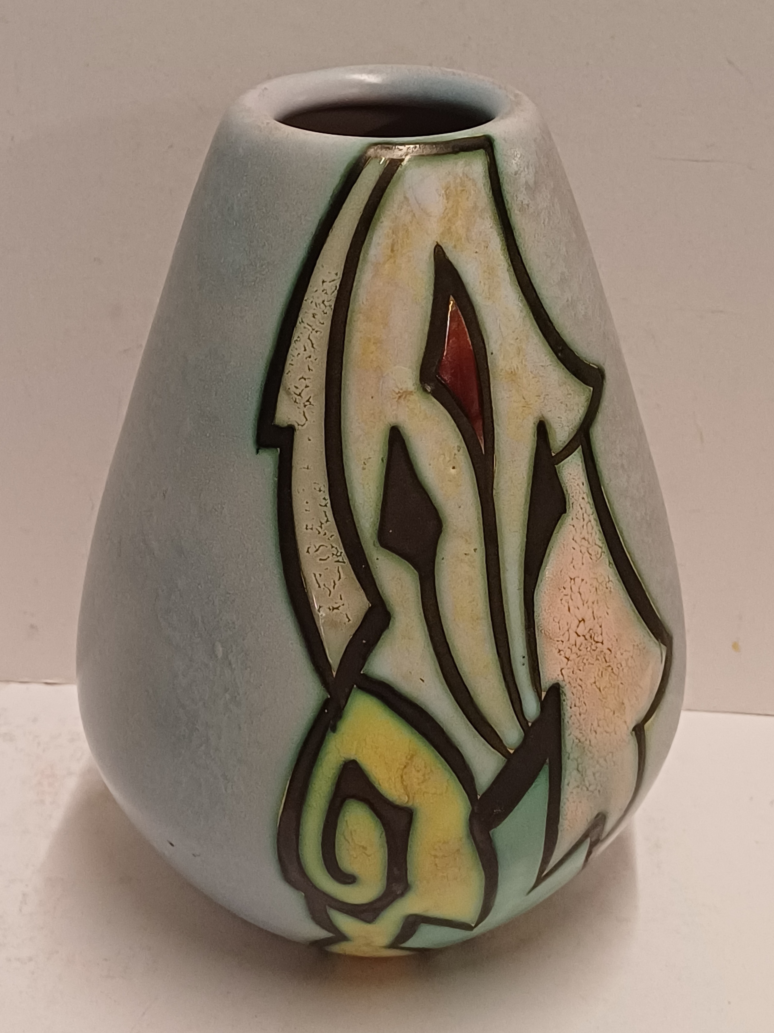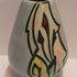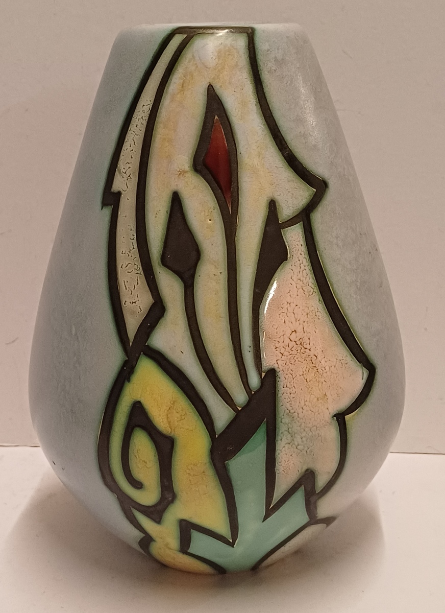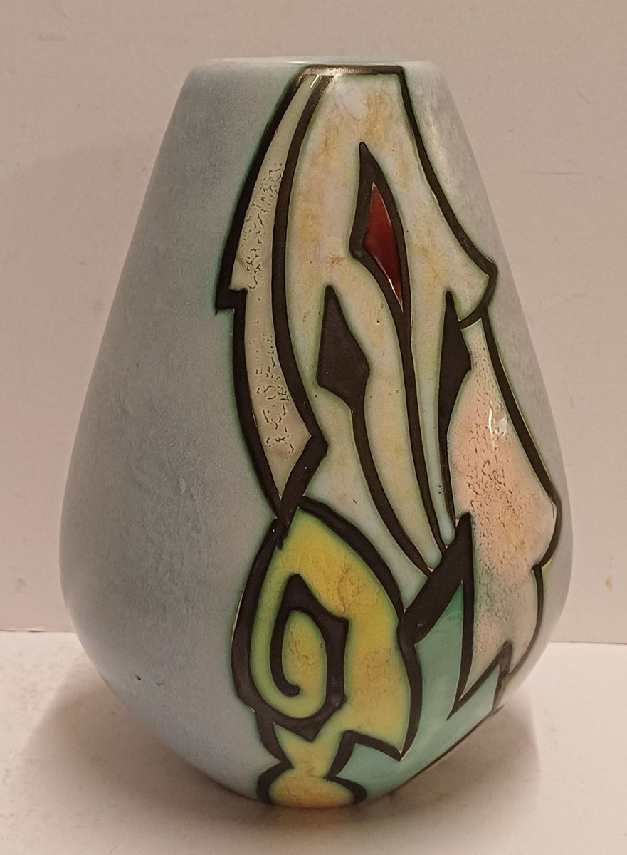 Platelen vaas met gestileerd decor Artistique op lichtblauw fond. Onderzijde gemerkt en modelnummer 1058.