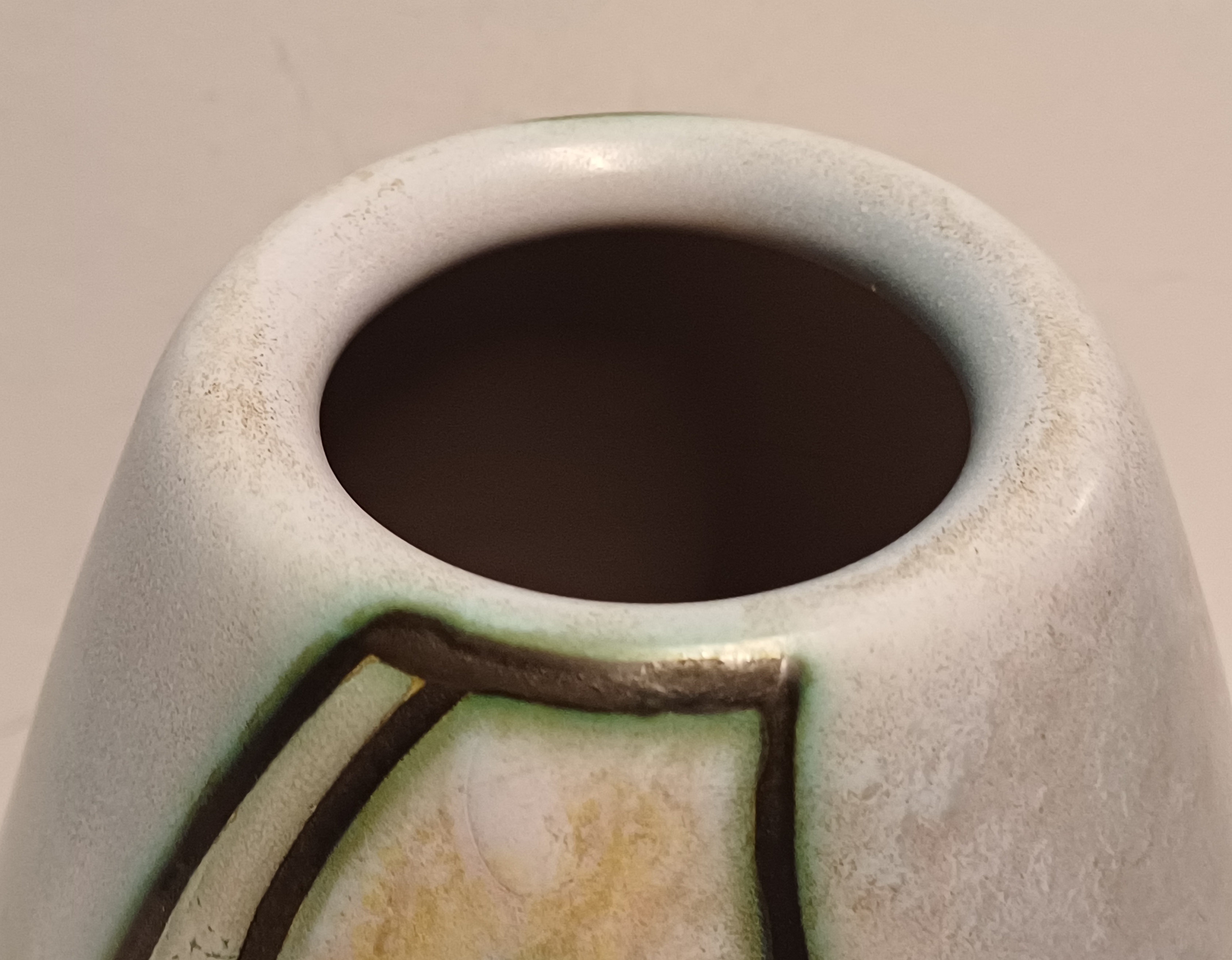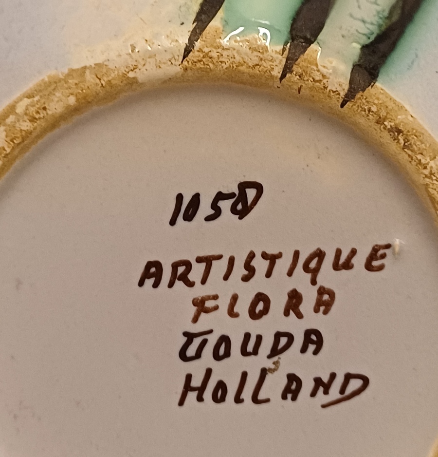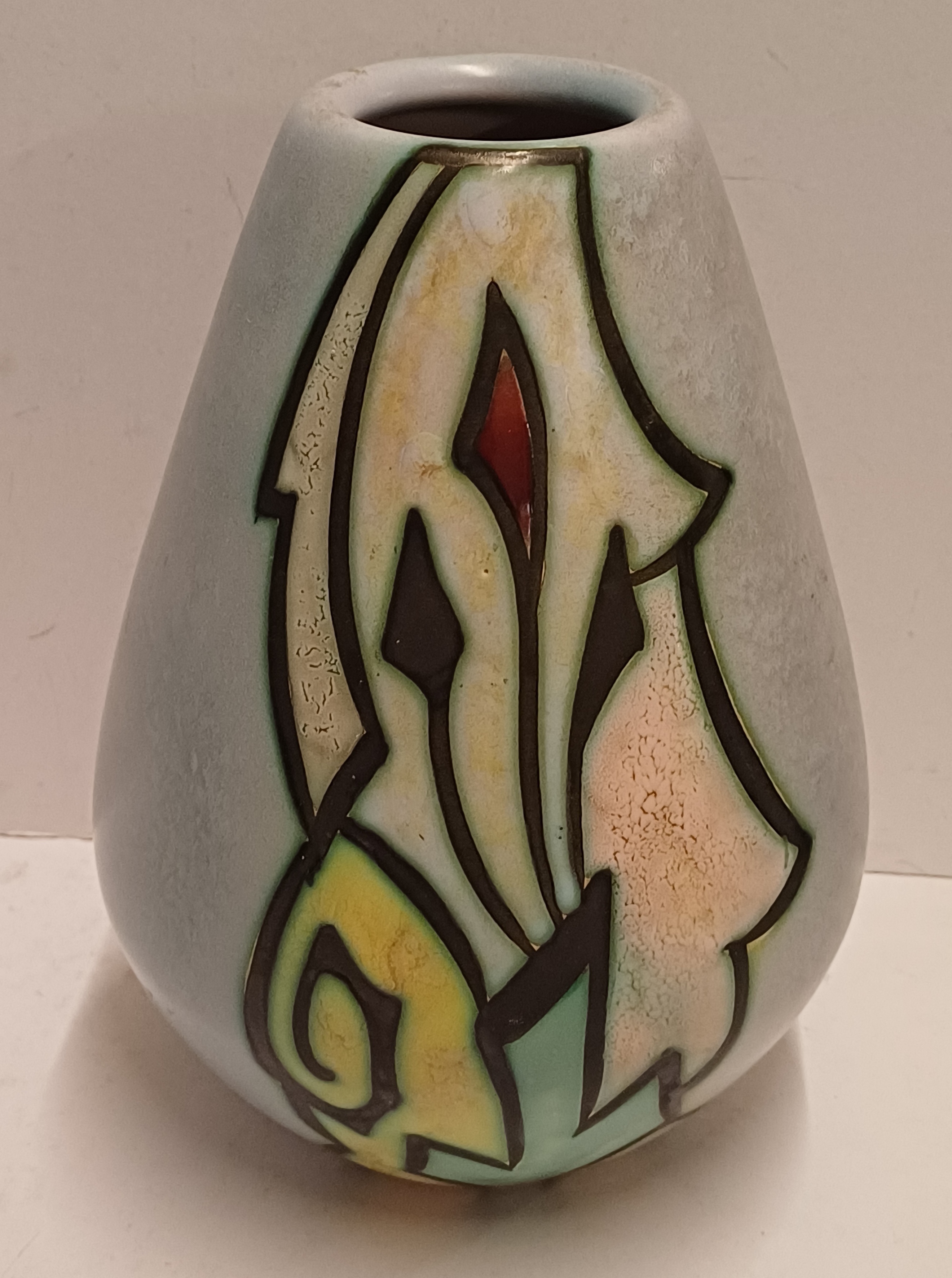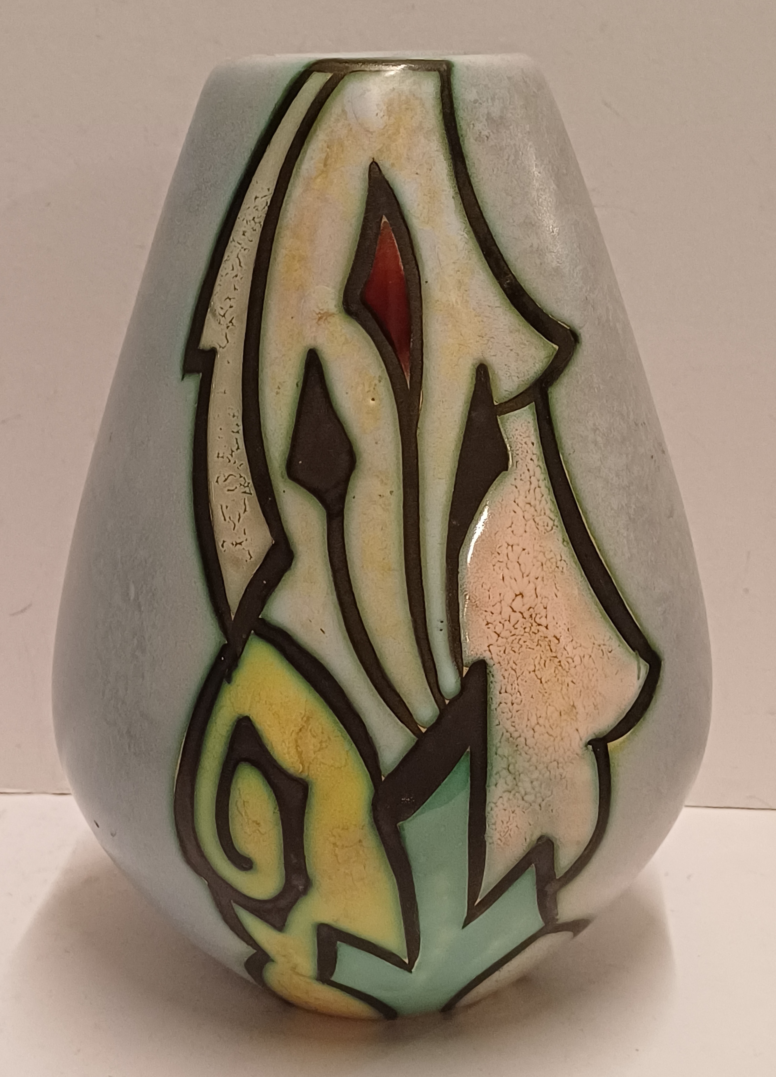 Platelen vaas met gestileerd decor Artistique op lichtblauw fond. Onderzijde gemerkt en modelnummer 1058.