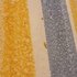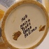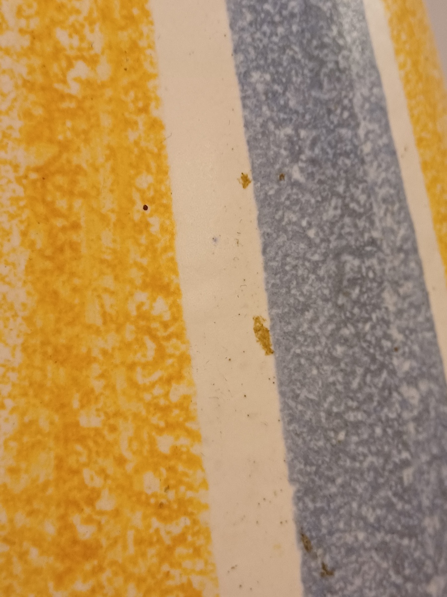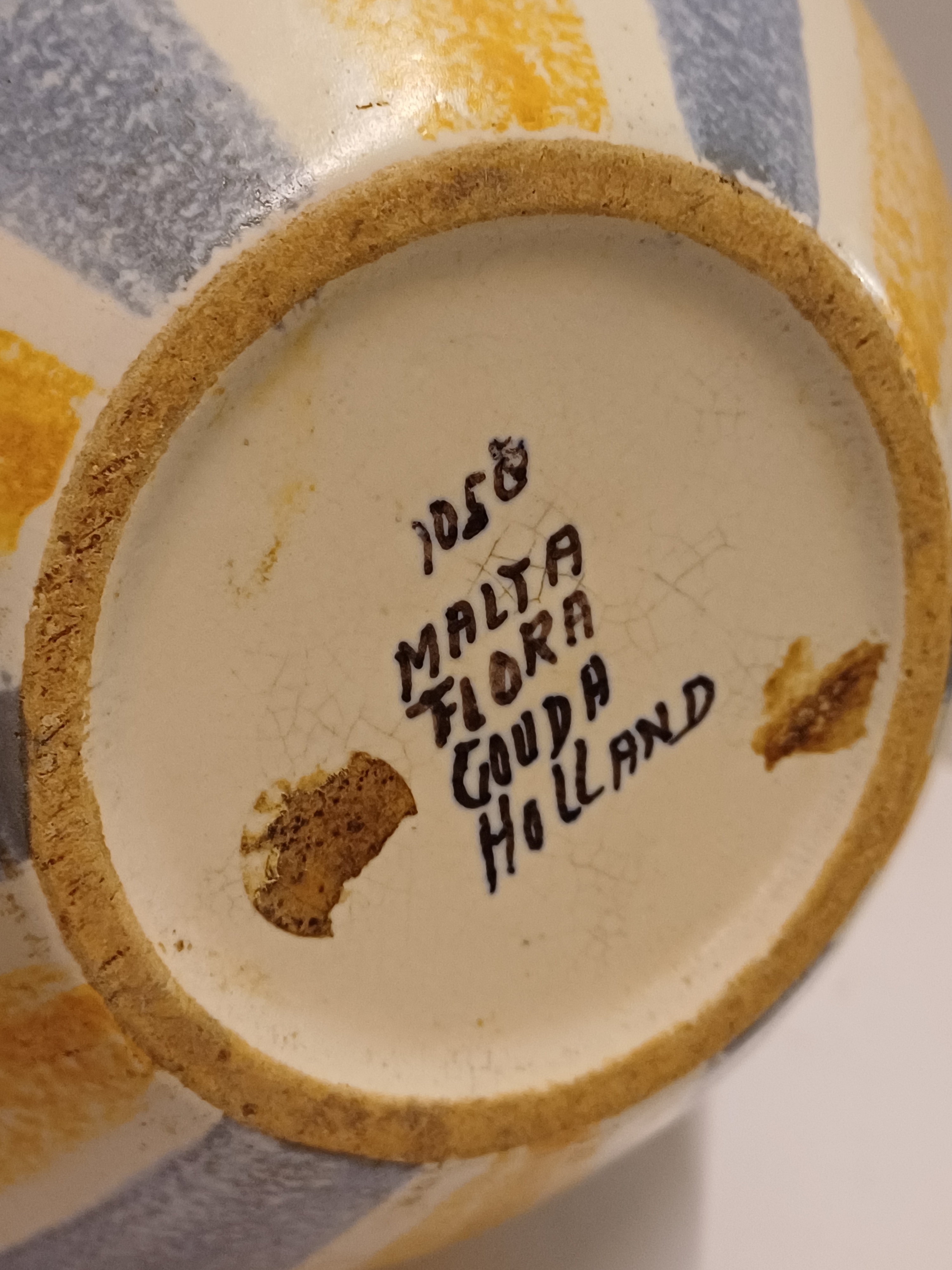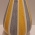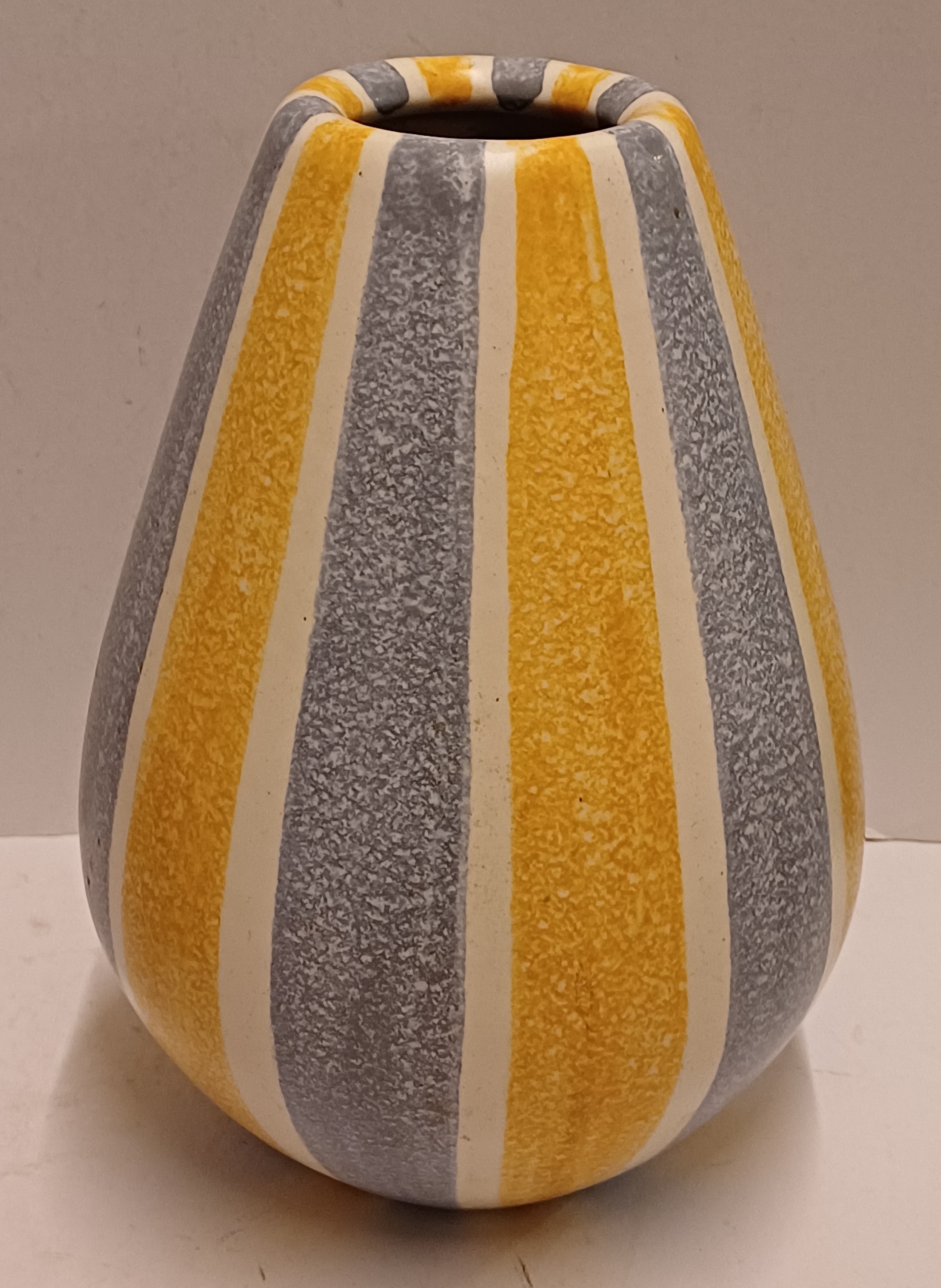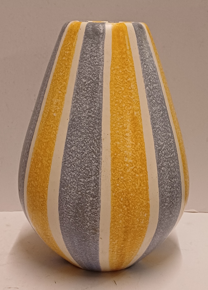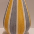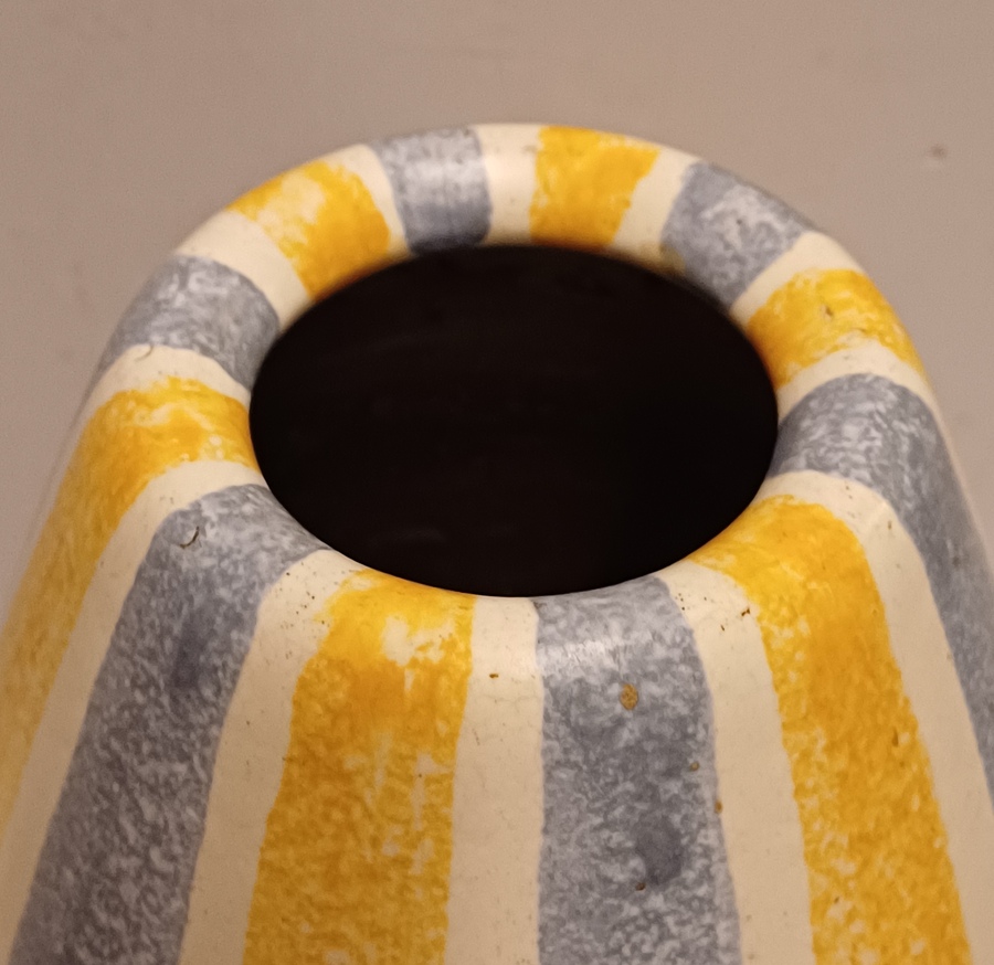 Gegoten aardewerken vaas met geel grijze verticale banen op wit fond. Onderzijde met fabrieksmerk en decornaam.