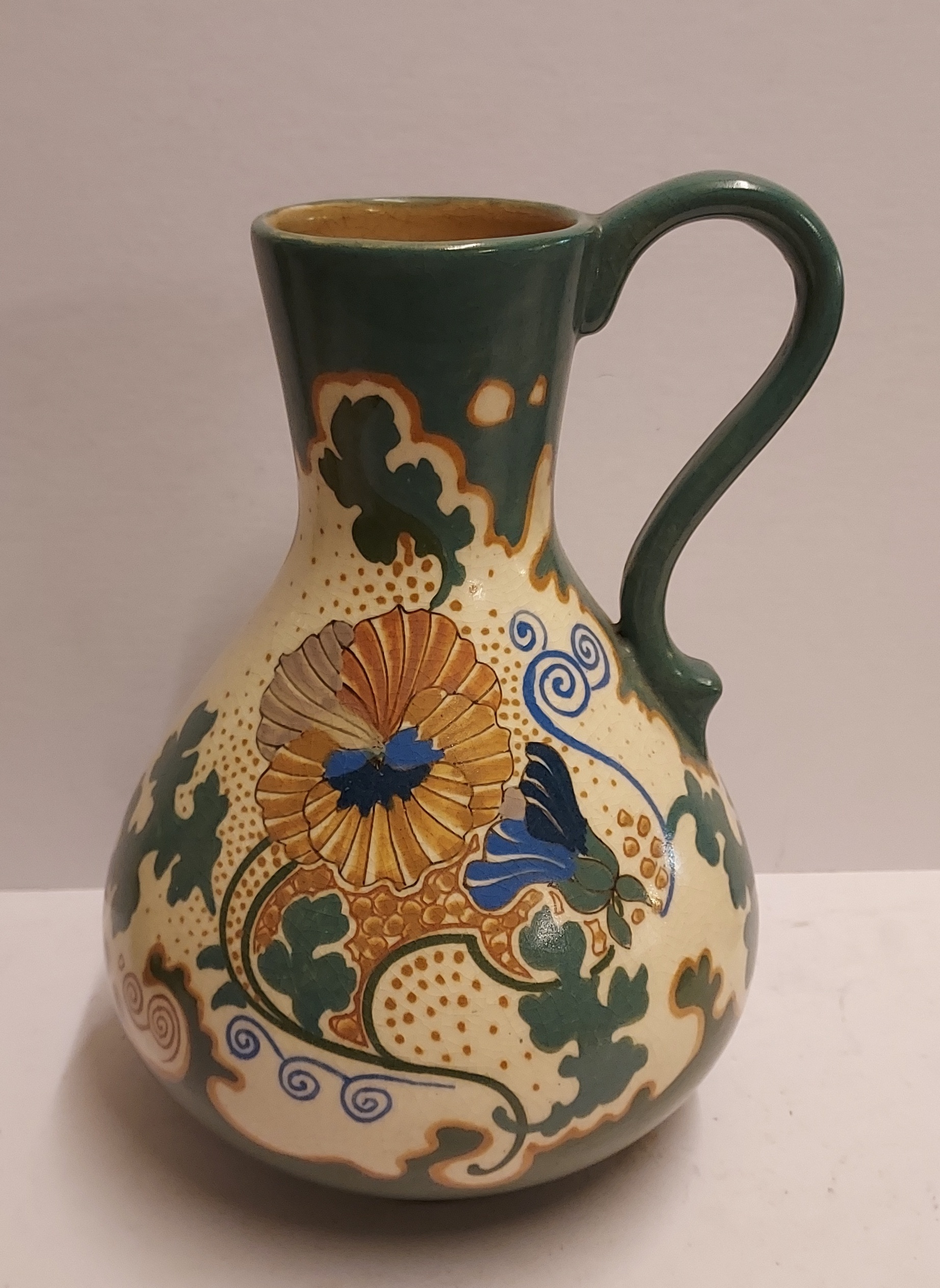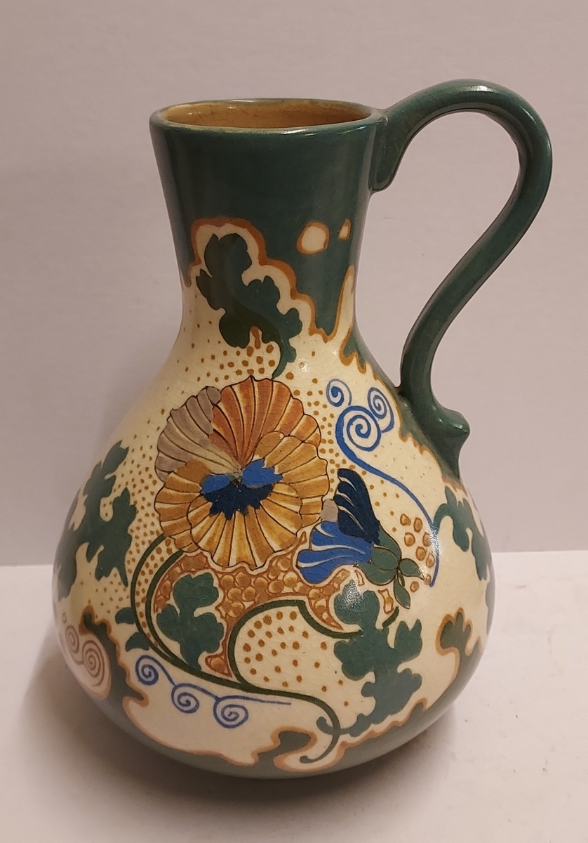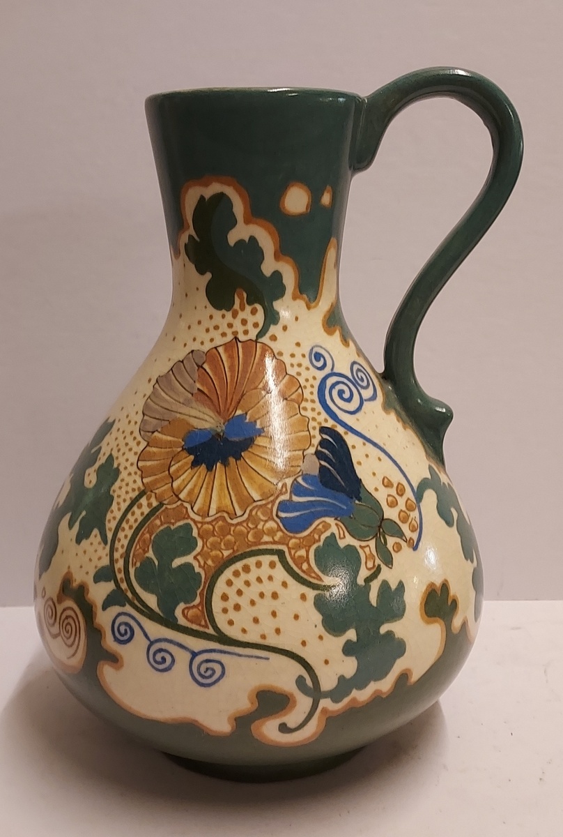 Vase avec une seule anse et décoration florale Pensee. Dessous avec marque de fabrique.
