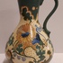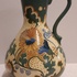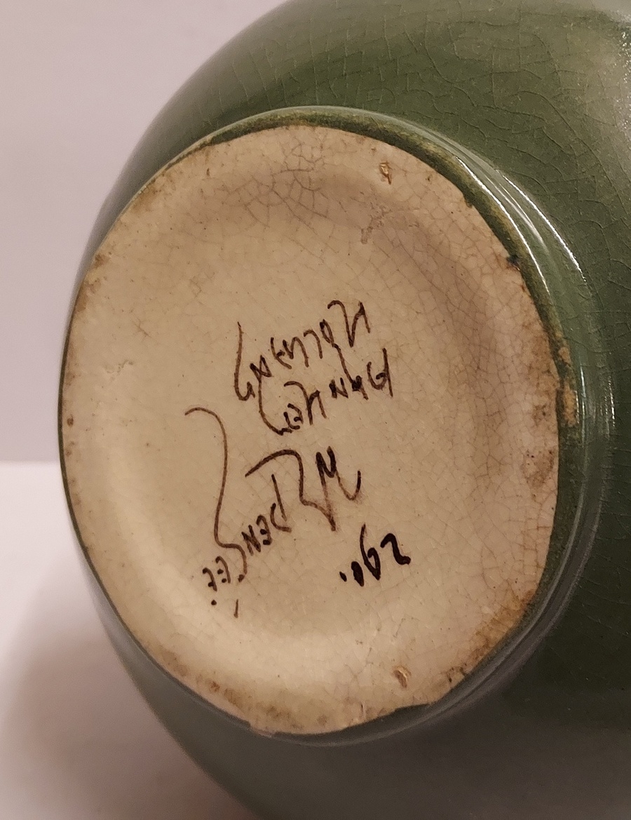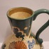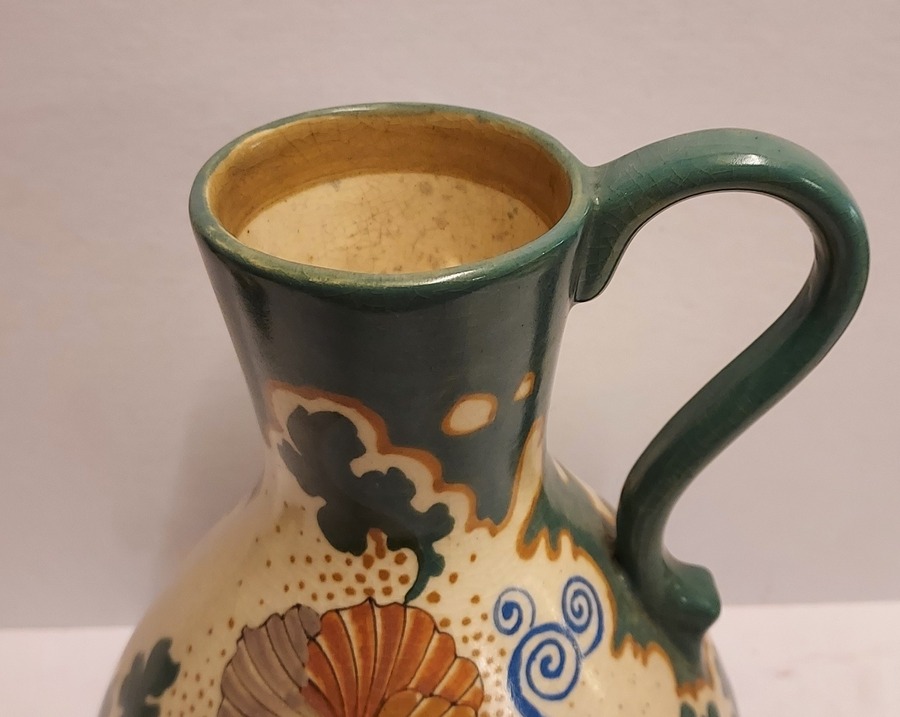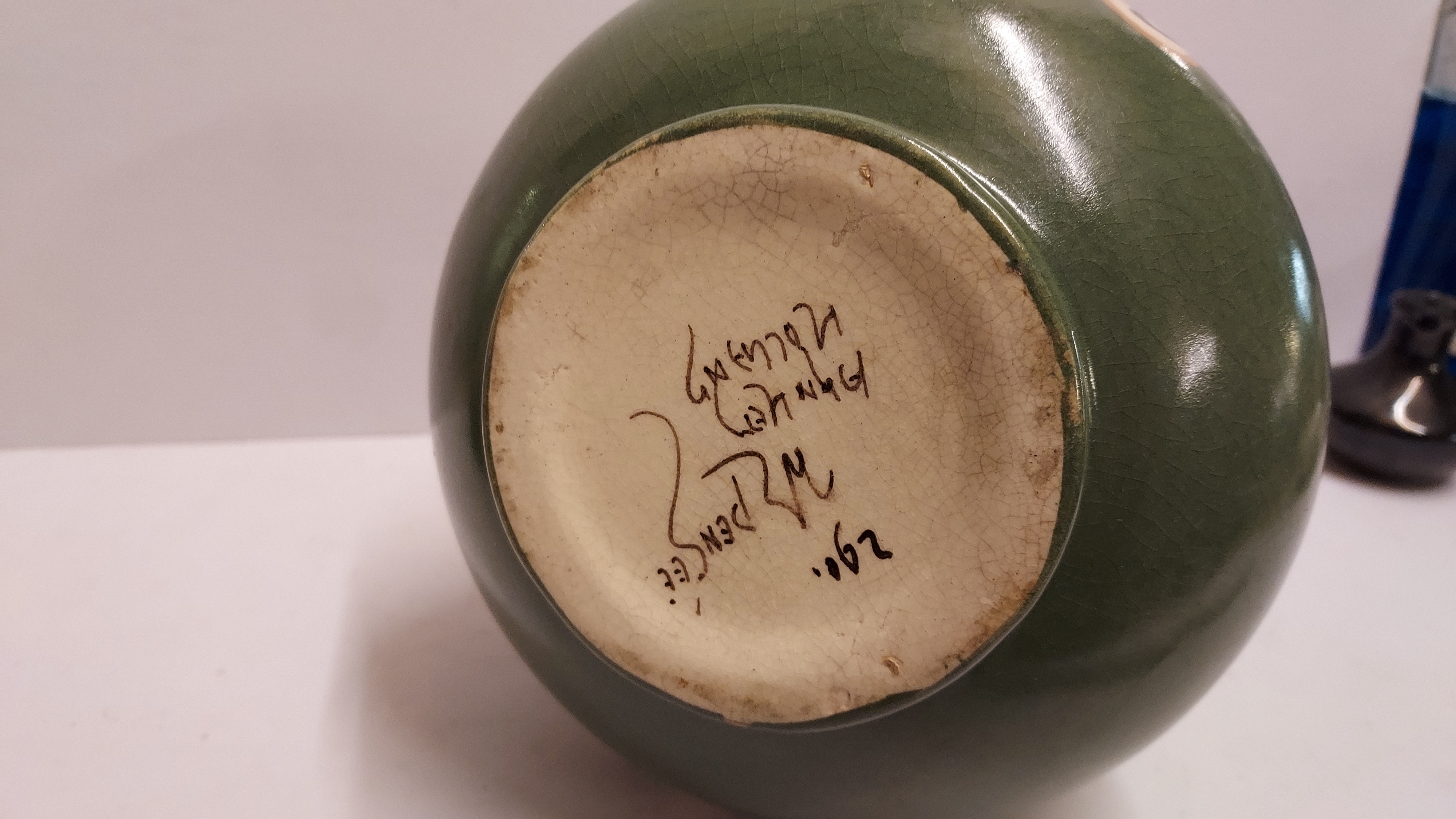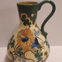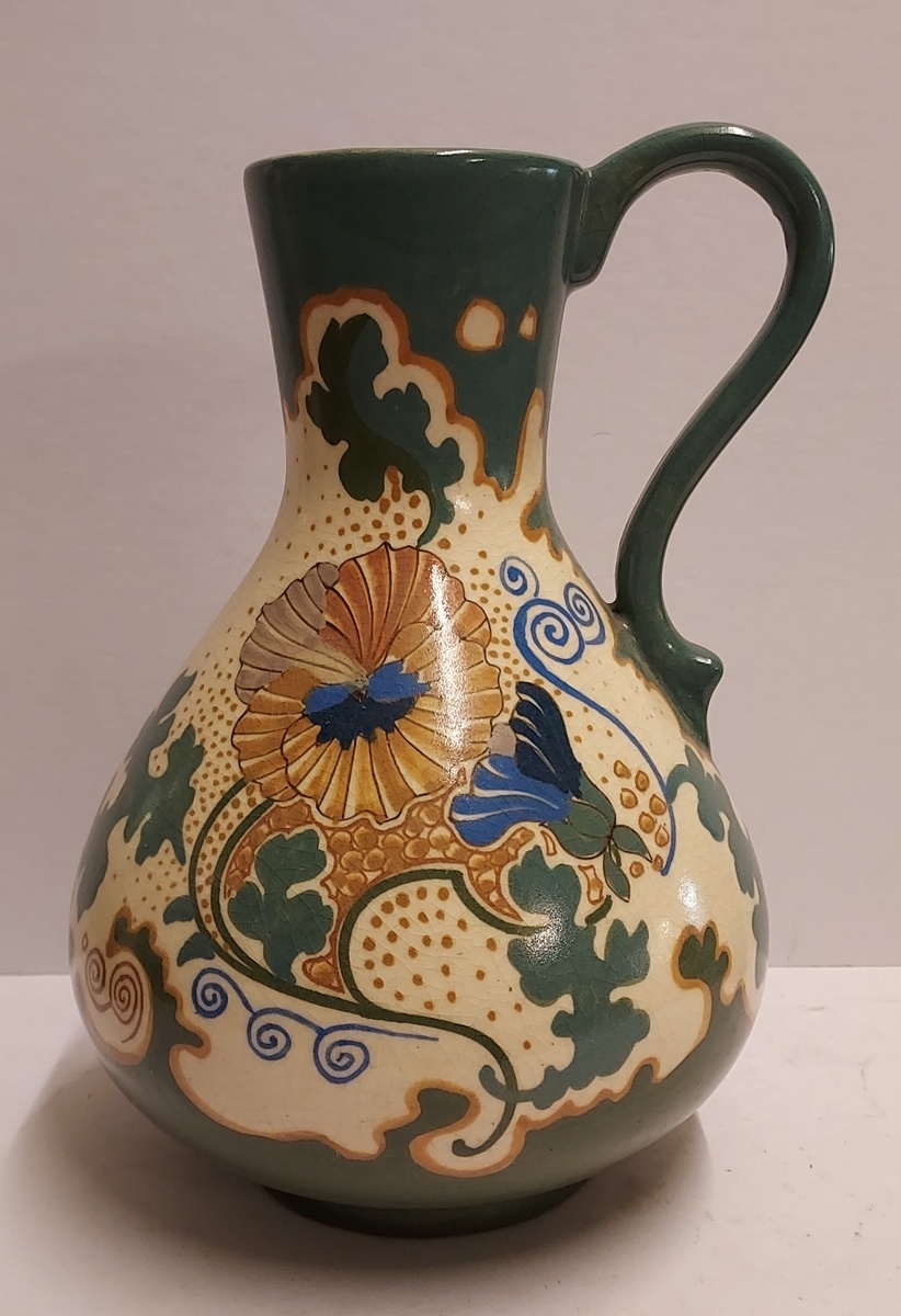 Vase avec une seule anse et décoration florale Pensee. Dessous avec marque de fabrique.