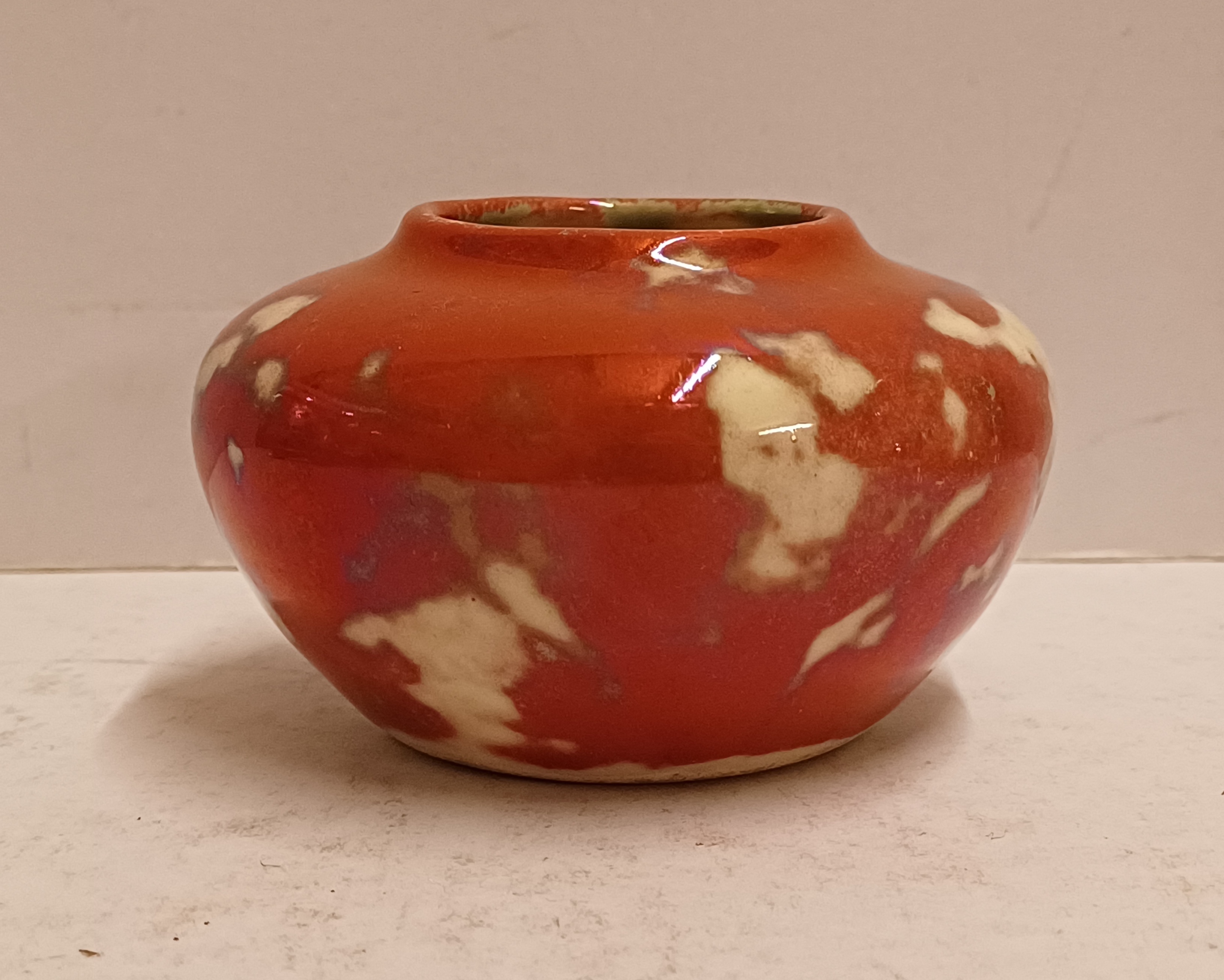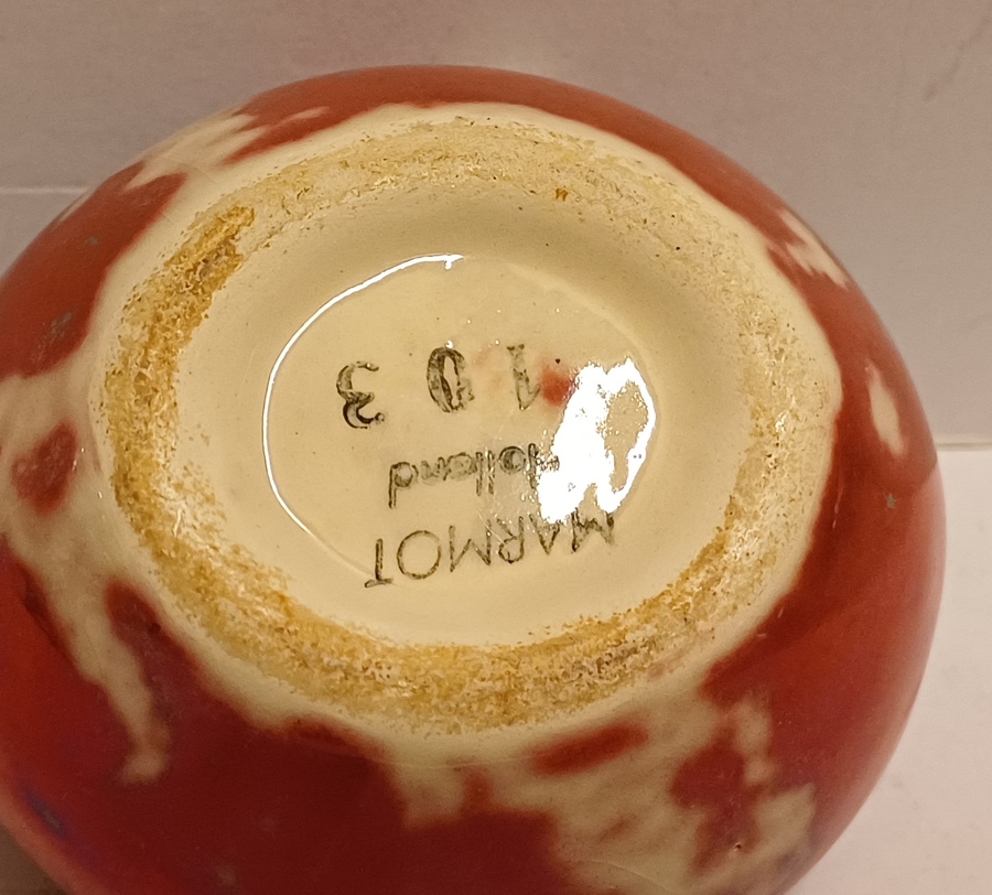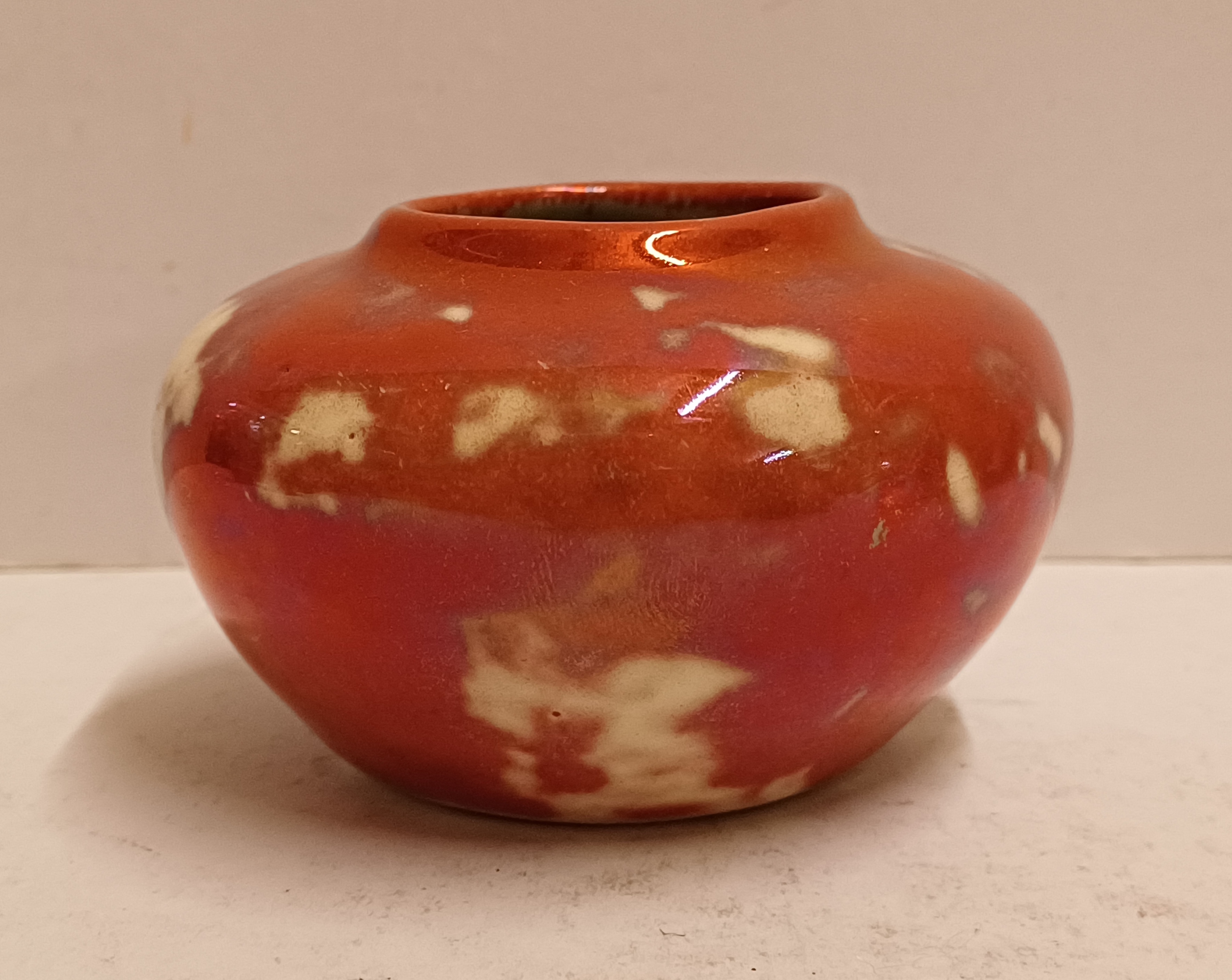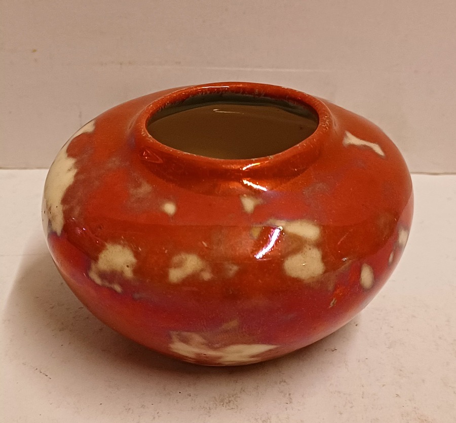 Klein vaasje met rode reflet metalique glazuur. Onderzijde met fabrieksmerk.