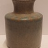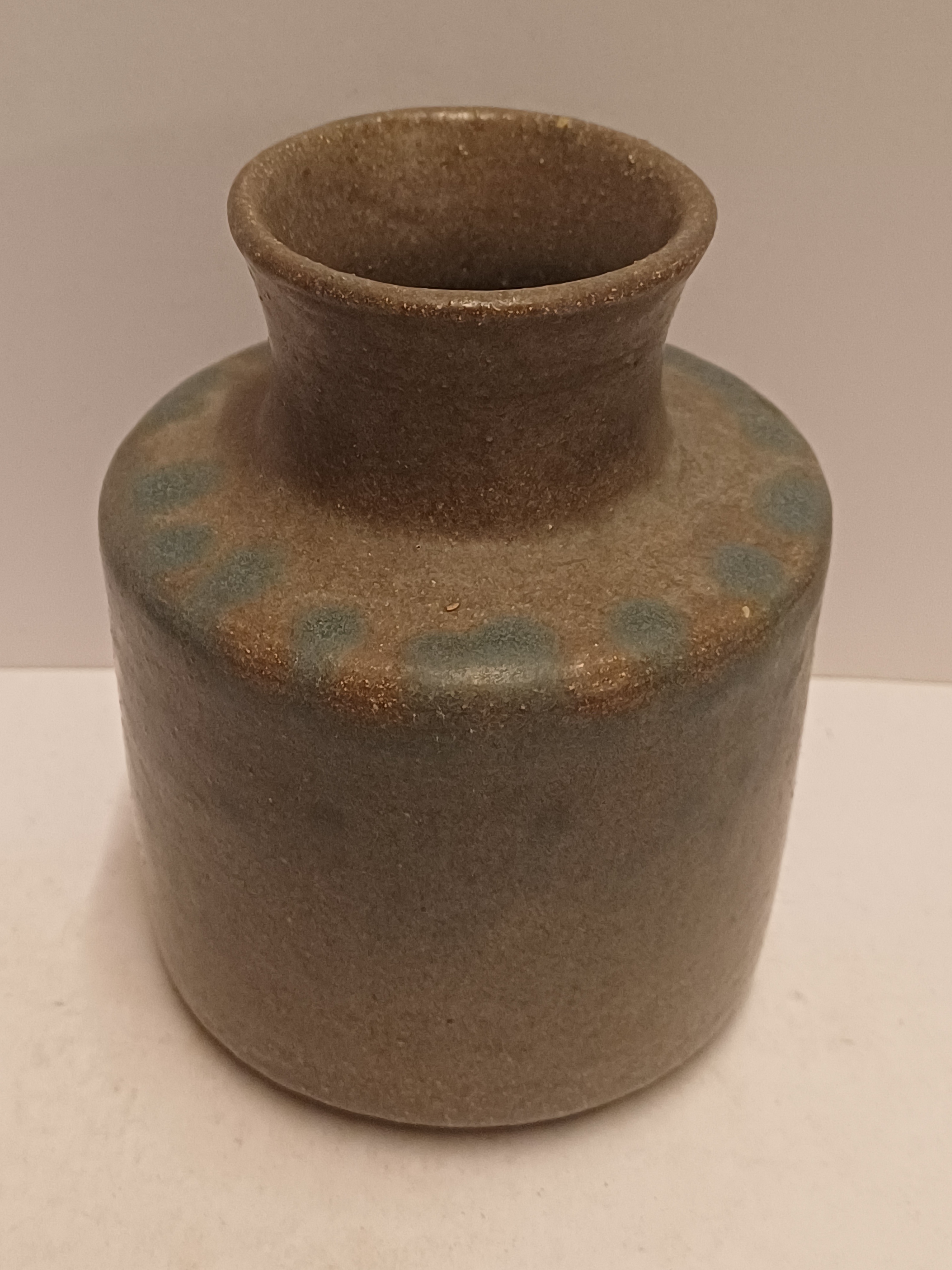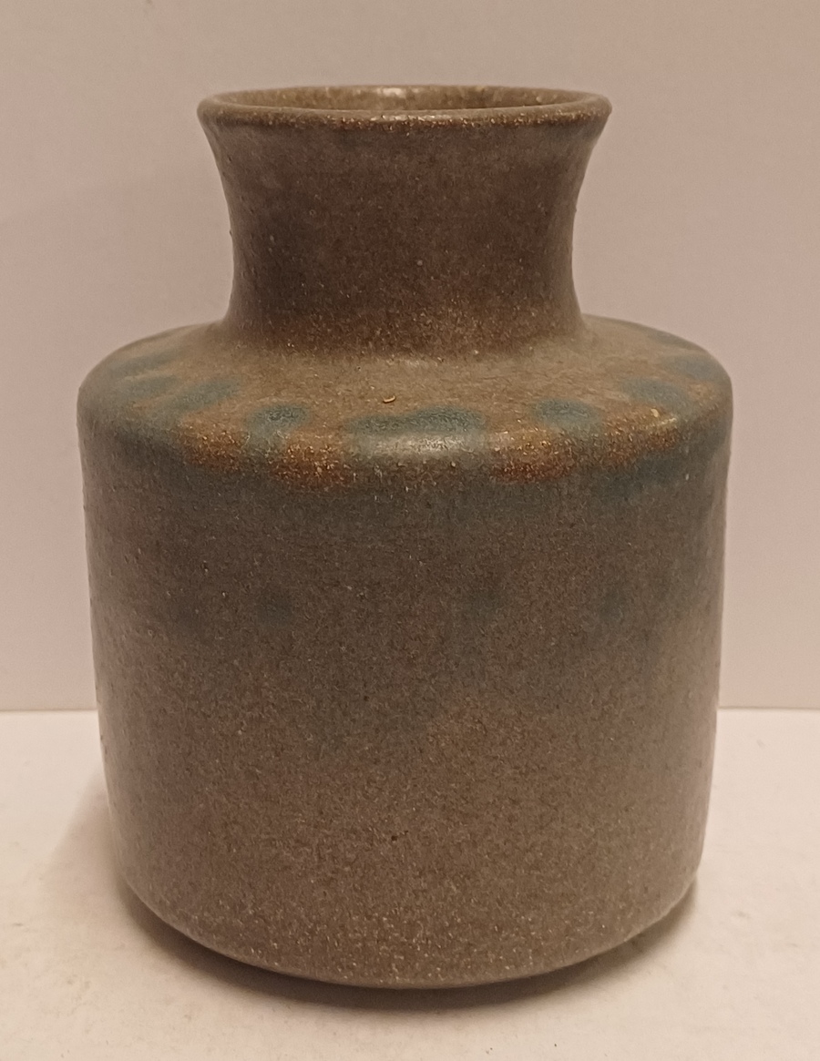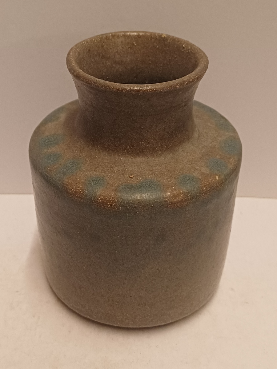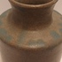 Handgedraaide aardewerken vaas met grijzs groene glazuur en op de schouders blauwe vlekjes. Onderzijde met signatuur